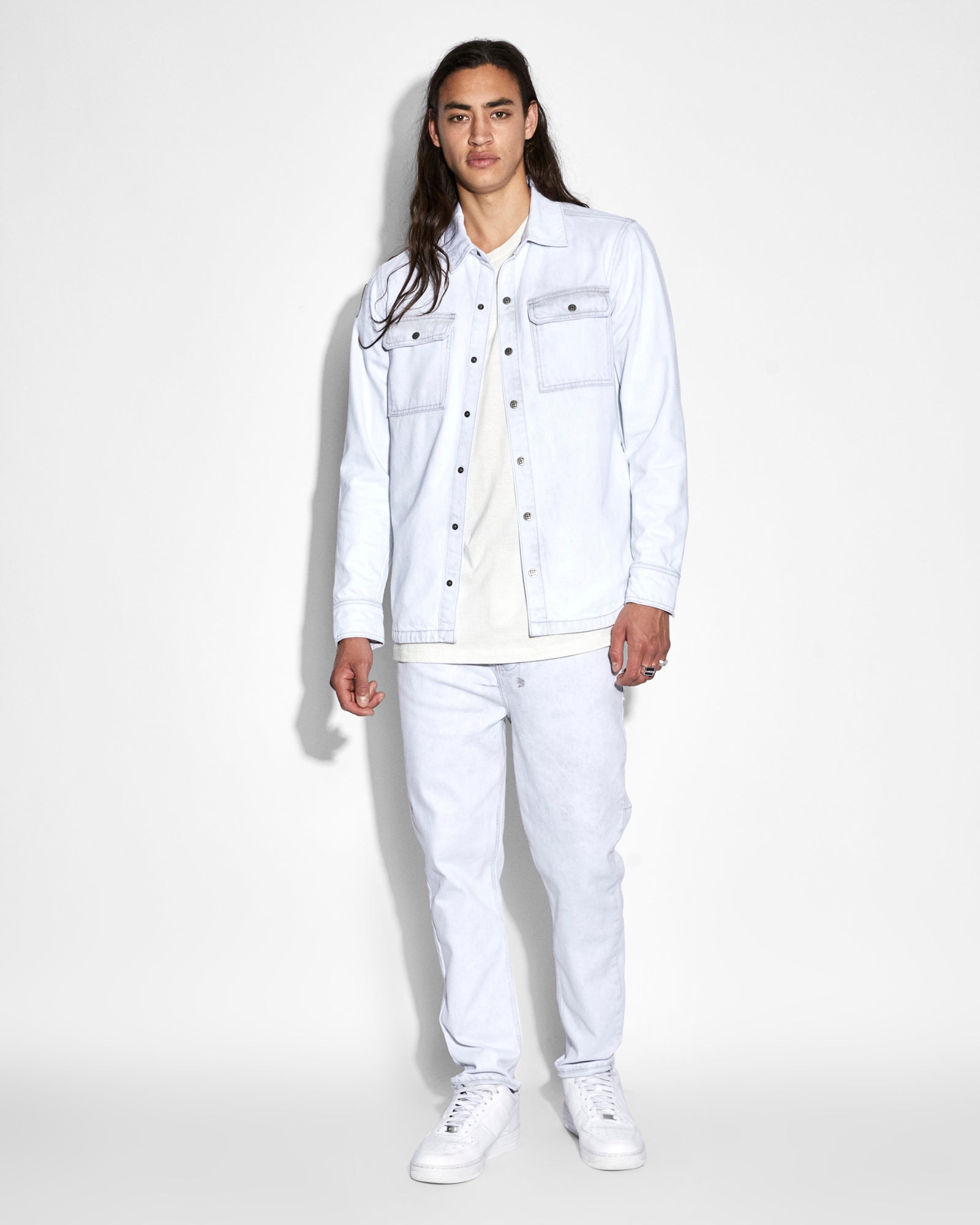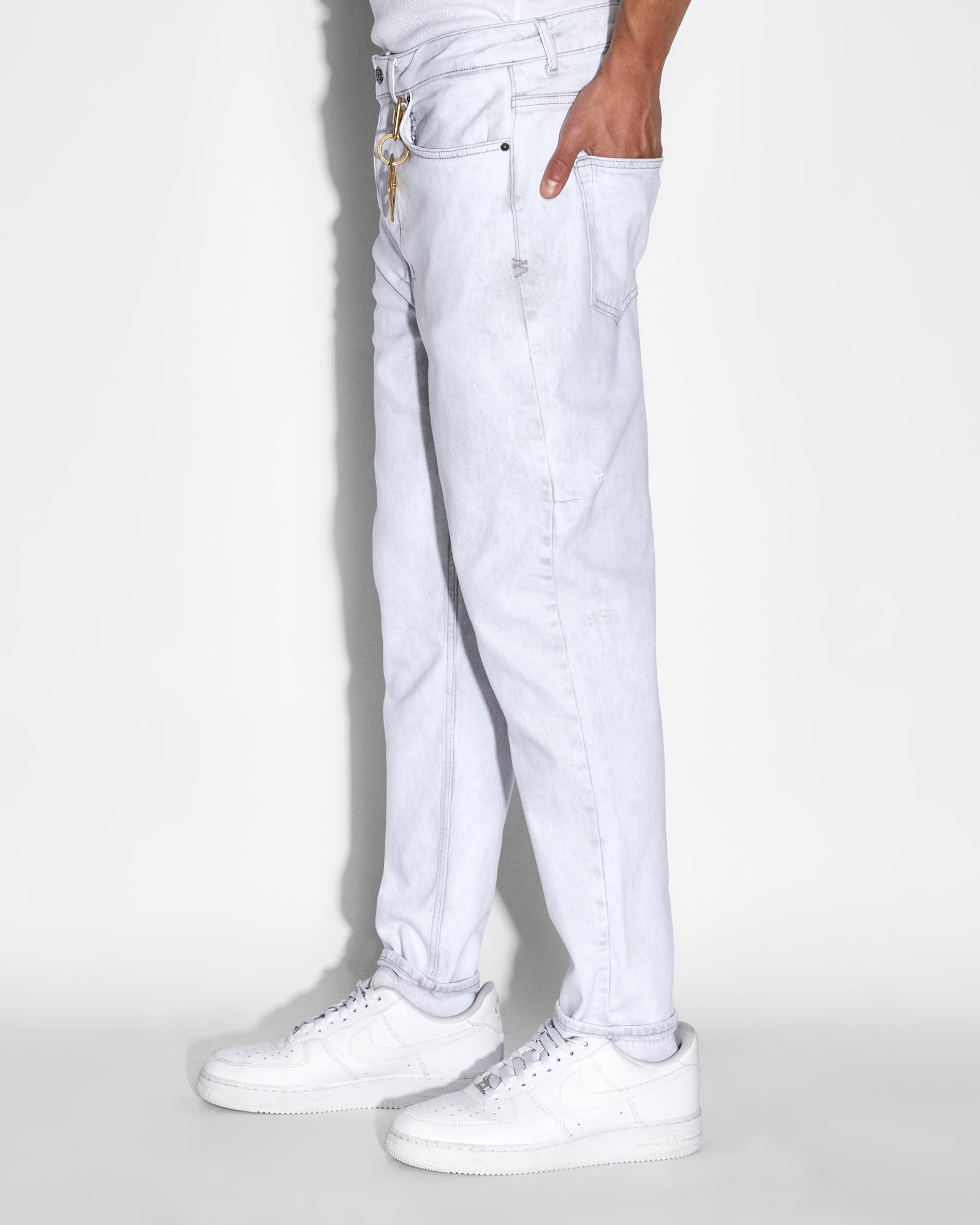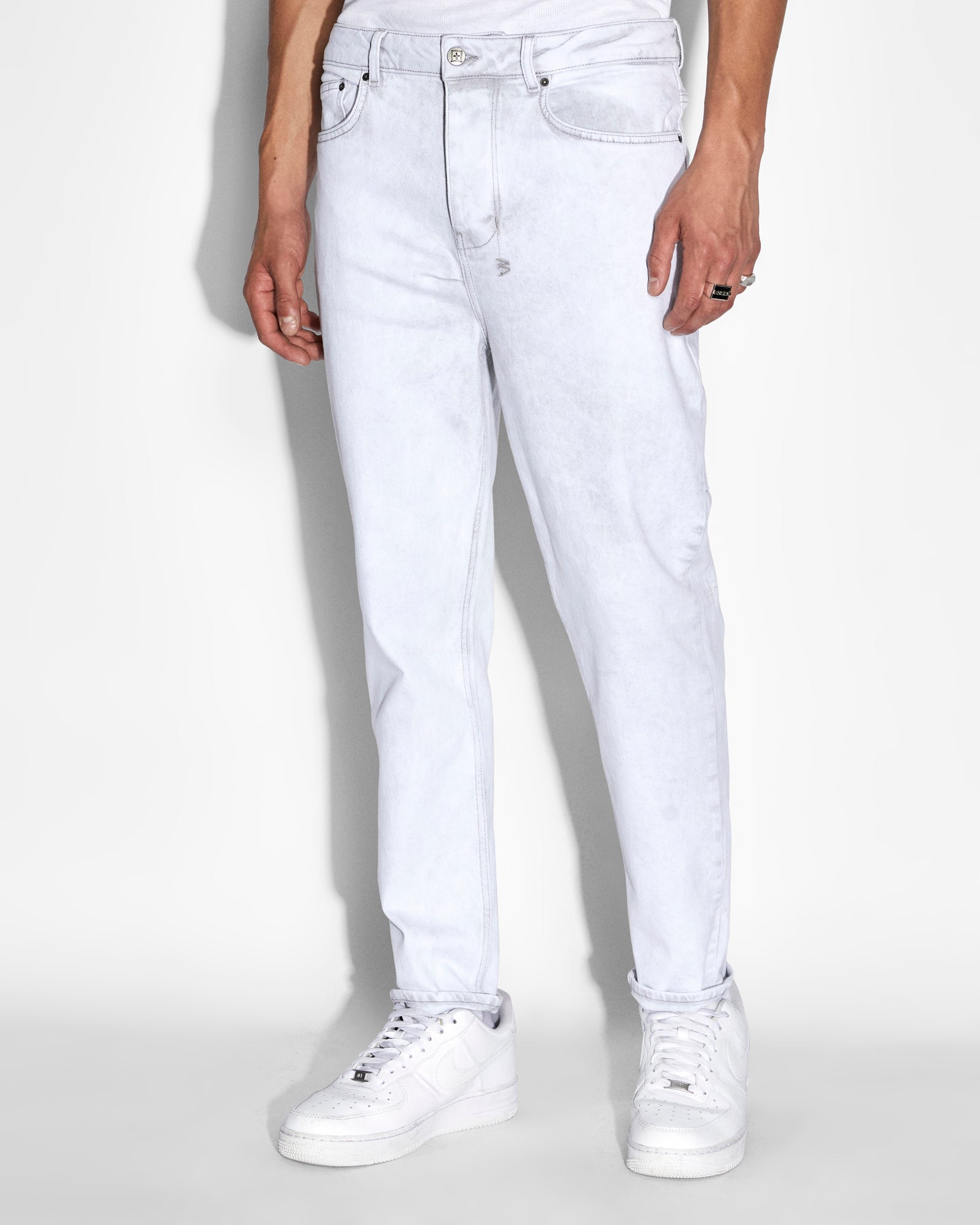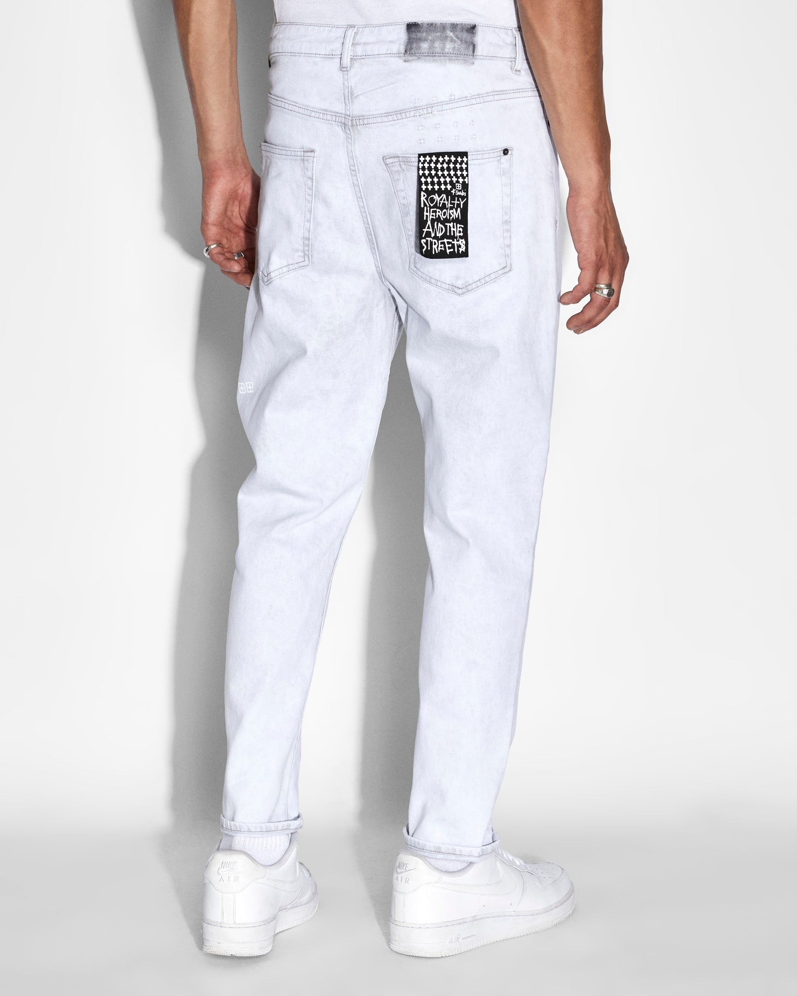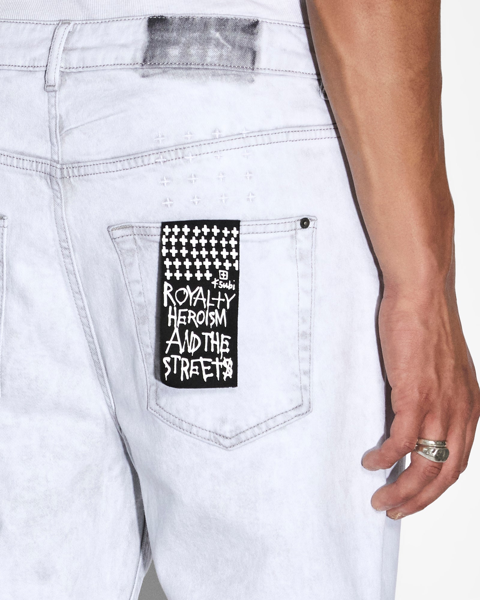 The Bullet Habits is constructed from premium rigid denim in a bone grey wash and features 4x4 cross embroidery on the back and Ksubi t-box print. This style is a full length, relaxed fit jean with wide tapered leg.