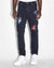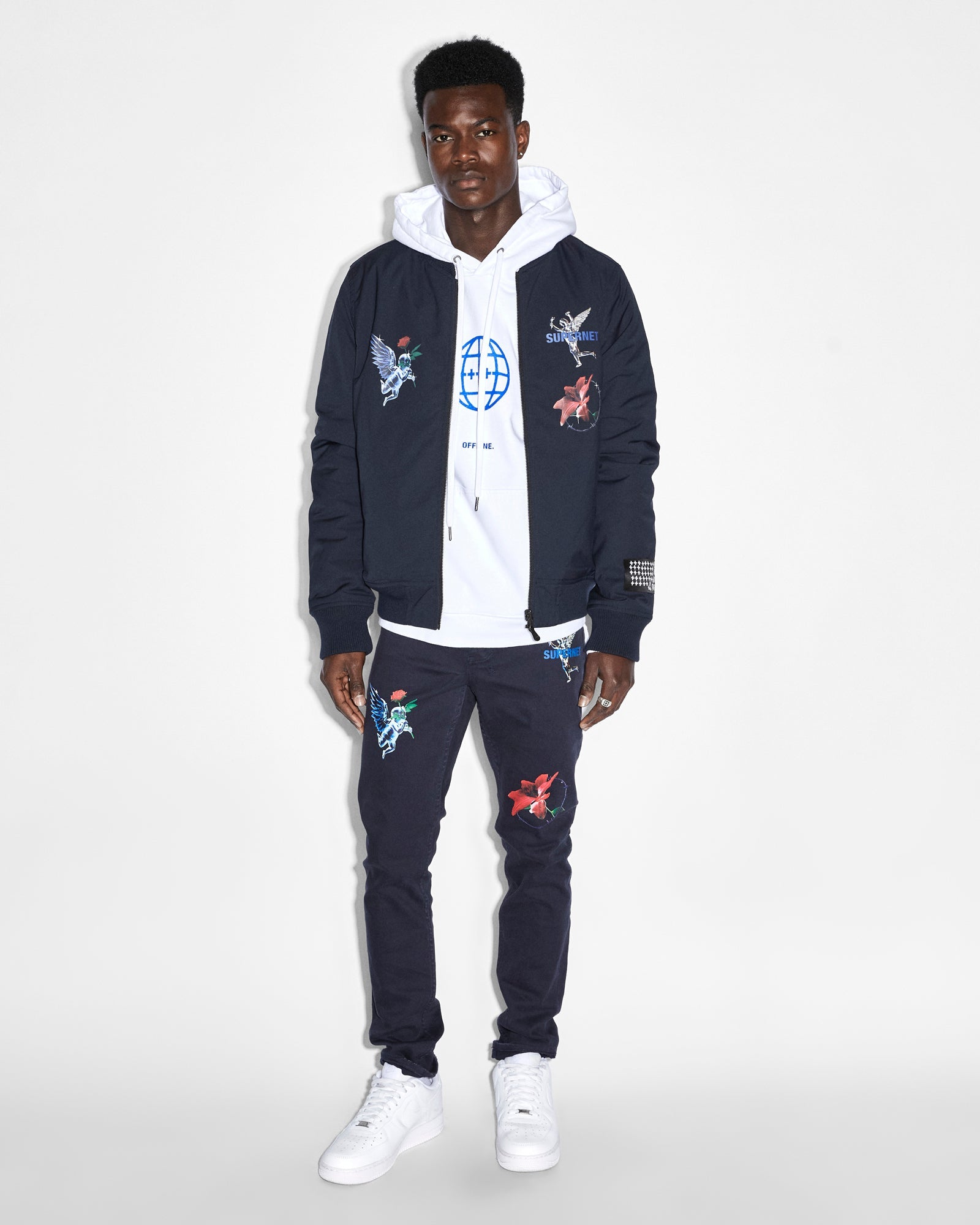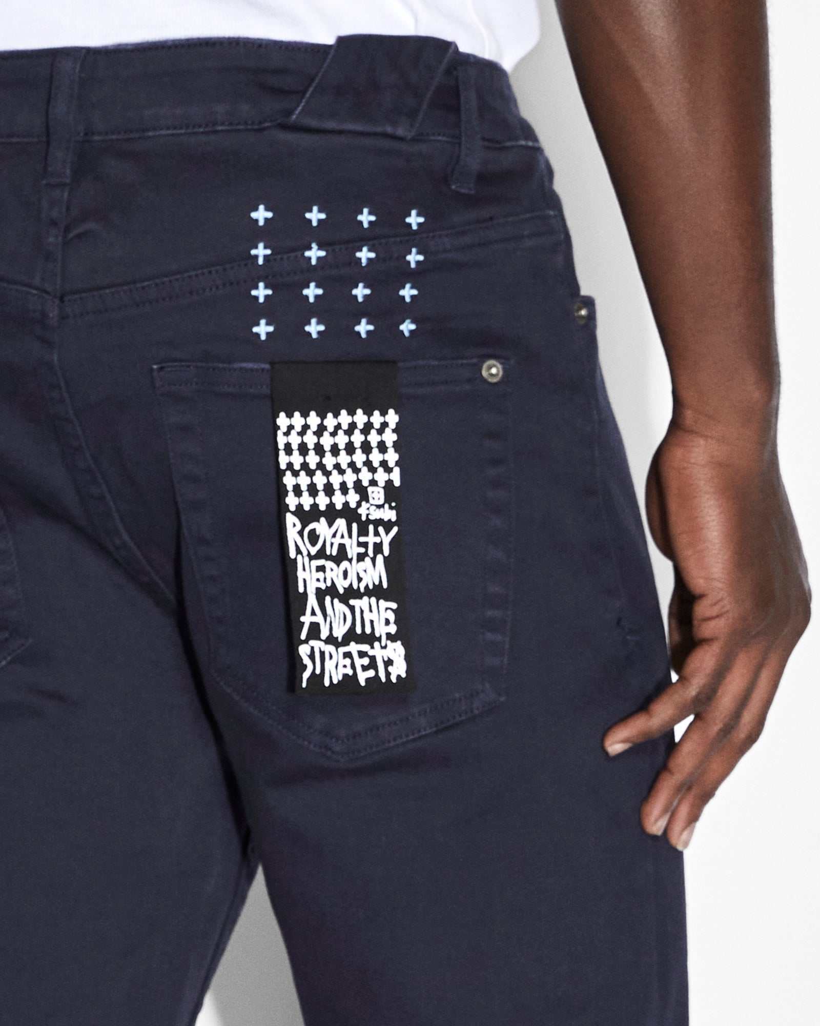 The Chitch Nft Navy is made from premium comfort stretch denim in a navy colourway with a dutch belt tab. This mid rise style is a slim tapered cut jean featuring classic five pocket styling and multiple printed artworks on the front. Signed off with our signature Ksubi branding.