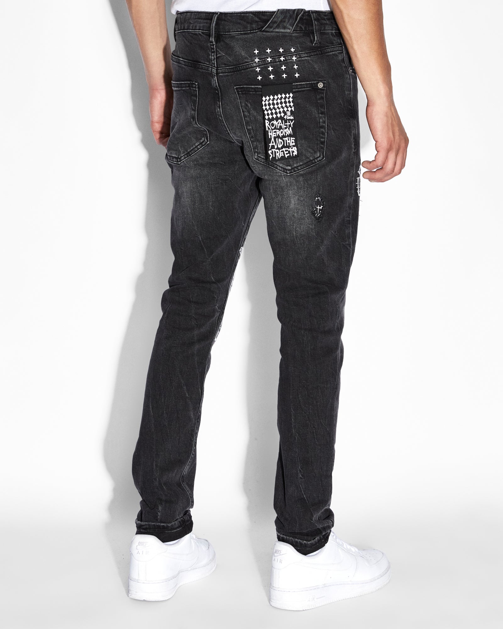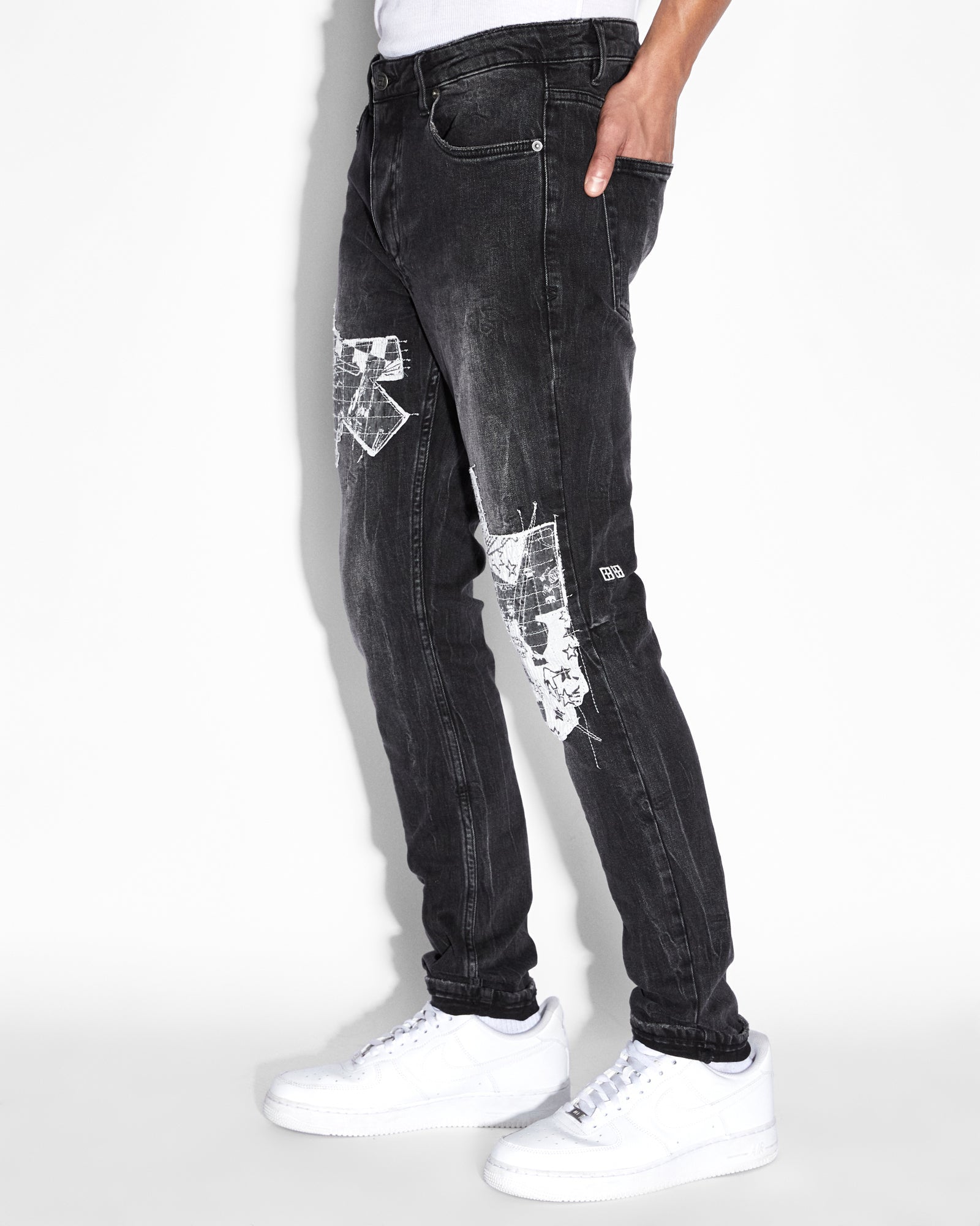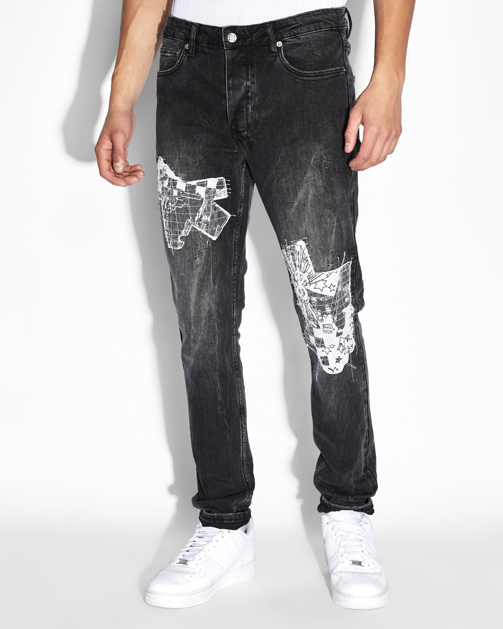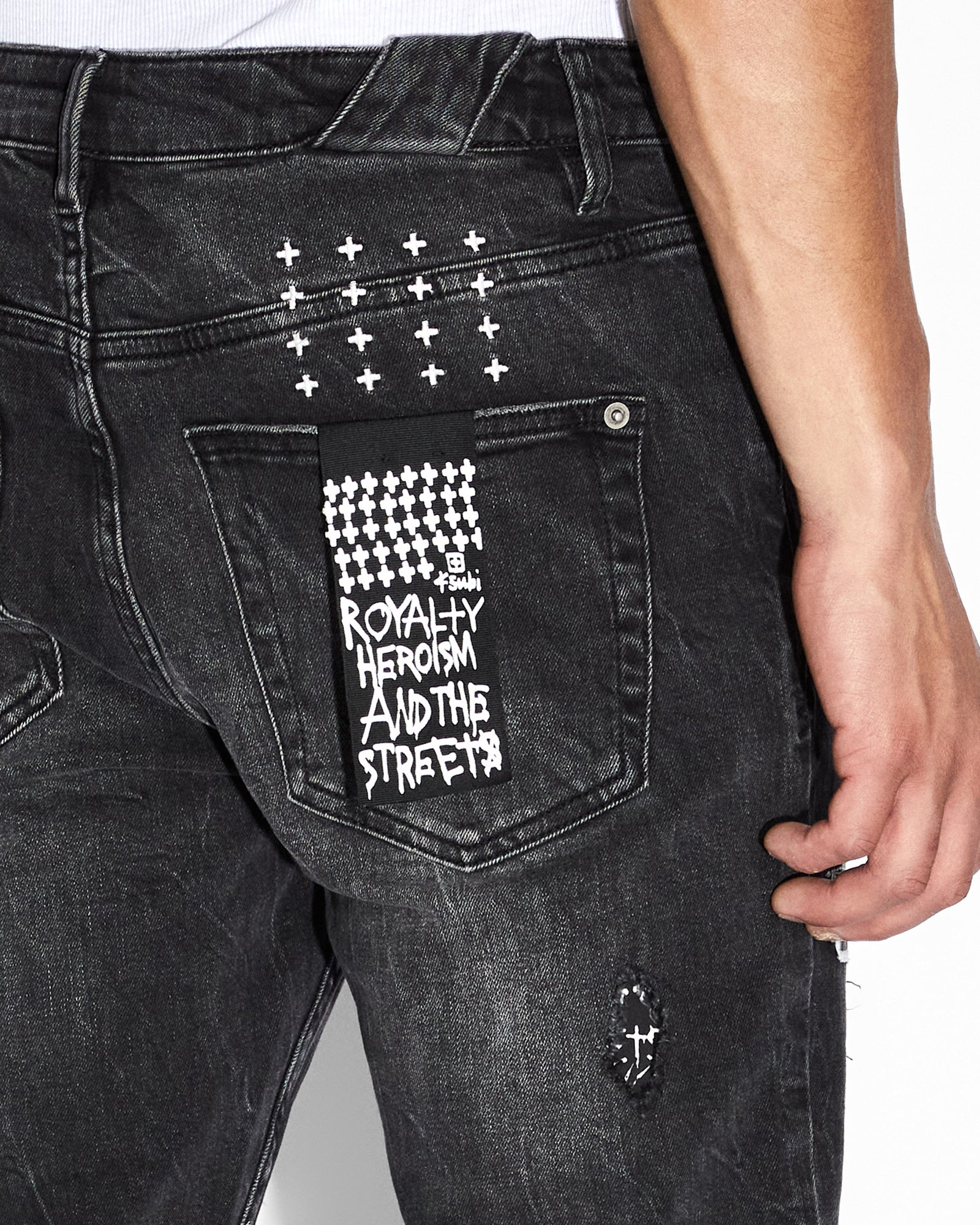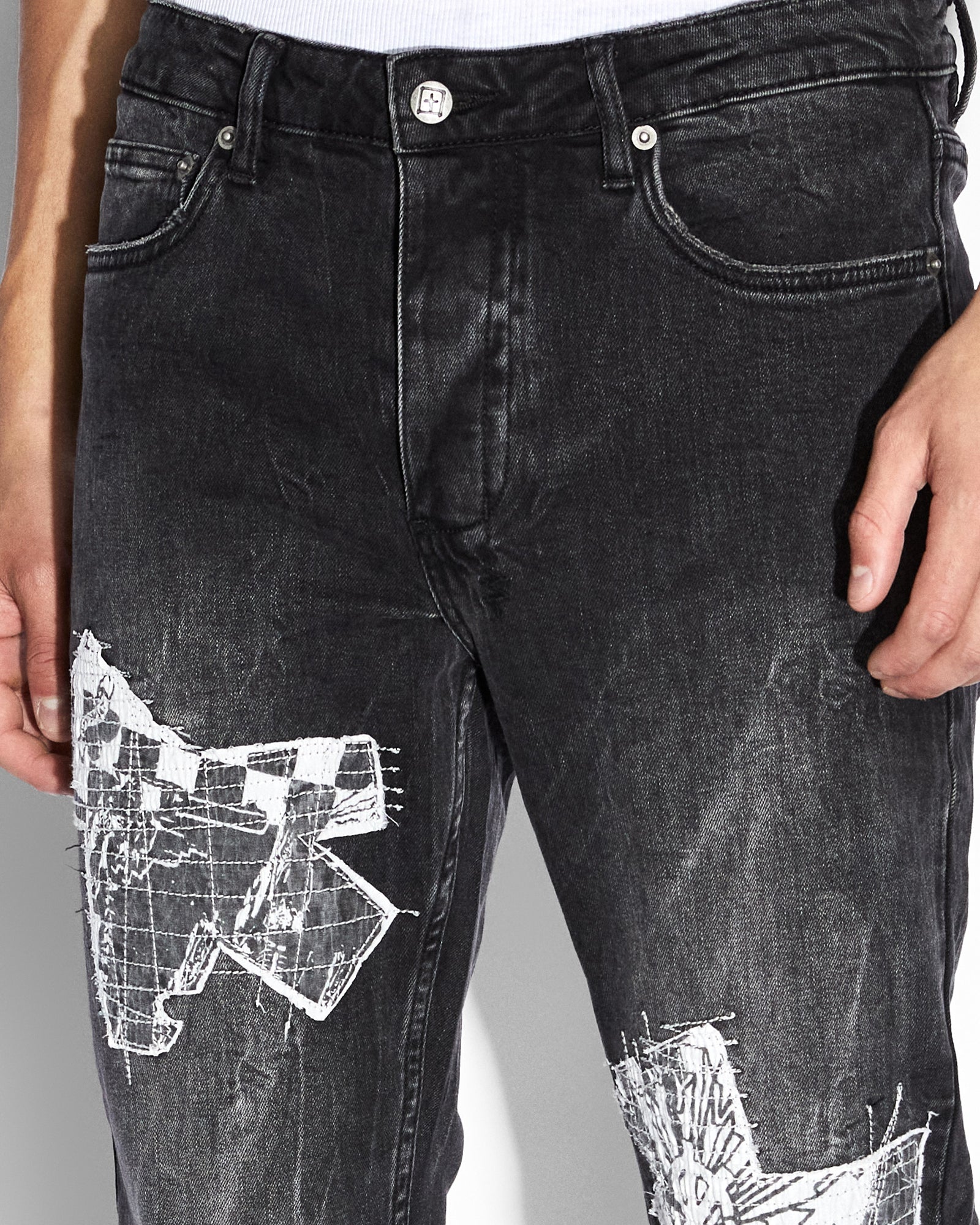 The Chitch Streets is finished with front topstitched patchwork details and our iconic Ksubi branding. This slim tapered, mid rise jean is made from premium comfort stretch denim in a smoky black vintage faded wash and designed with five pockets, a button fly and unique Ksubi angled dutch tab and tucks. Wear with the 'Oh G Jacket Streets' for a denim on denim look.