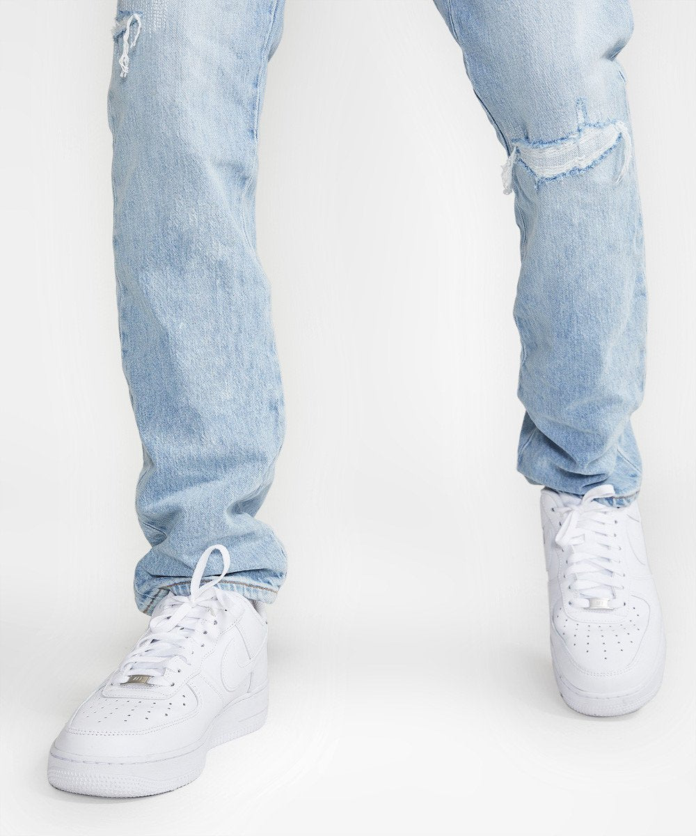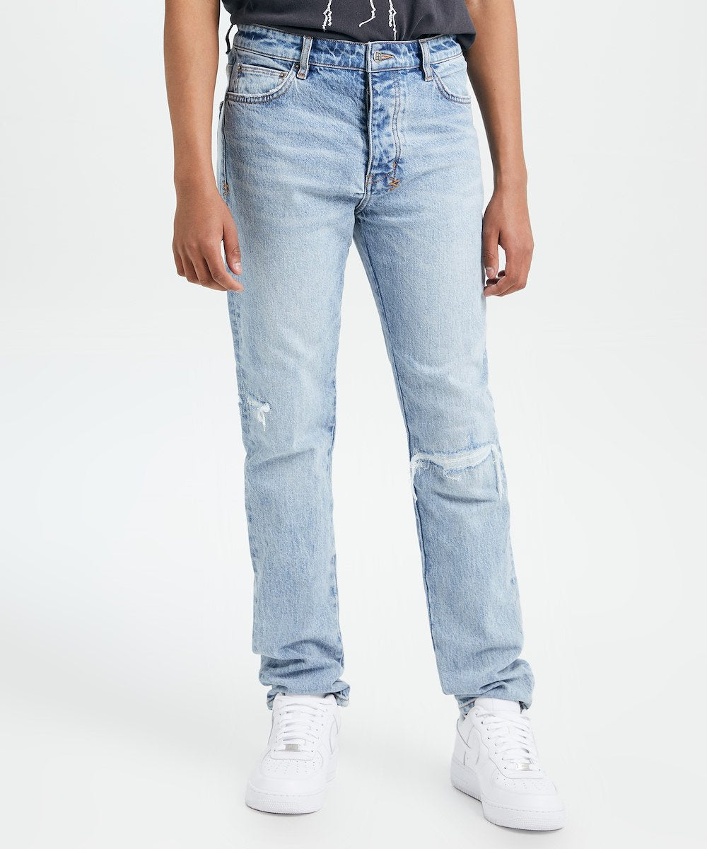 The Chitch jean is a contemporary style jean in a tapered leg, constructed in premium stretch denim. In a mid rise, it features faint trashing at the knees, branded hardware, five pockets, and Ksubi cross embroidery at the reverse.