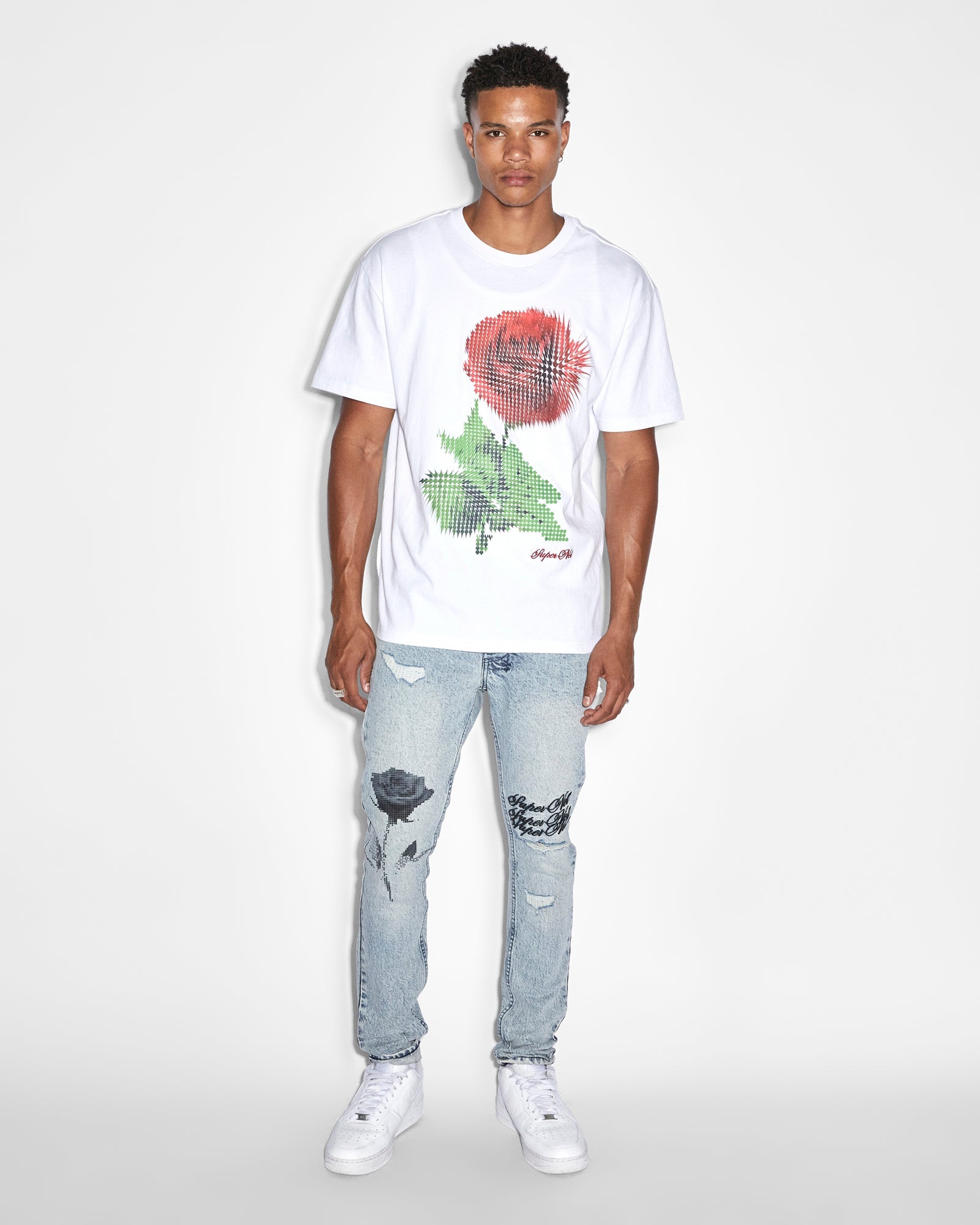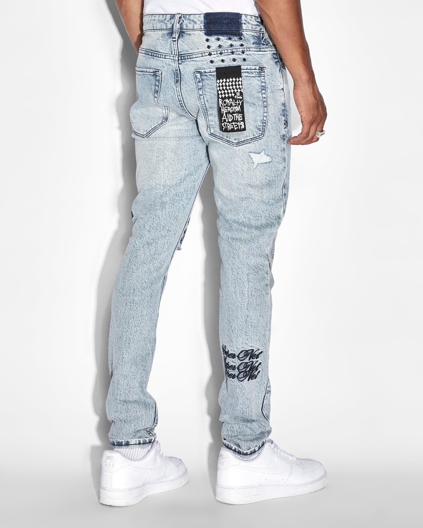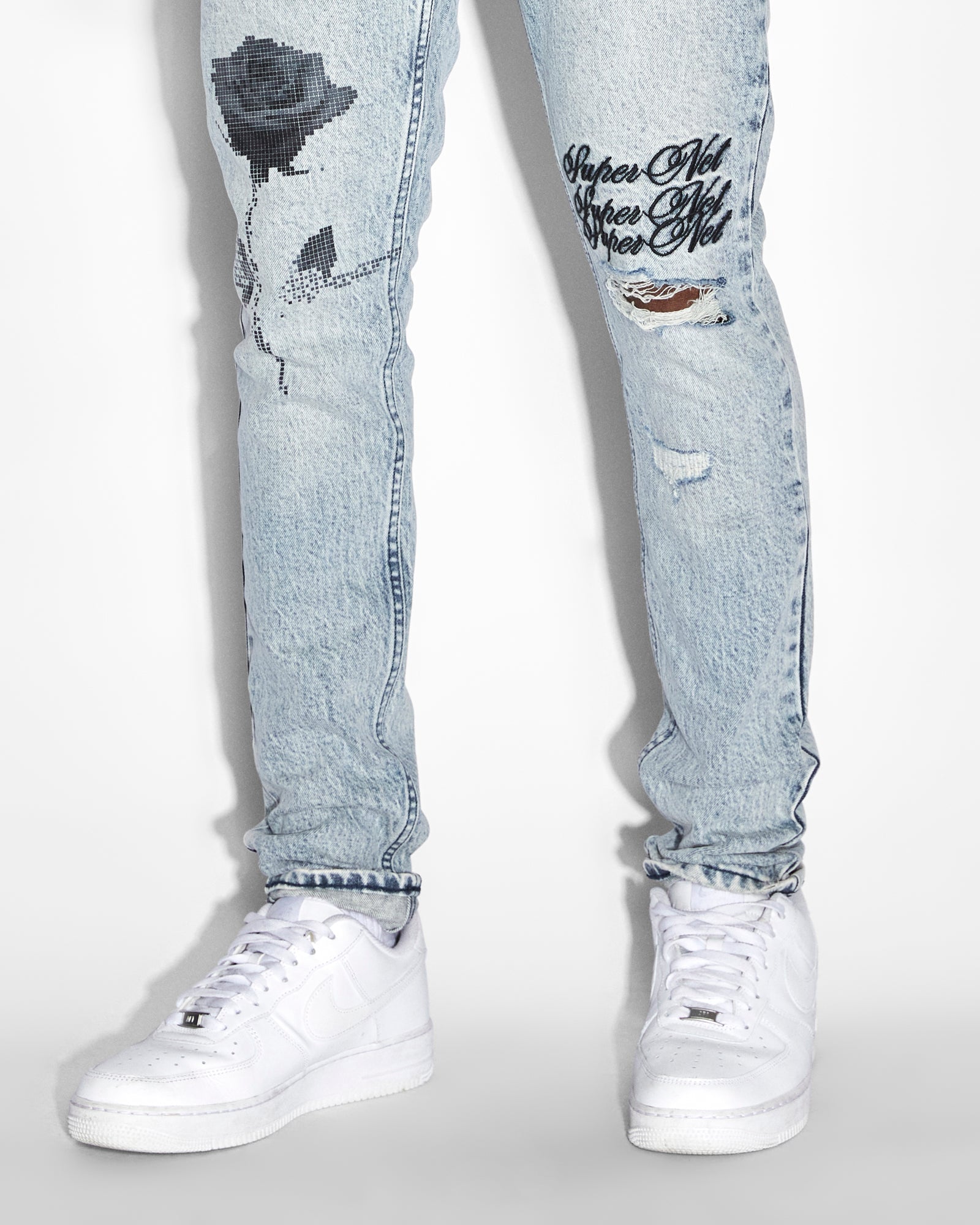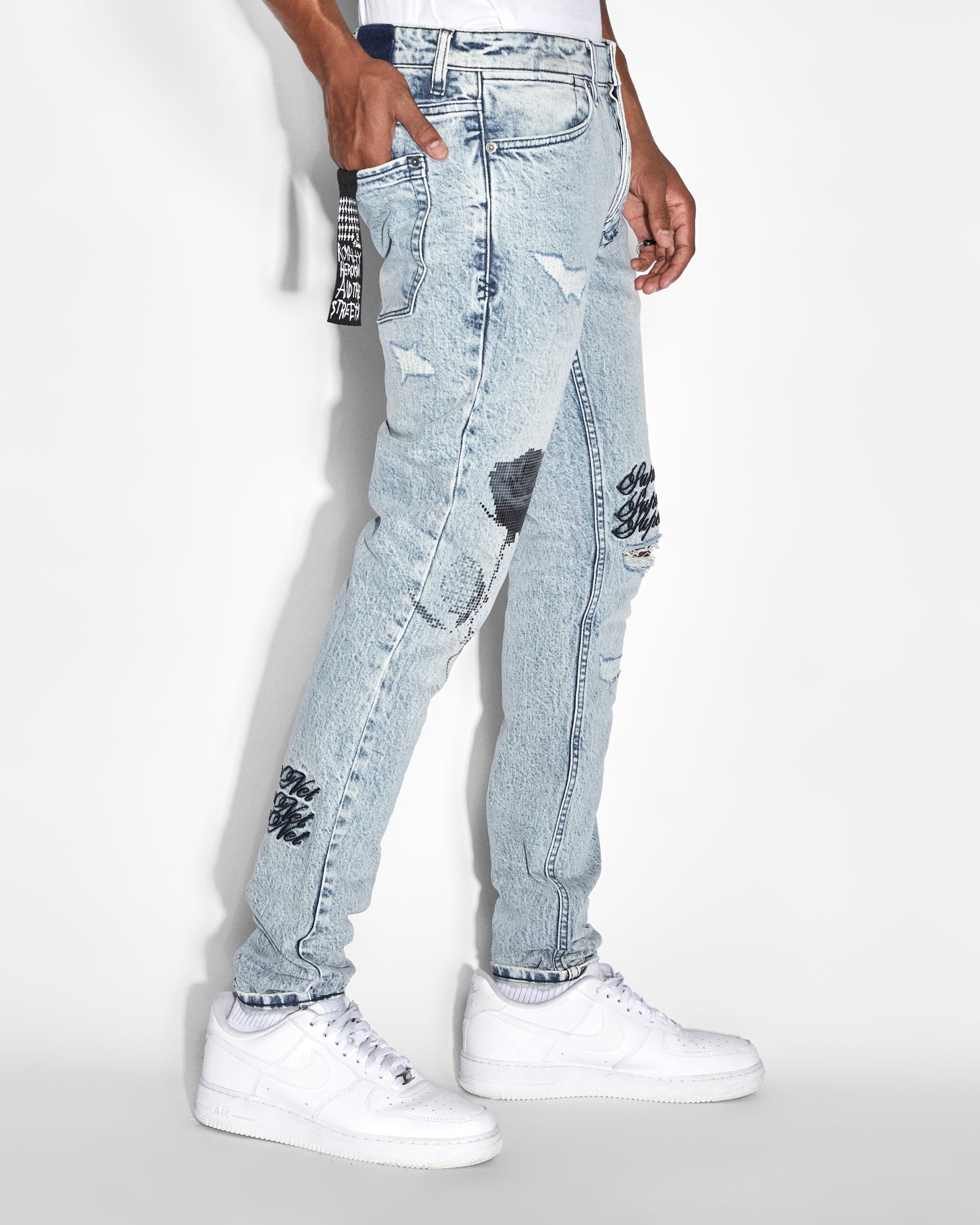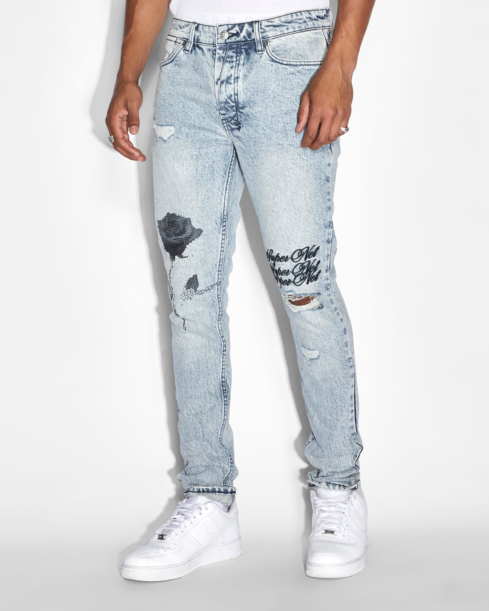The Van Winkle Pixel Oktane is a light washed, skinny fit jean featuring embroidered and printed artwork, rip and repair patchwork details and a light grinding effect. Constructed from premium comfort stretch denim, this style is designed with a mid rise waist, classic five pocket detailing, angled belt loops and zigzag bartack side seams and fly. Finished off with fly stitch detail and our signature Ksubi branding.