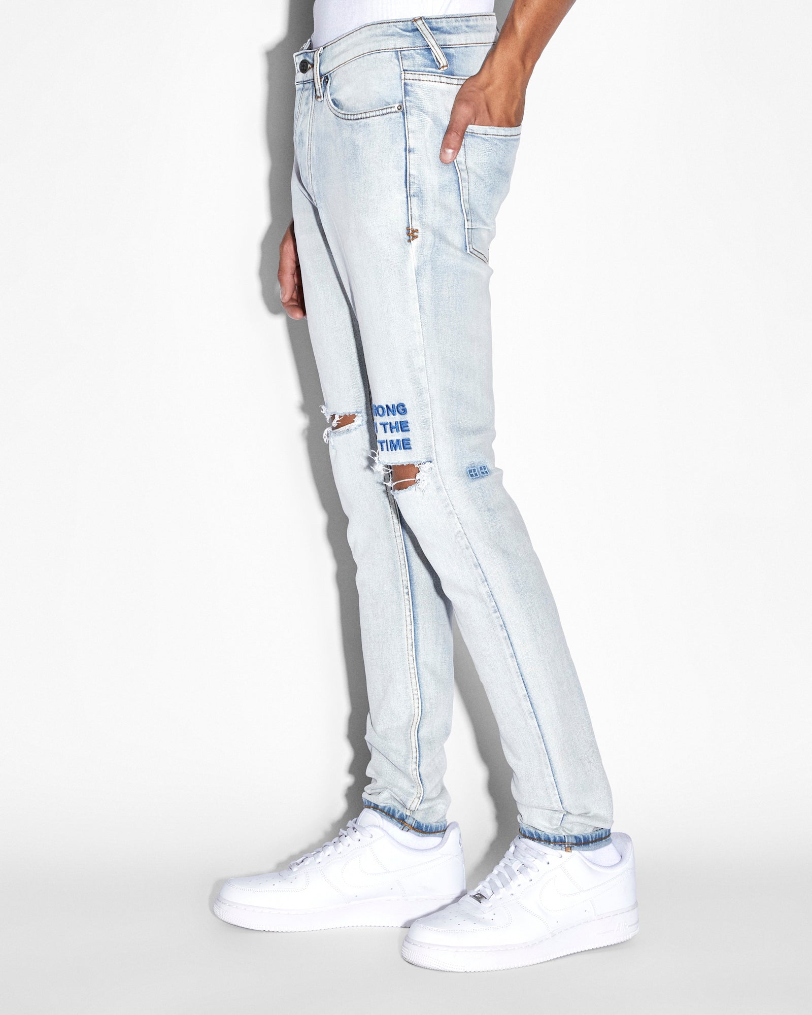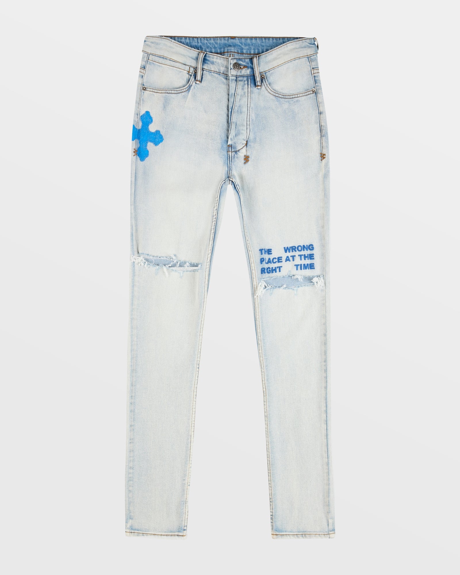 The Van Winkle Right Time is constructed from comfort stretch denim in a light bleach wash. This is a skinny fit jean with a mid rise, five pockets, a button fly and angled belt loops. Features screen print on the front and back and embroidery artwork and finished with ghost patching signature t-box and 4x4 embroidery and Ksubi branded hardware.