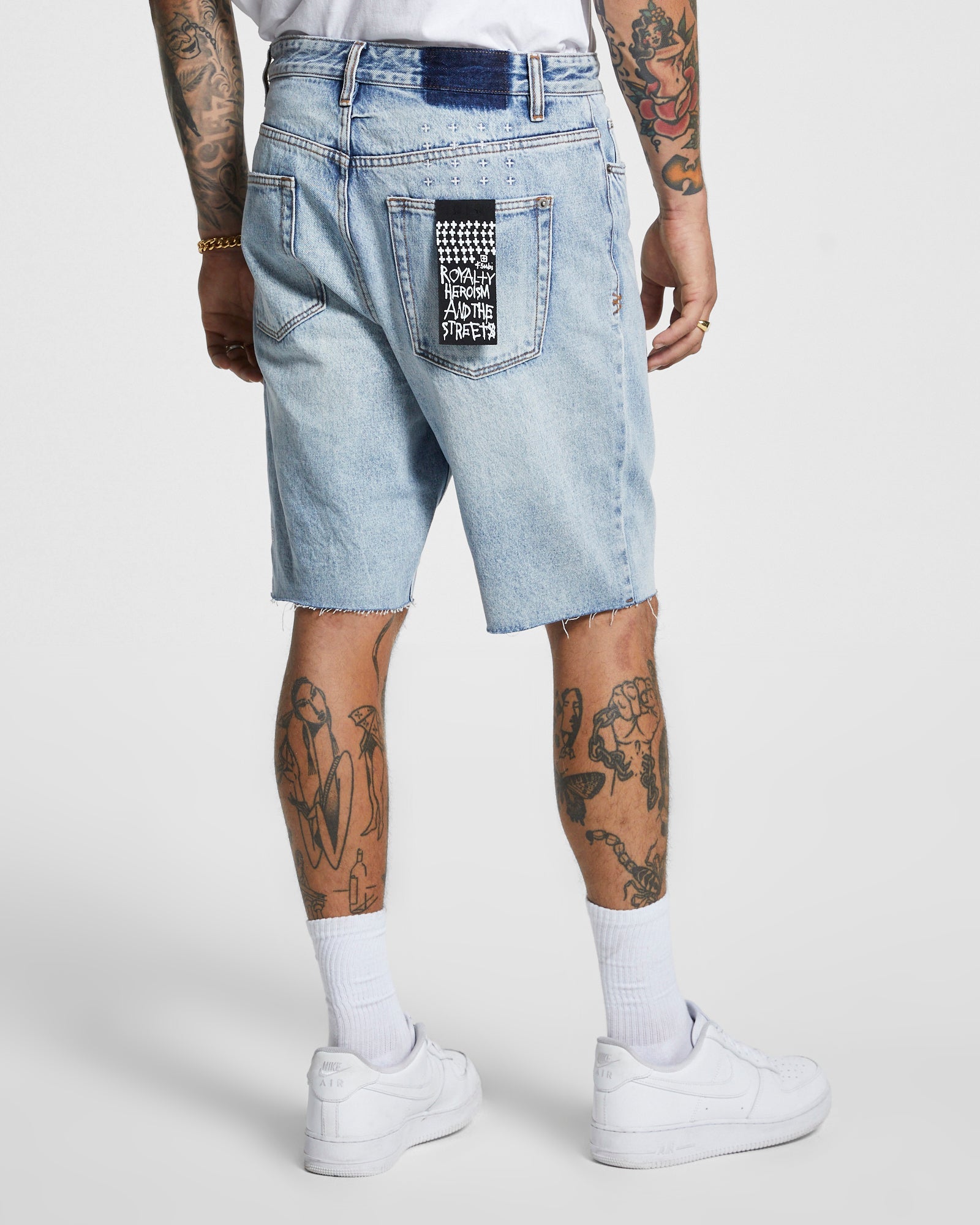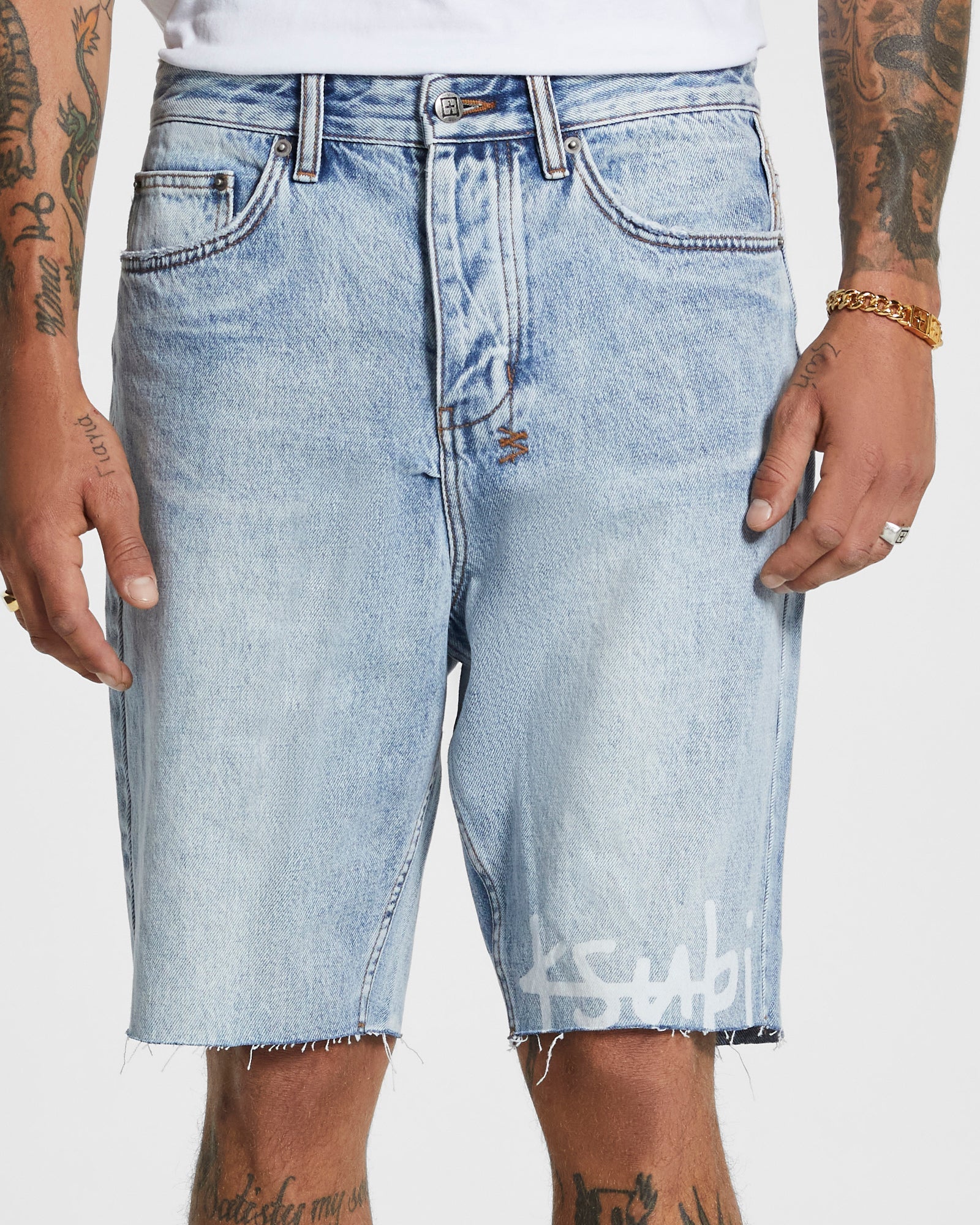 The Wolf Short 1999 City High is made from premium rigid denim in vintage indigo with stonewash and subtle contrast wear. This relaxed fit walkshorts have a relaxed tapered leg, longer rise, back discharge print, tobacco topstitching, raw hem, light grinding, back 4x4 cross embroidery, Ksubi t-box print and branded hardware.