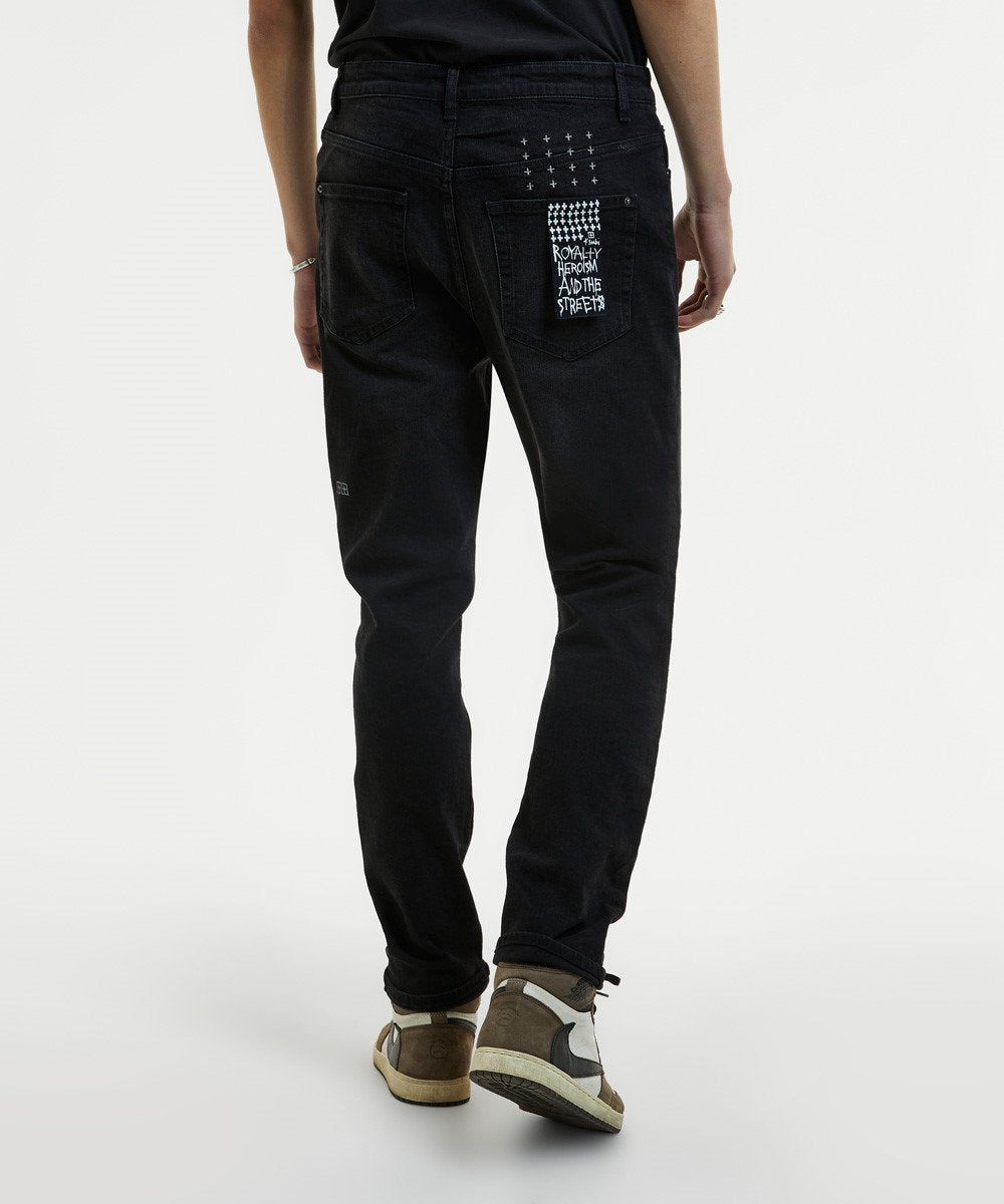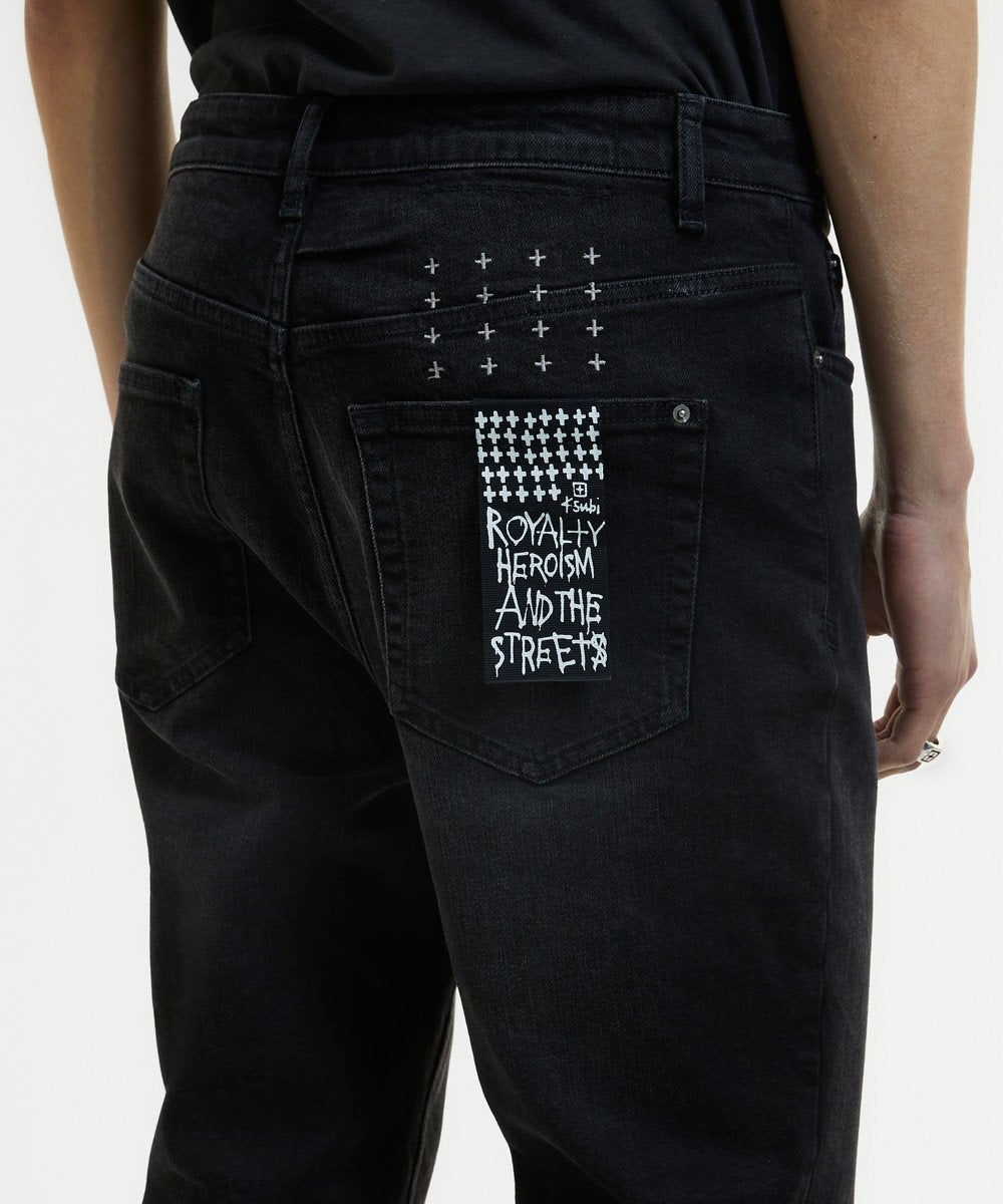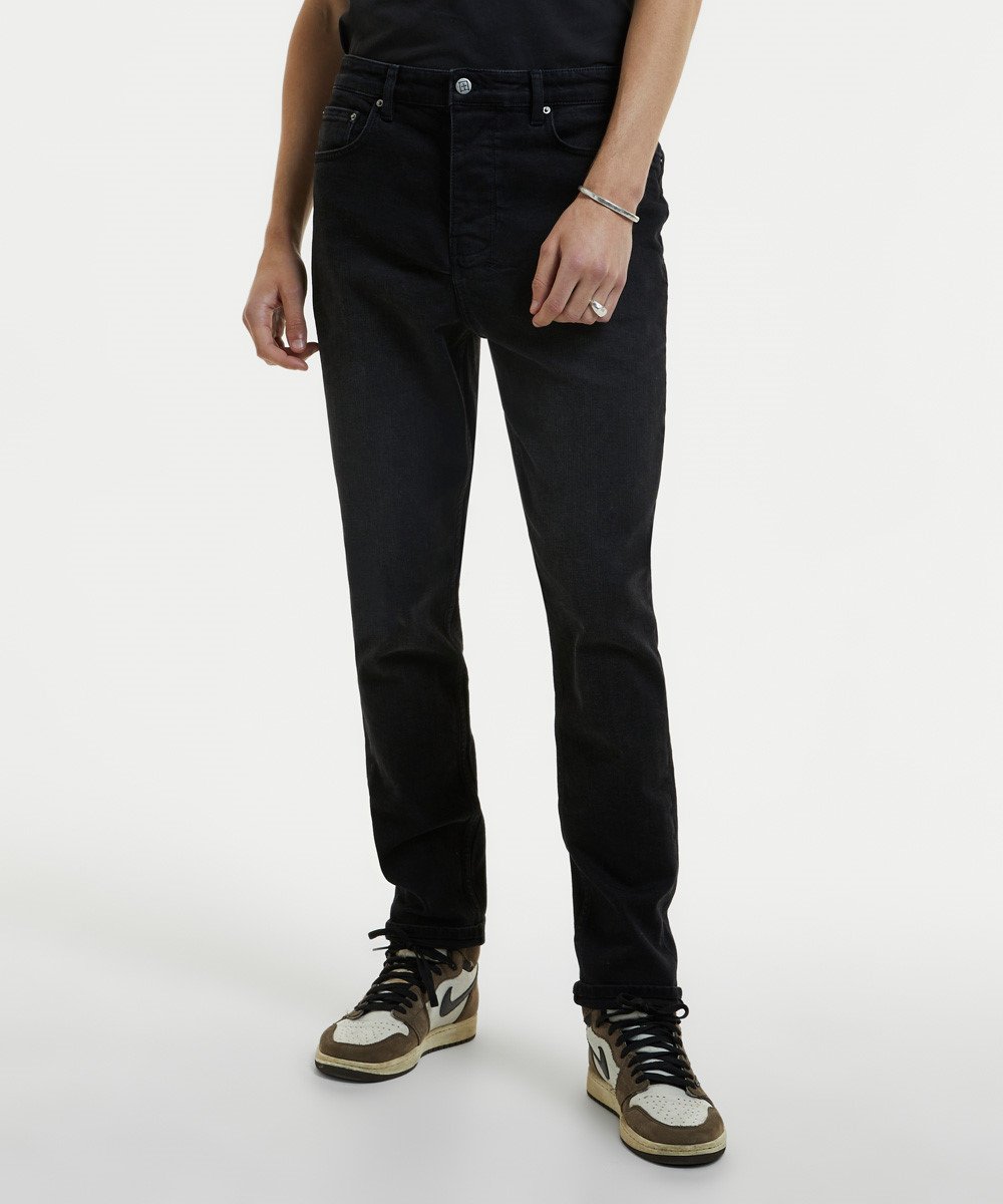 The Wolfgang Krow Black is a slim tapered denim jean with a mid-long rise. Made from quality Turkish comfort stretch cotton denim in a dusted black wash colourway. This style features signature Ksubi branding and removable pocket tag.