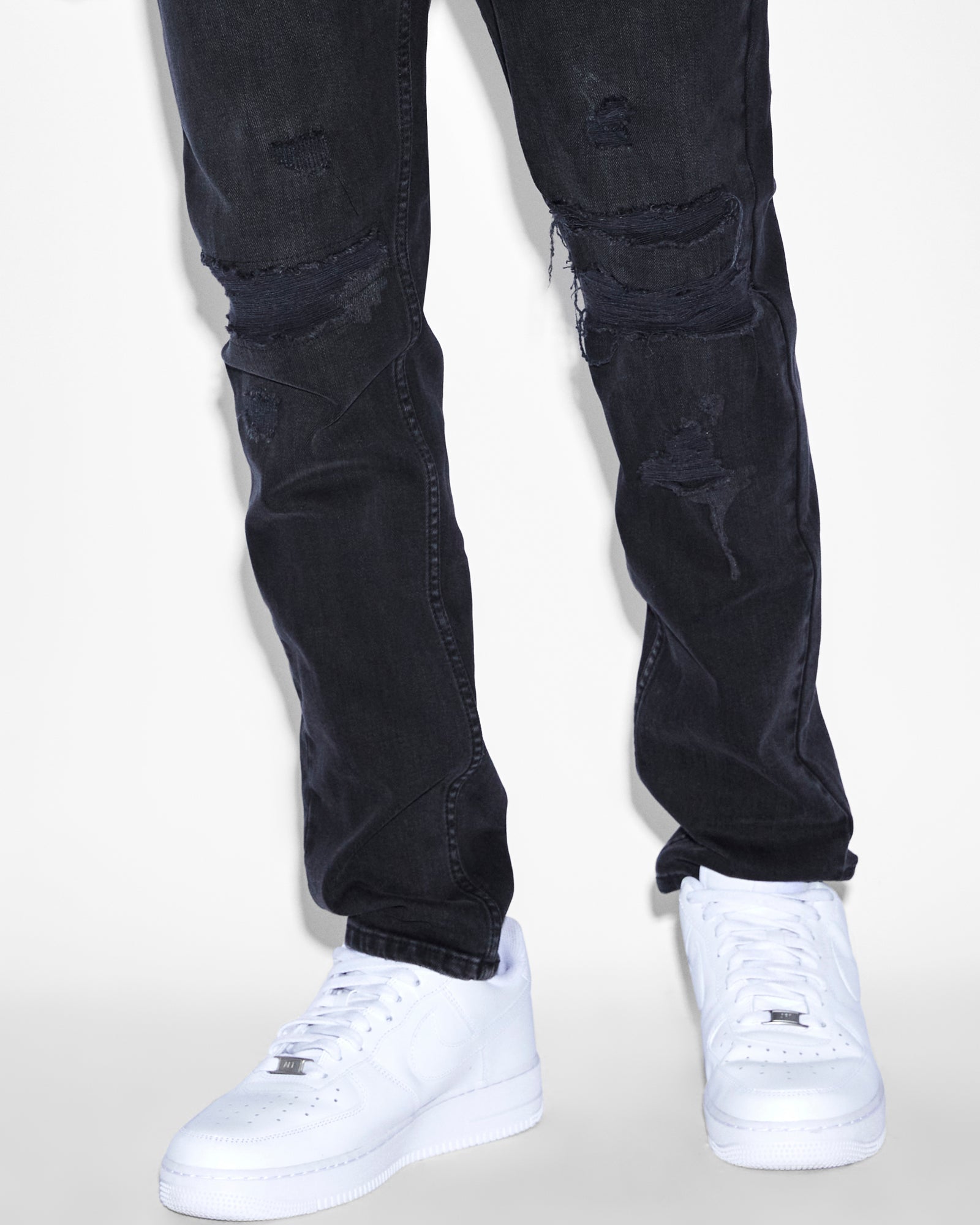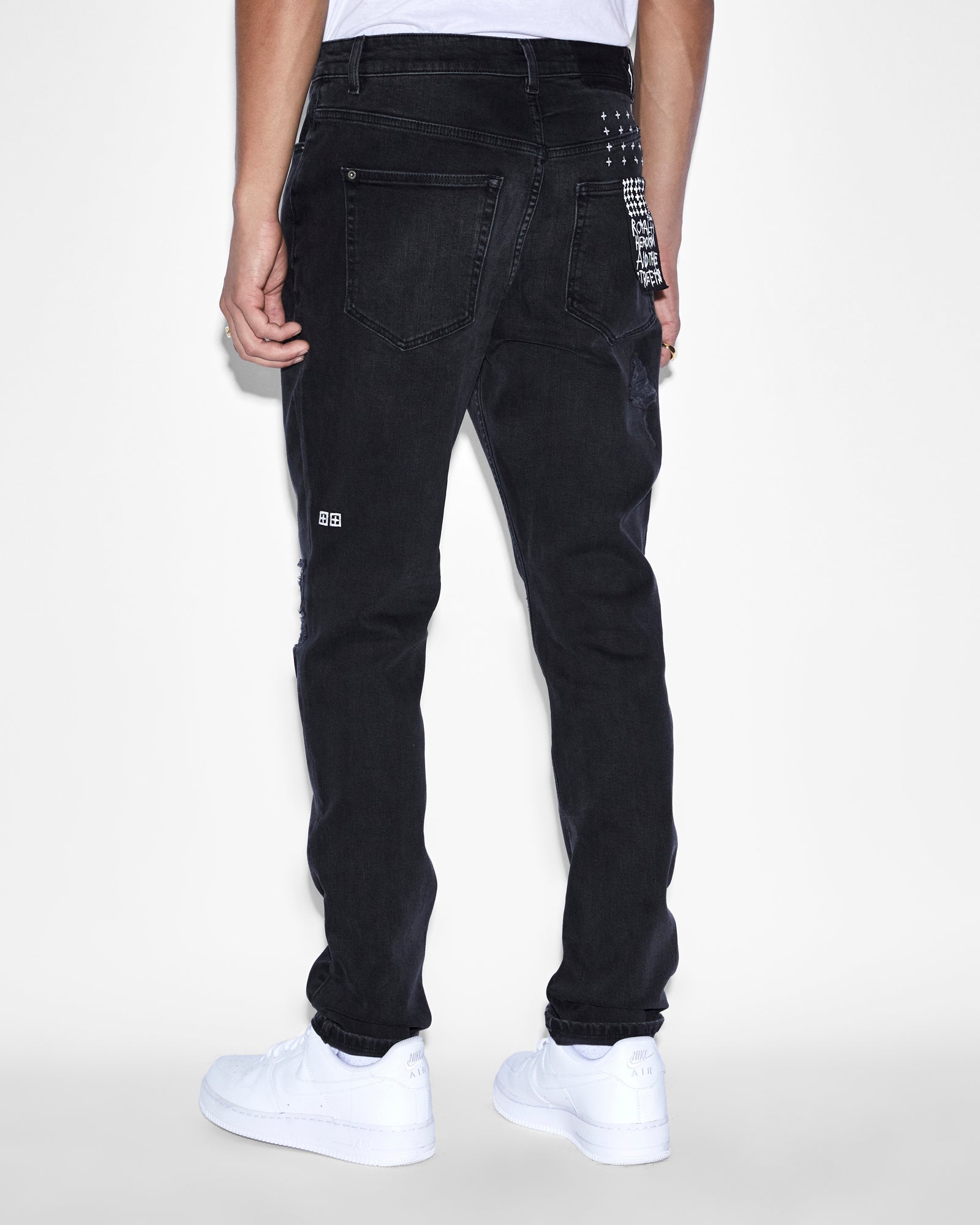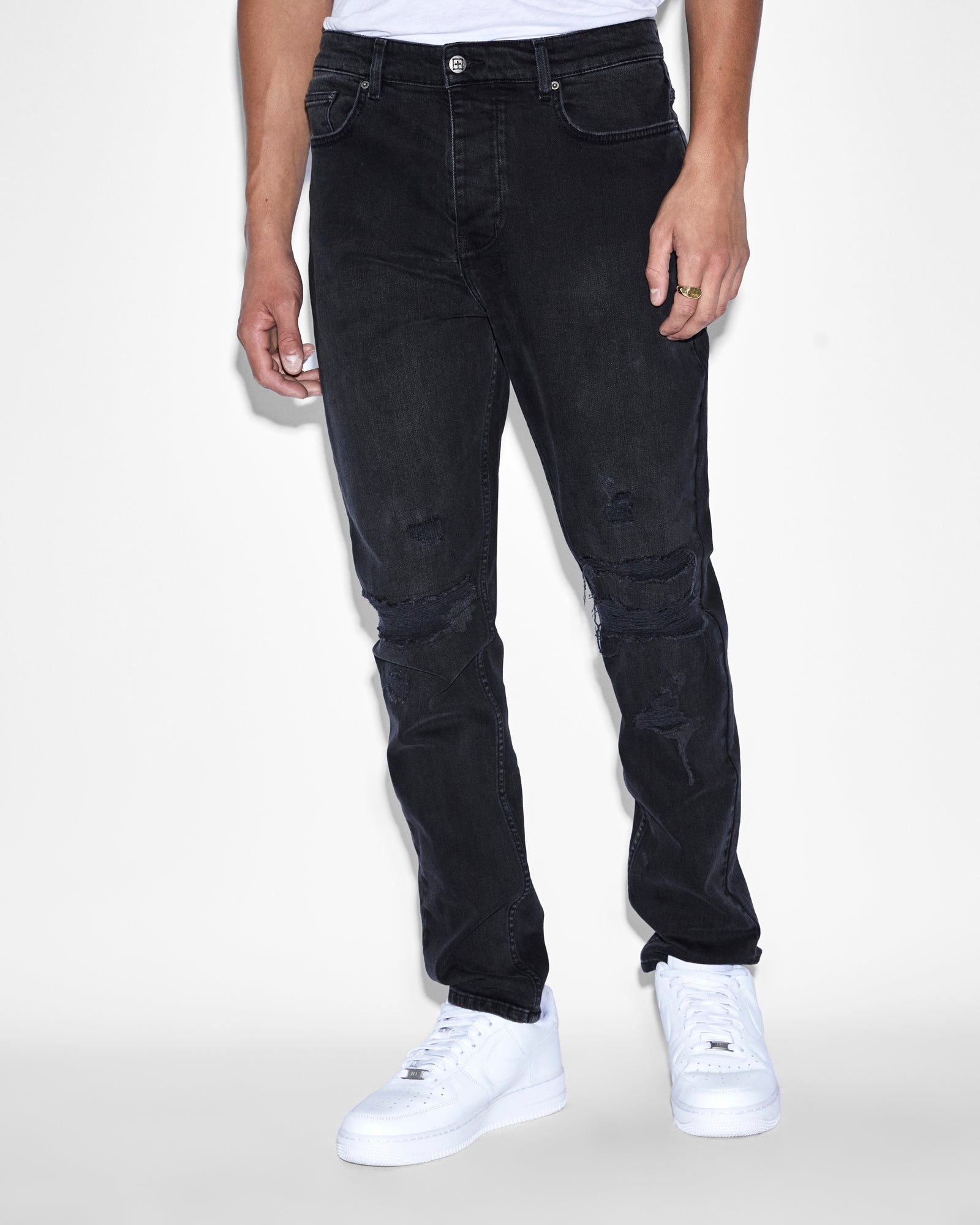 The Wolfgang Stitches Black is designed with front heavy ripping and repair deconstruction details, light grinding and Ksubi branding. This is a mid-long rise, slim tapered jeans made from premium European comfort stretch denim in a faded black wash.