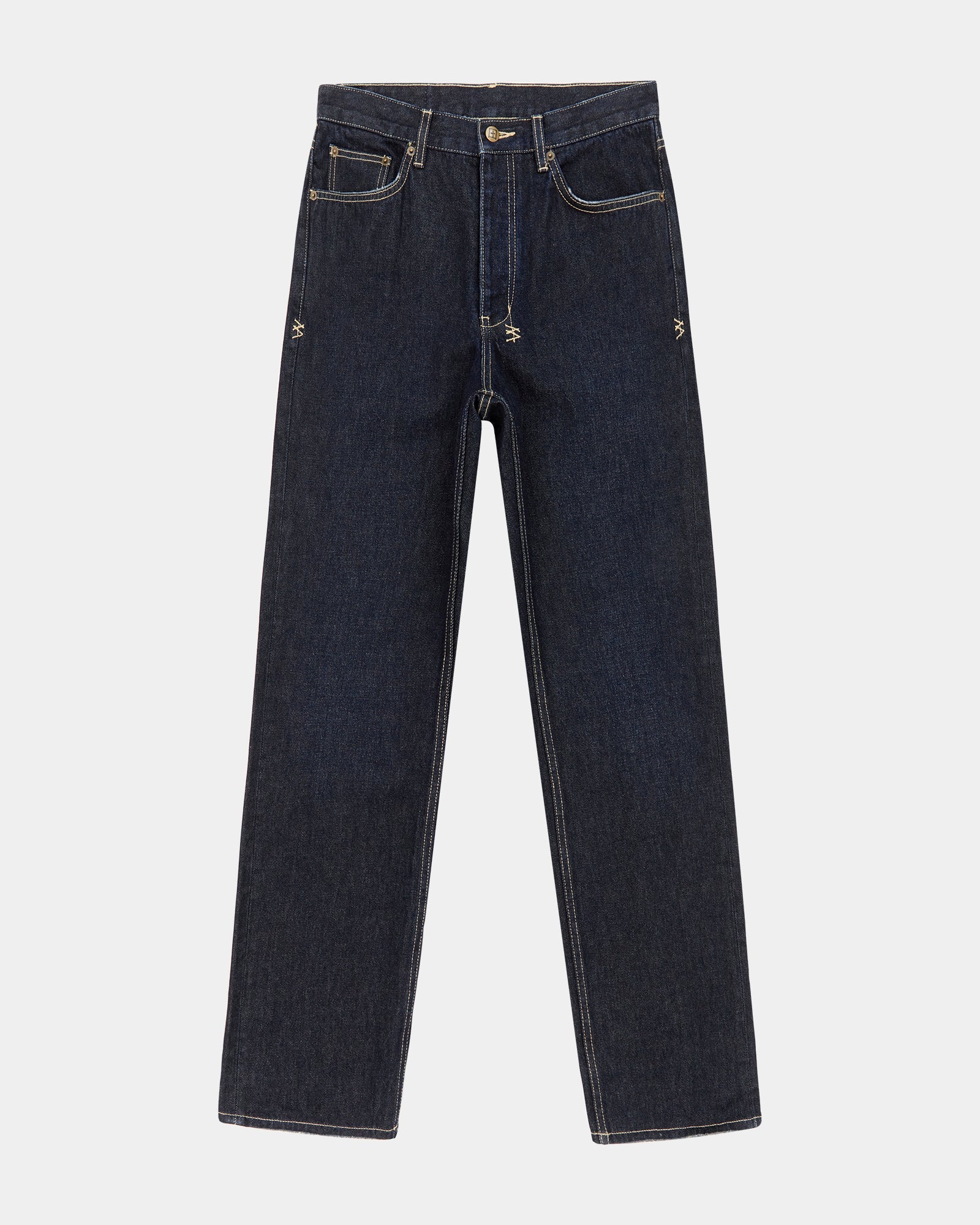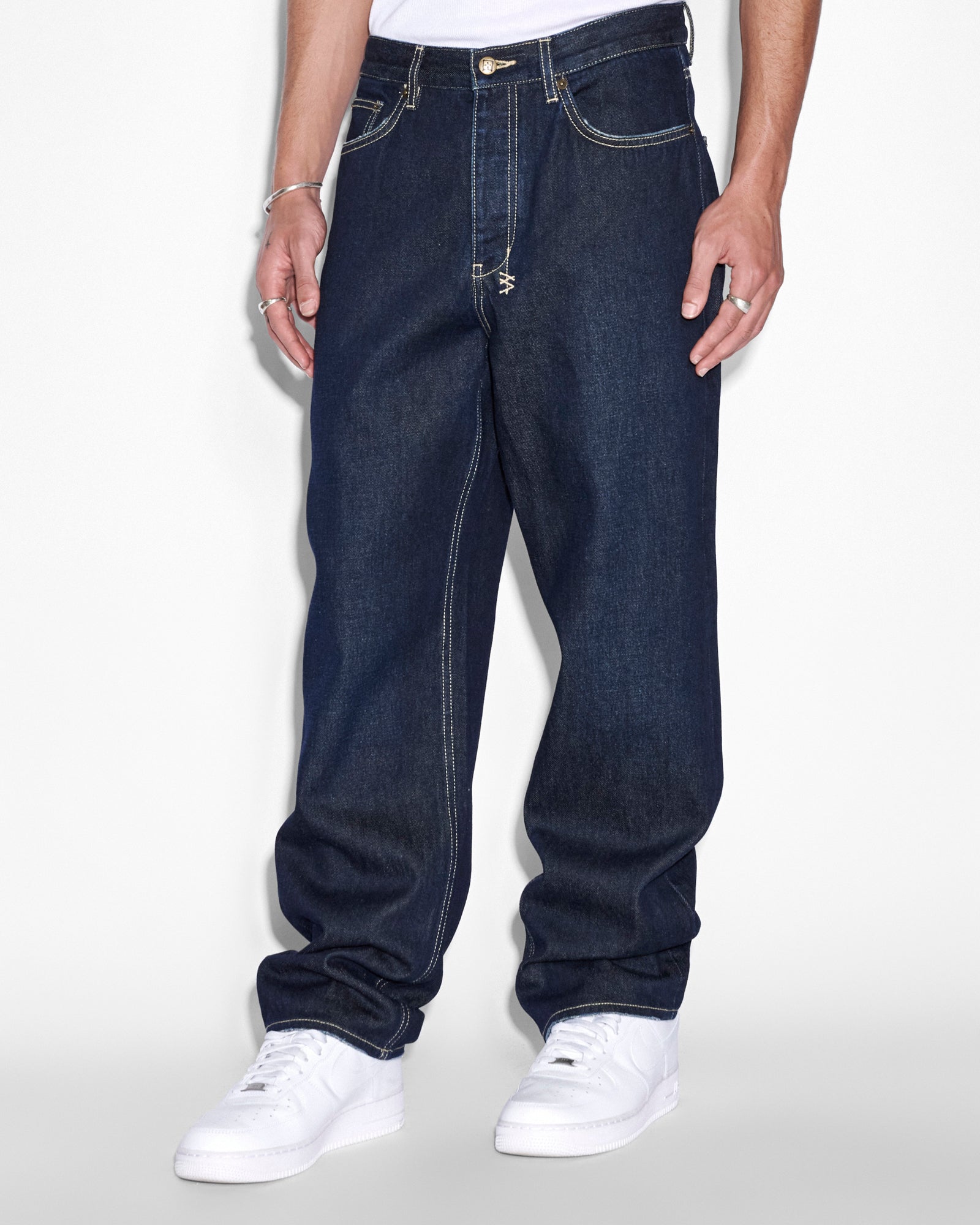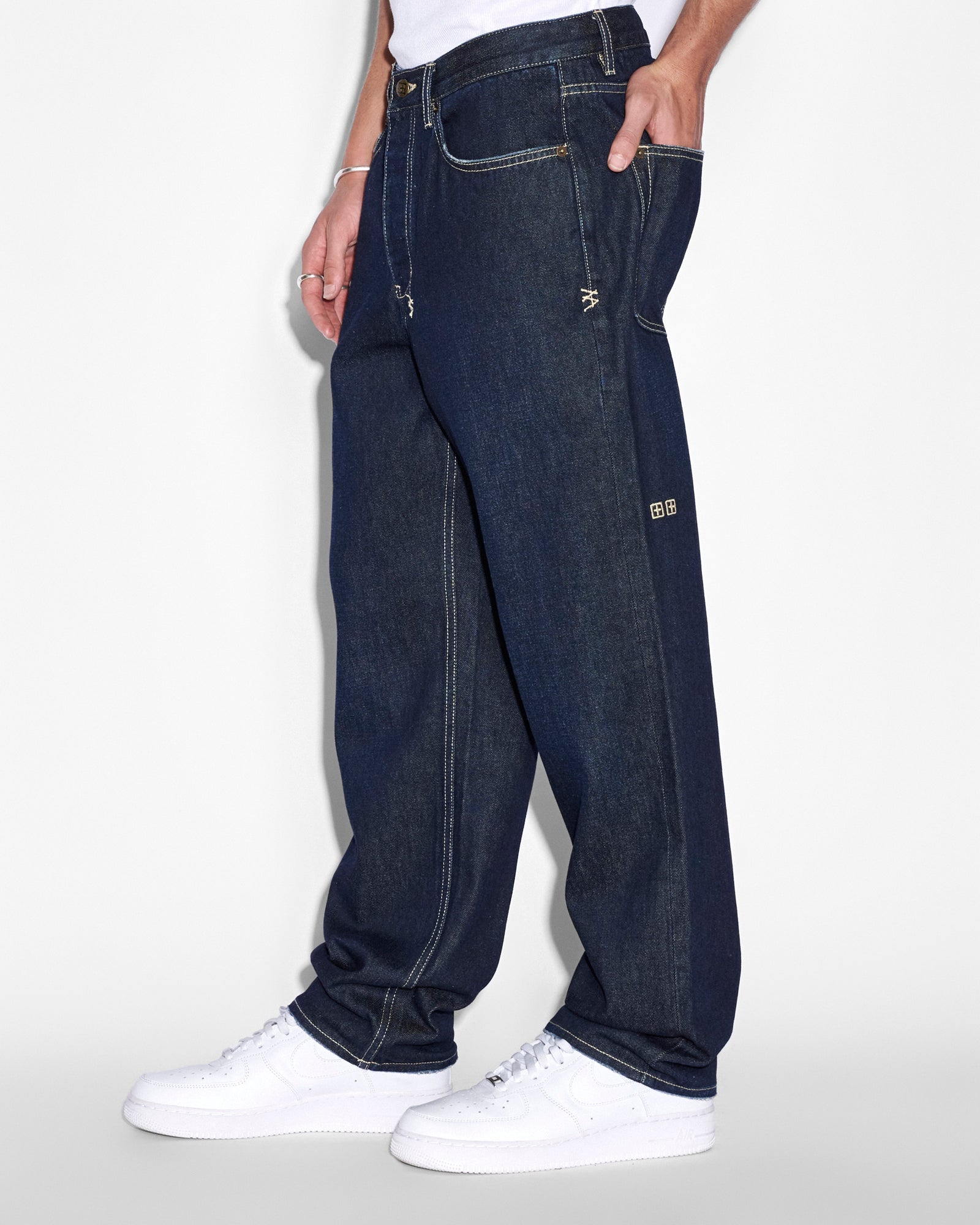 The Anit K Rinsed is a straight fit, relaxed jean with a mid rise and a relaxed regular leg opening. Made from a premium rigid indigo denim with a light rinse wash. Finished with signature t-box and 4x4 embroidery ghost patching detailing and Ksubi branded hardware.