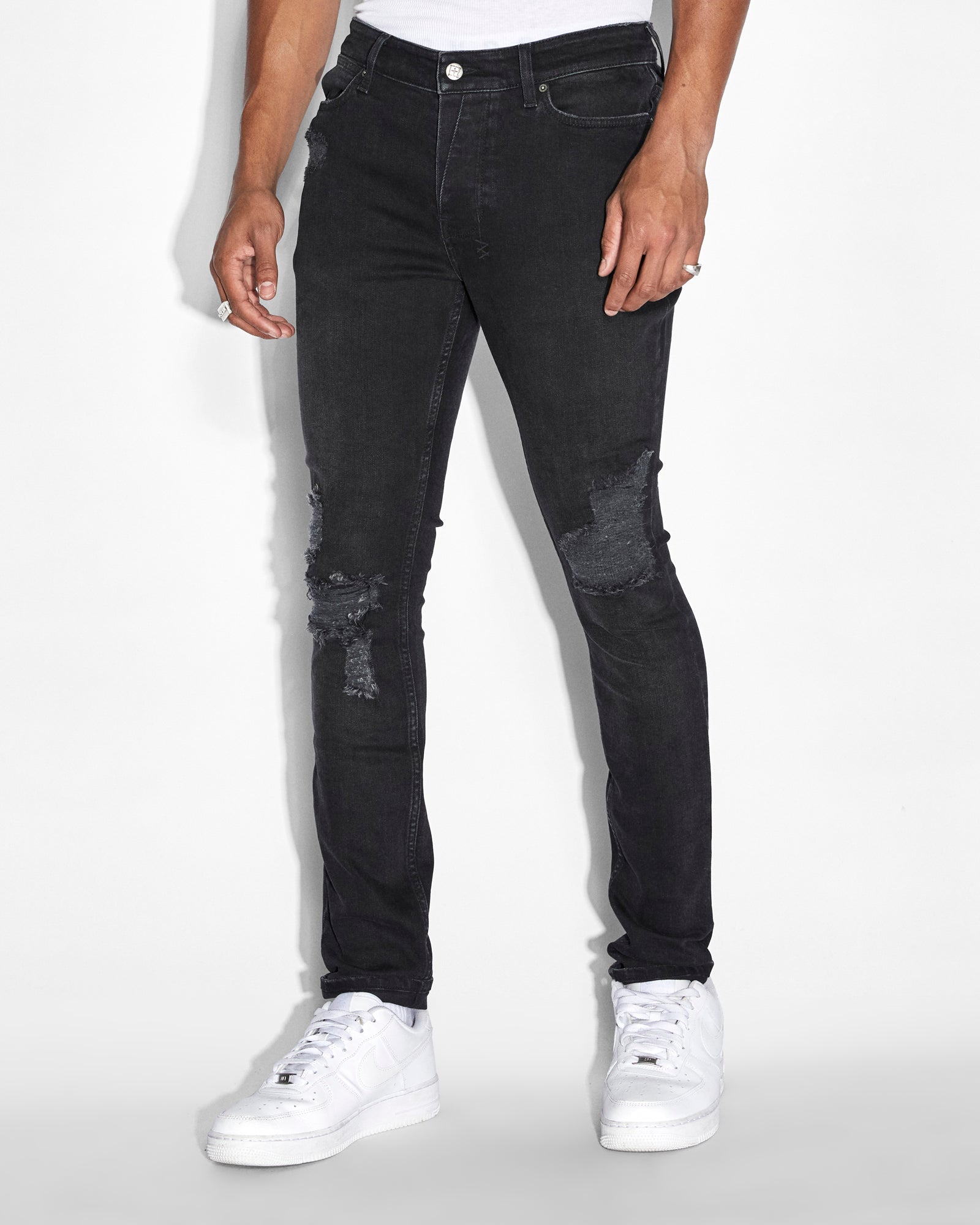 A mid rise five pocket full length skinny jean. Made from a premium comfort stretch denim in a worn black wash . Features XL rip & repair patchwork details light grinding unique angled belt loops front fly seam detail and our signature Ksubi branding.
