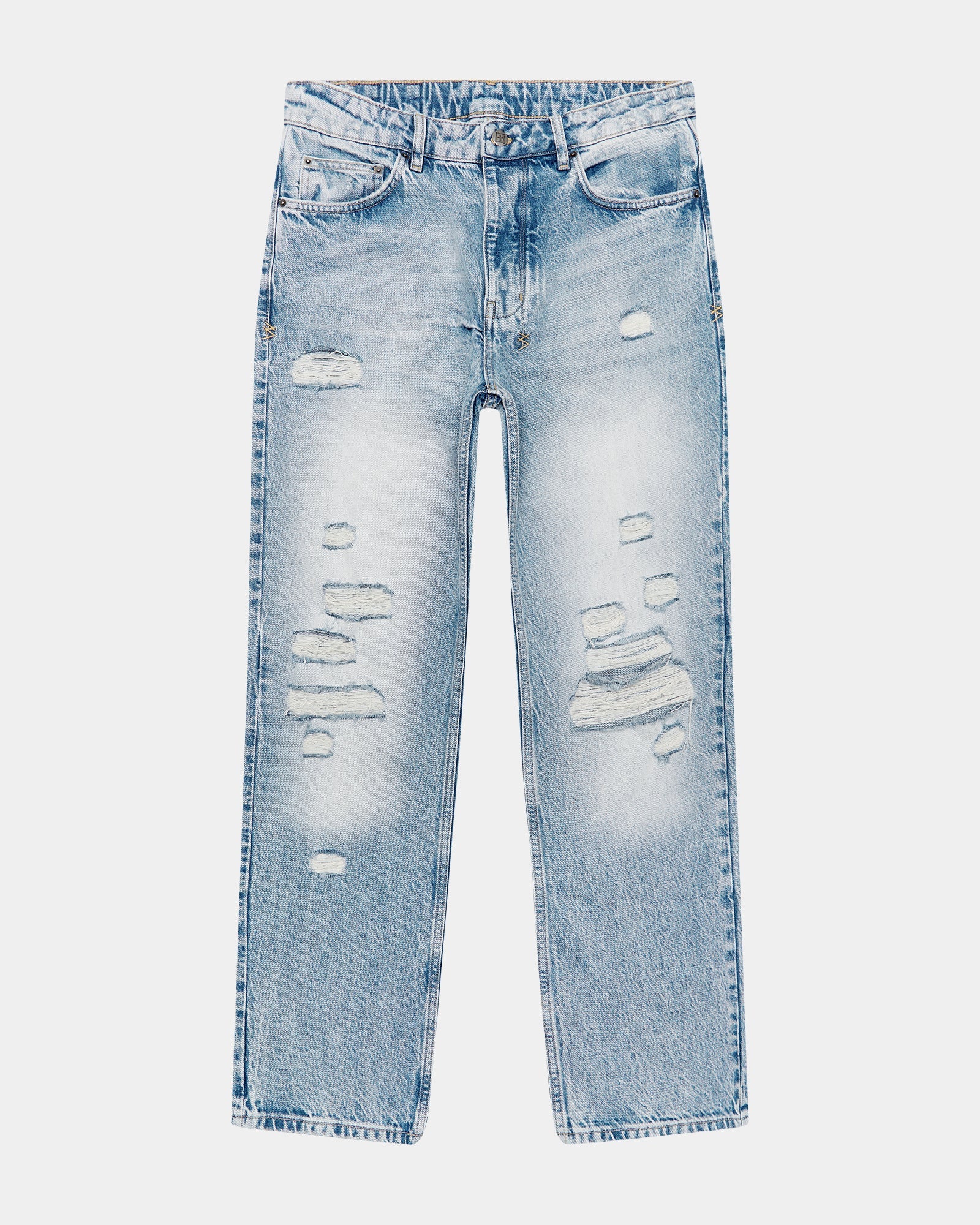 The Hazlow Nu Heritage Trashed is a straight jean with a regular fit through the leg. This mid rise jean is made from a stone washed indigo denim with deconstructions details across the knee and leg. Finished with ghost patching detailing and the signature t-box and 4x4 embroidery.