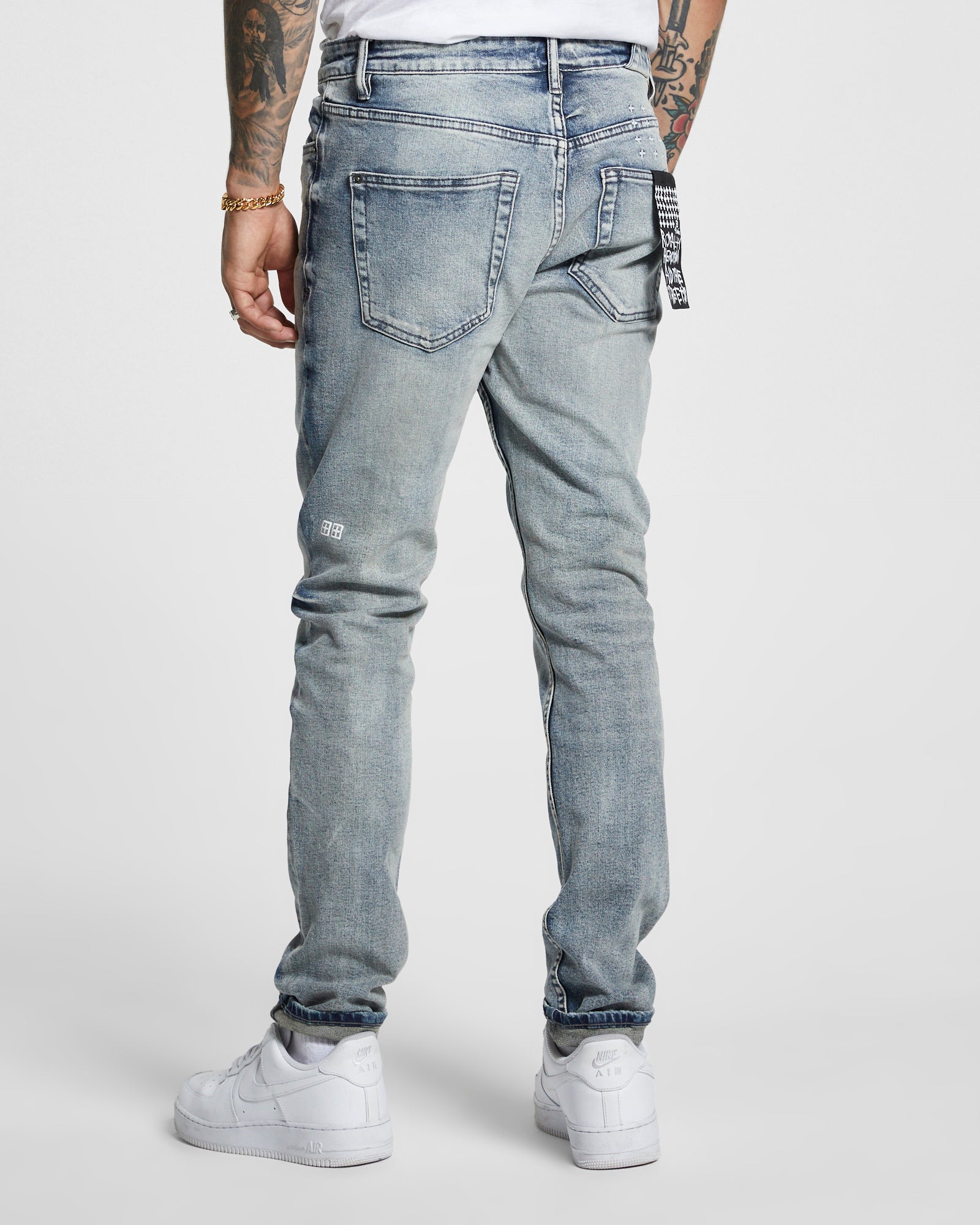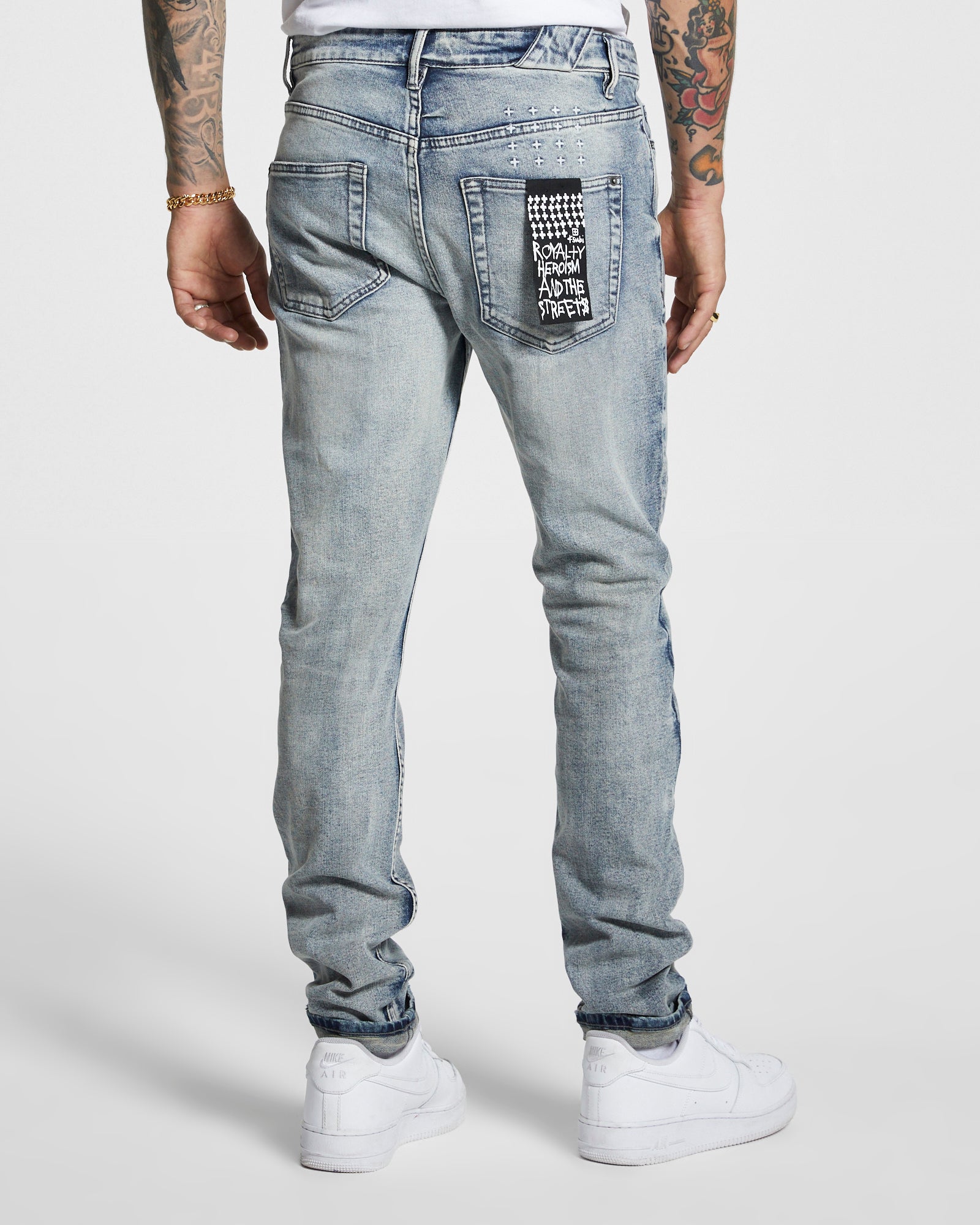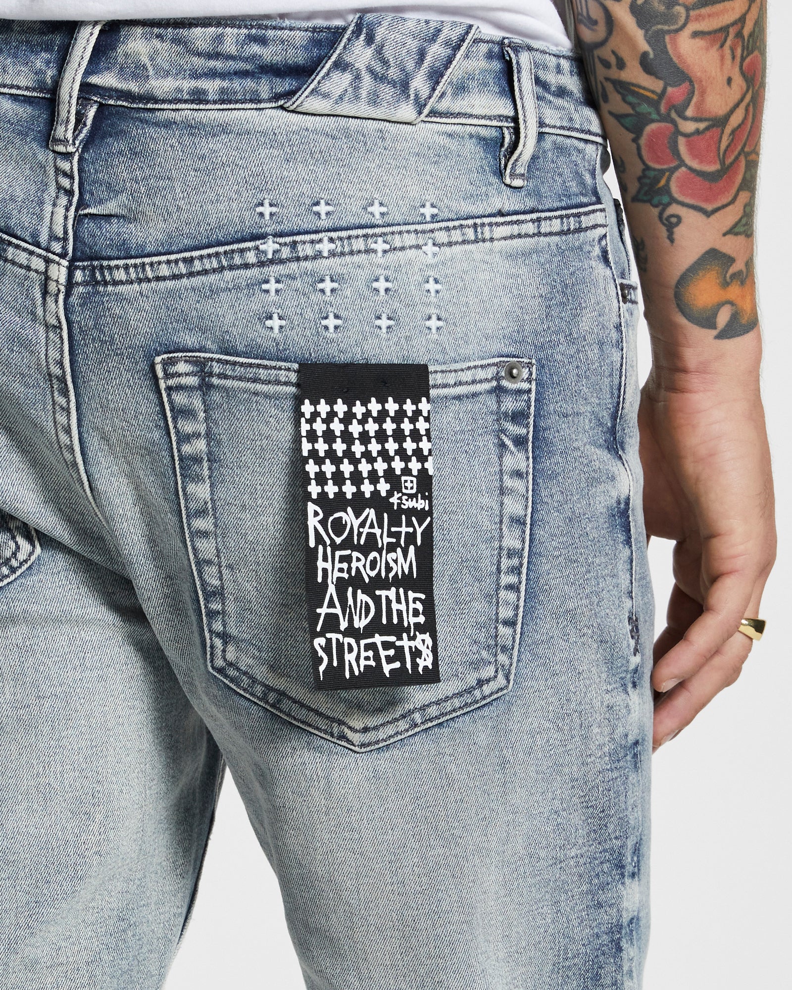 The Chitch Half Way is is degined with unique Ksubi angled dutch tab and tucks, slim fit and mid rise waist. It is made from premium comfort stretch denim in vintage indigo with heavy stonewash and grey tint. This style features back 4x4 cross embroidery, Ksubi t-box print, signature woven pocket flag and branded hardware.