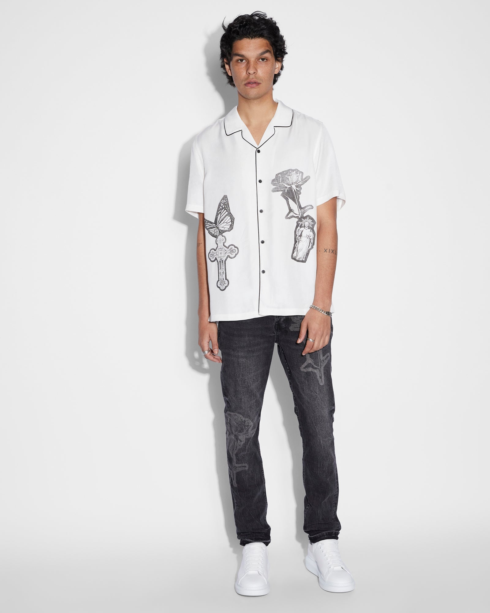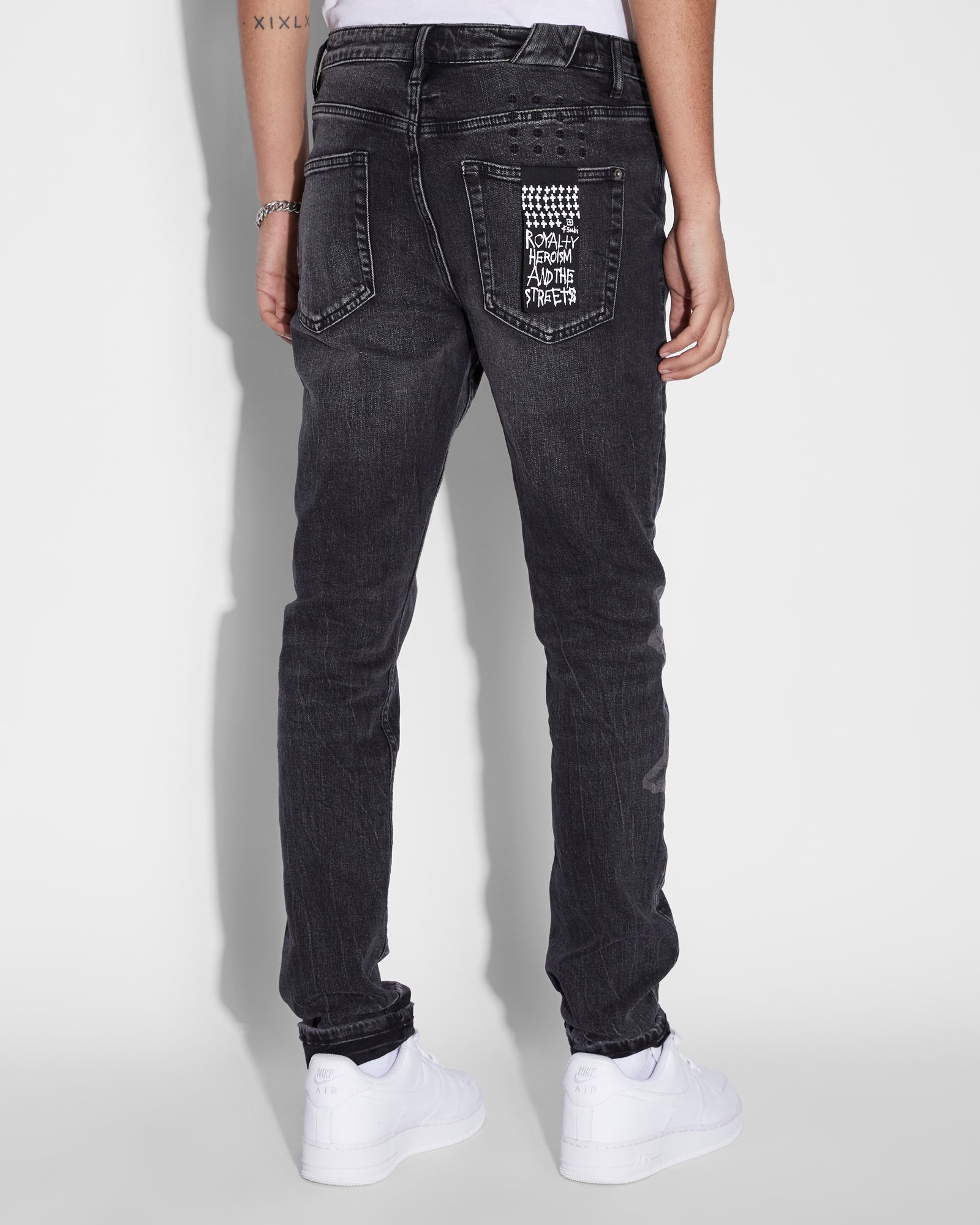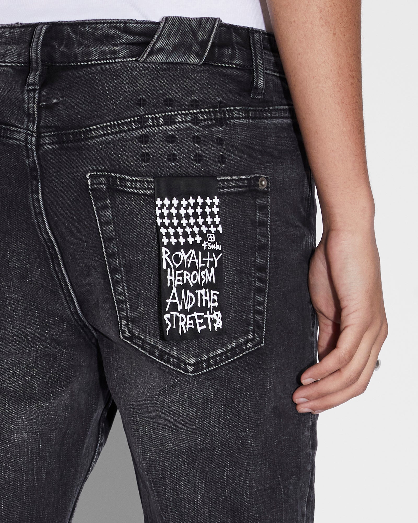 The Chitch Kut Out Black is constructed from premium comfort stretch denim in a heavy faded black wash. This style is a slim fit, mid rise jean designed with unique Ksubi angled dutch tab and tucks, button fly and five pockets. The jean is finished with an original laser print detail on the front and back as well as the iconic Ksubi branding.