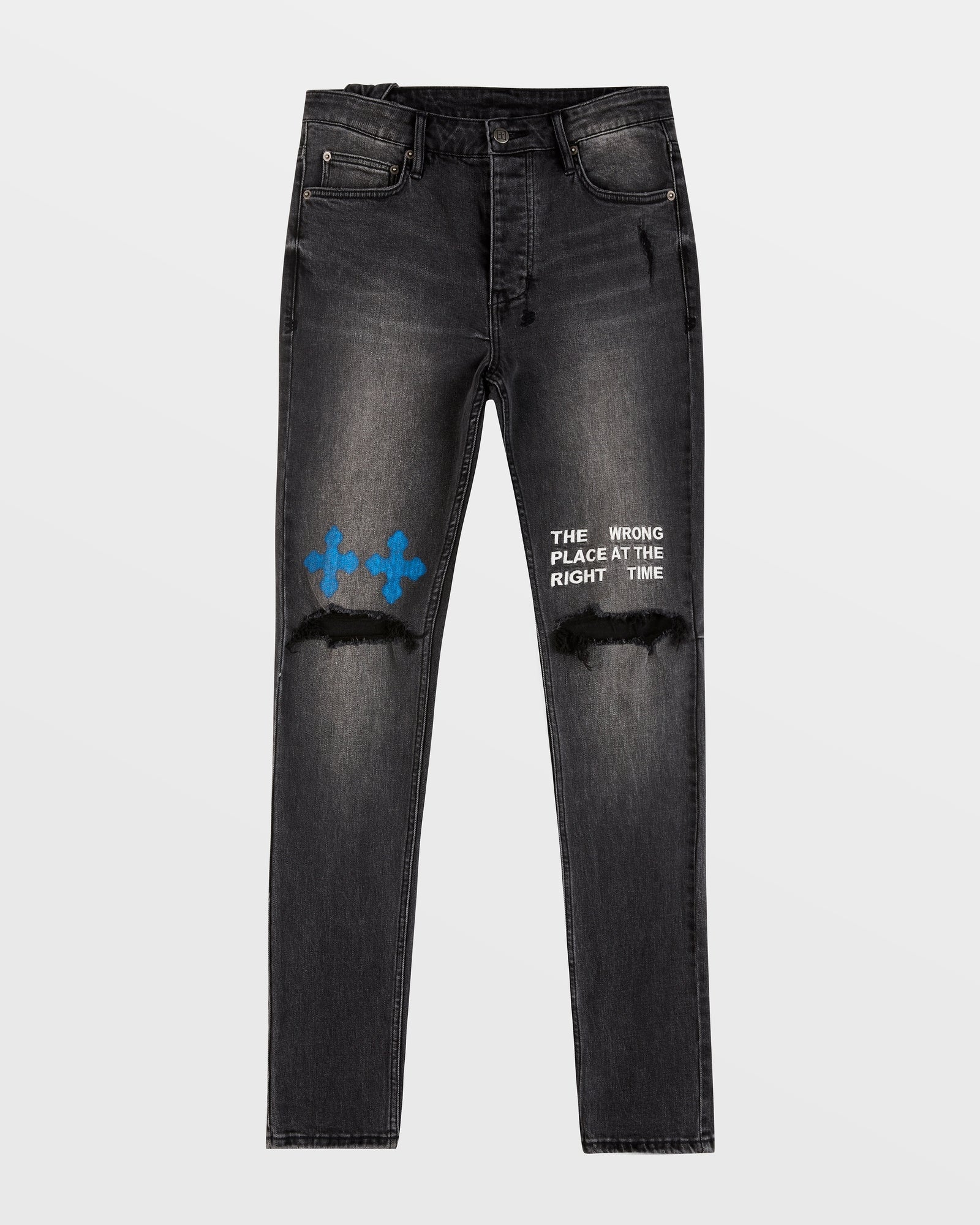 The Chitch Right Time Black is a slim tapered jean with a mid long rise, five pockets, a button fly and signature dutch tab. Made from premium washed black comfort stretch denim and features knee deconstruction details. This style is finished with signature t-box, pocket woven tag, 4x4 embroidery and Ksubi branded hardware.