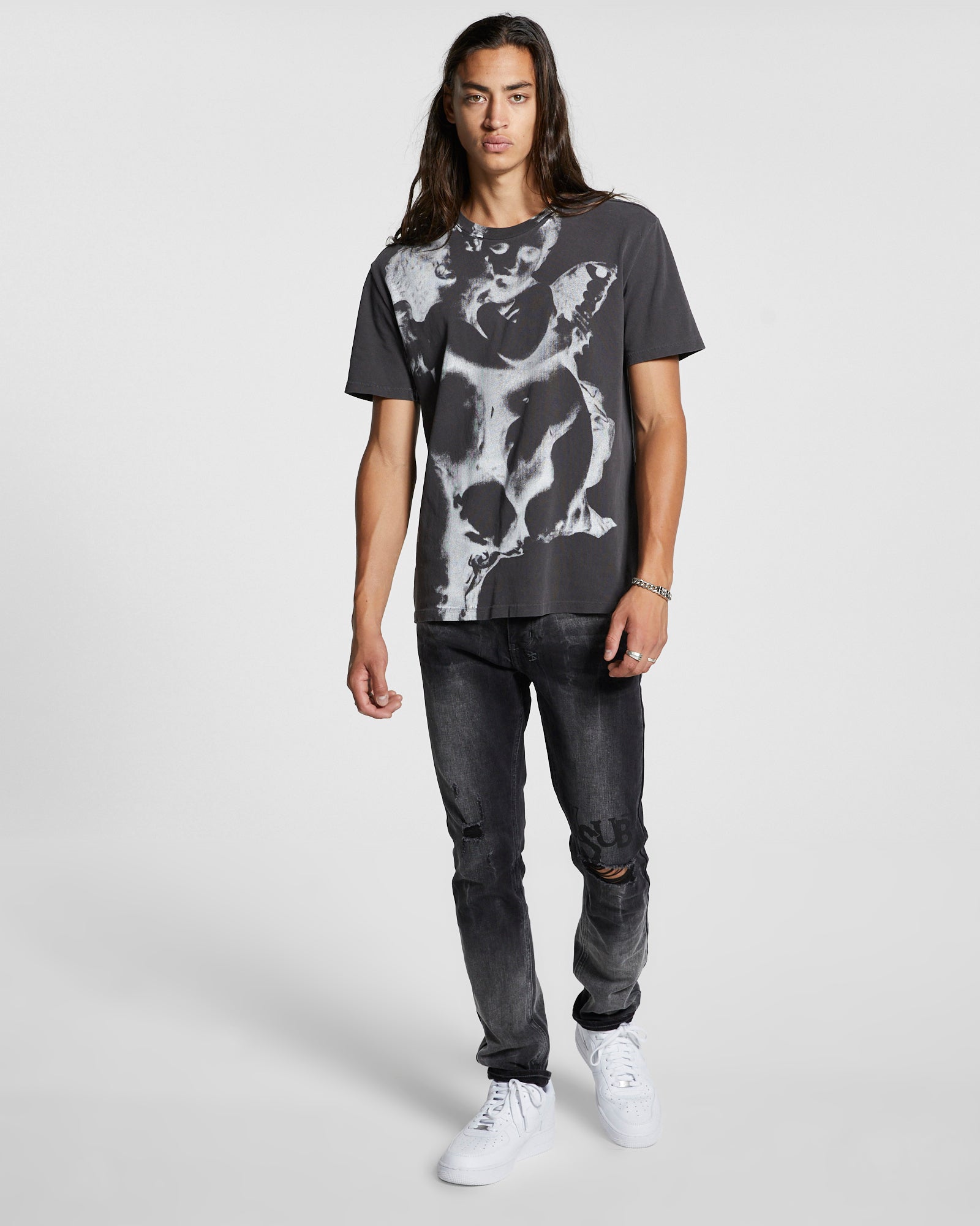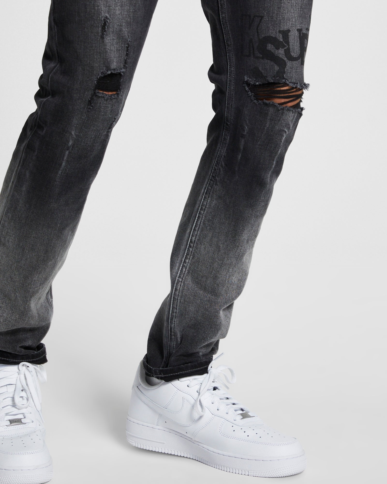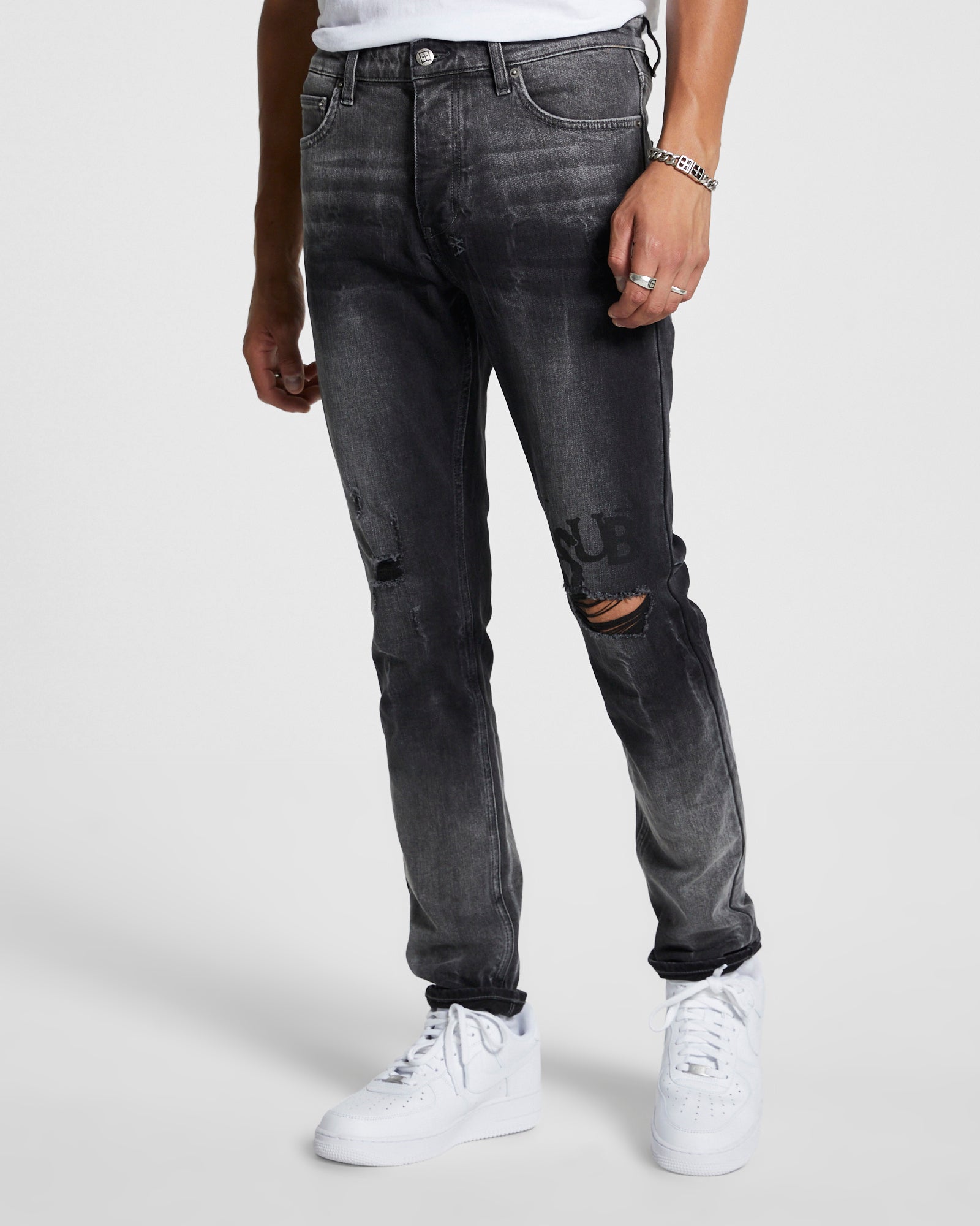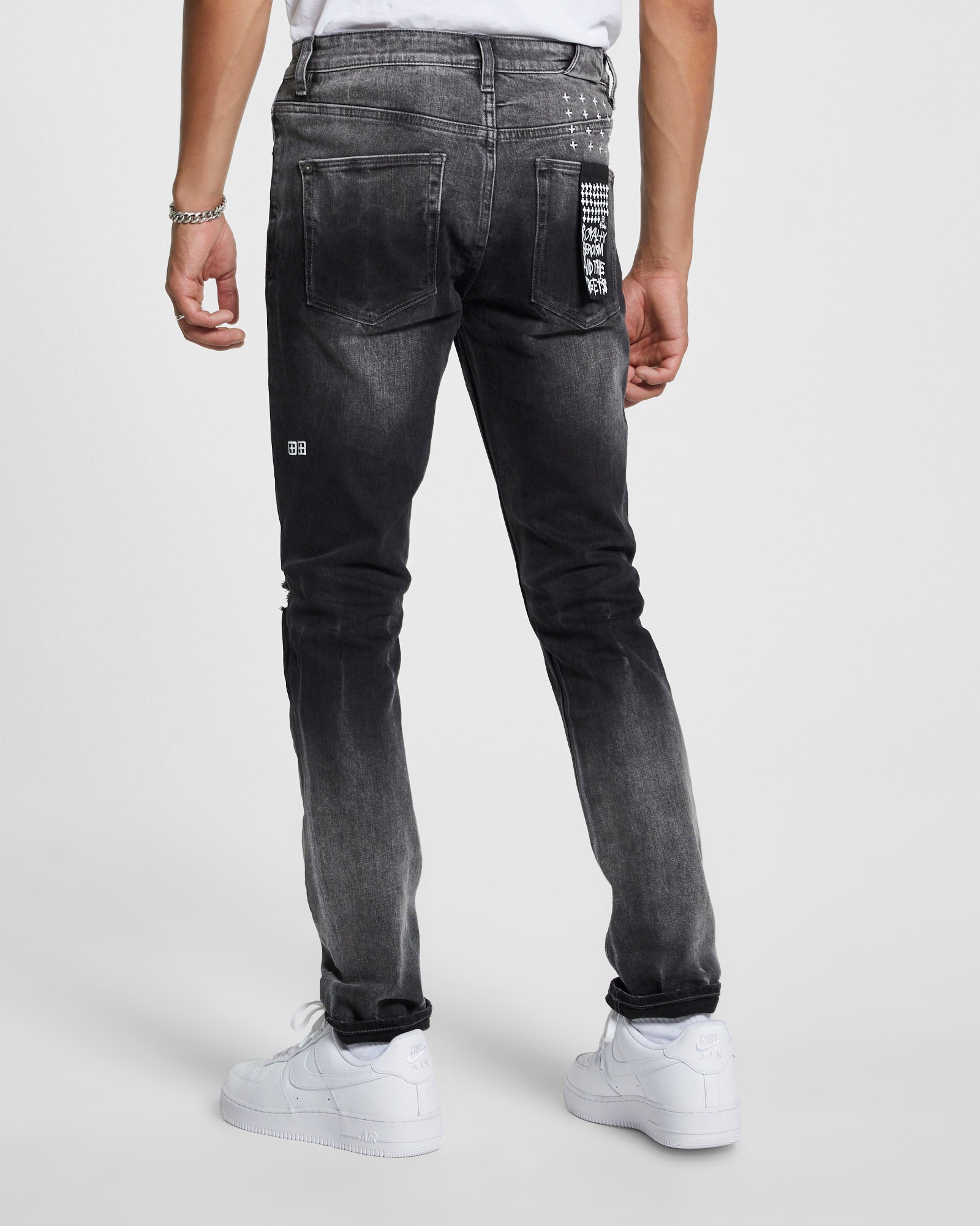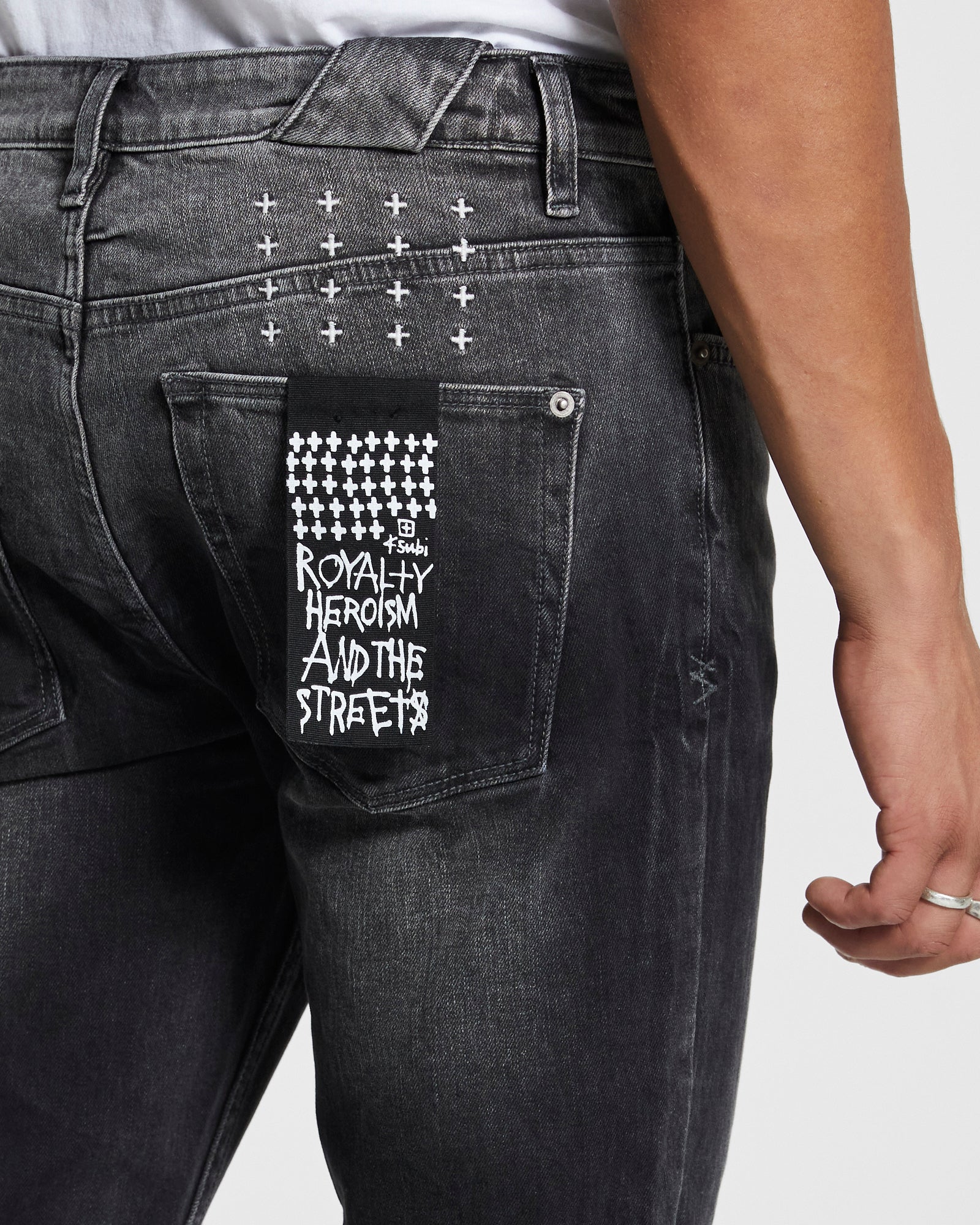 The Chitch Smoke Out Rose is a mid rise slim fit jeans made from premium comfort stretch denim in vintage black wash with smoke-like highlights and whiskering. It is designed with a smash print, decons and distressing. Finished with back 4x4 cross embroidery, Ksubi t-box print, signature woven pocket flag, branded hardware and unique Ksubi angled dutch tab and tucks.