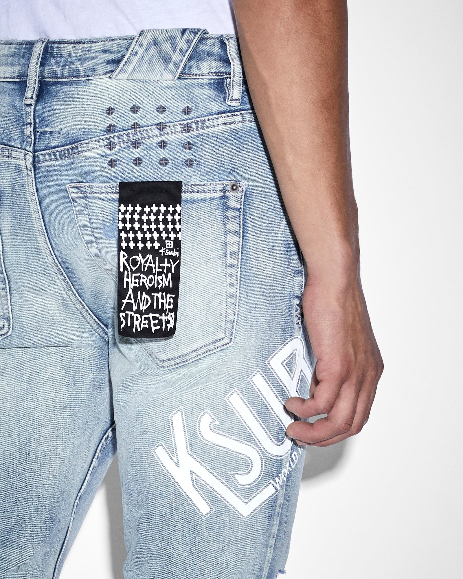 The Chitch Ticket features knee and thigh deconstruction, a unique thigh print and light grinding. This style is a mid rise, slim fit jean featuring our classic Ksubi angled dutch tab and tucks. This style is constructed from premium comfort stretch denim in a mid vintage wash. Signed off with Ksubi t-box print, back cross embroidery, signature woven pocket tag and branded hardware. Wear it with the 'Ticket Biggie Ss Tee Moon' for a complete look.