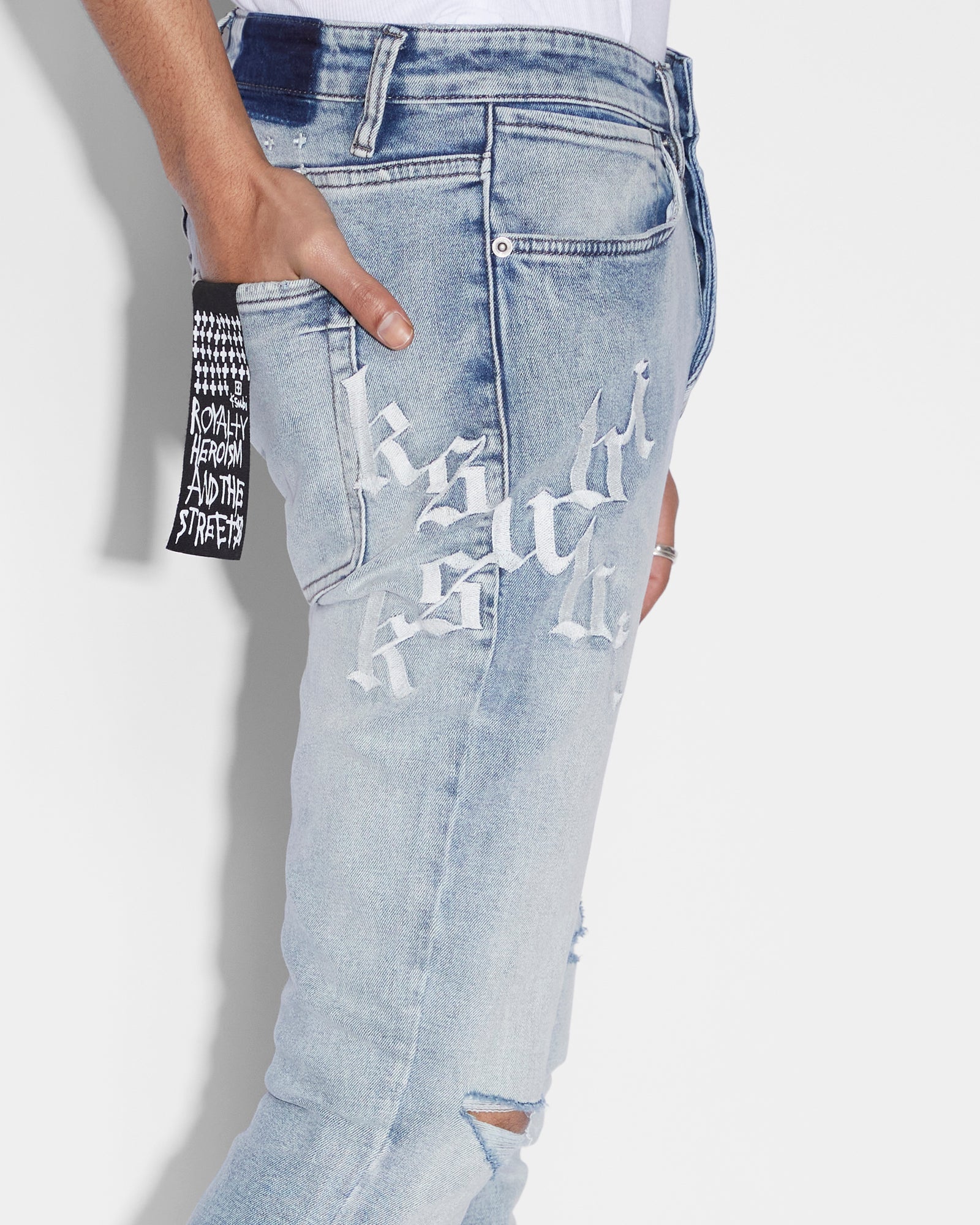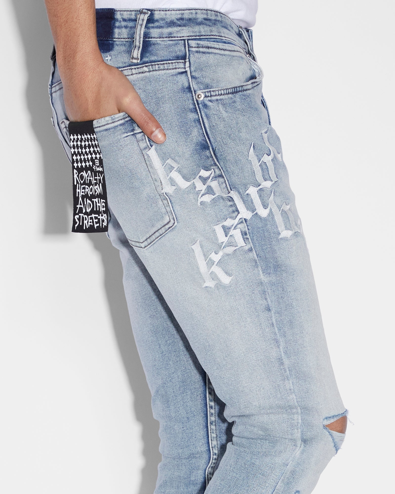 The Van Winkle Kult is constructed from premium comfort stretch denim a heavy medium denim wash. This style is a skinny fit, mid rise waisted jean with five pockets, unique angled belt loops and a front fly seam. Signed off with embroidered artwork detail on the side, Ksubi t-box print, back cross embroidery, signature woven pocket tag and branded hardware.