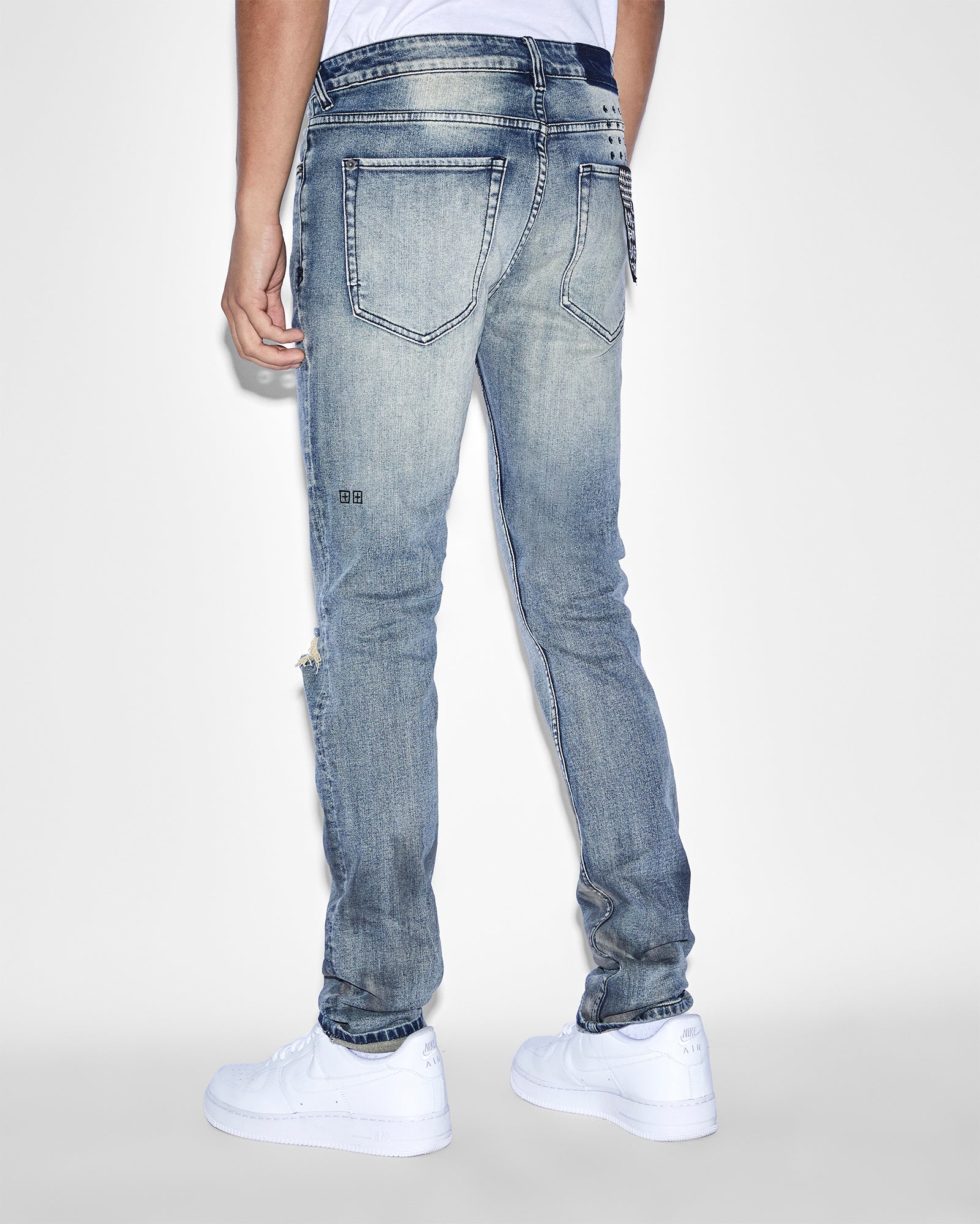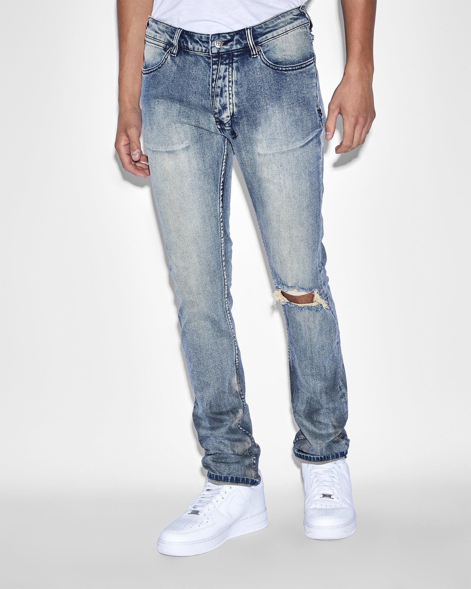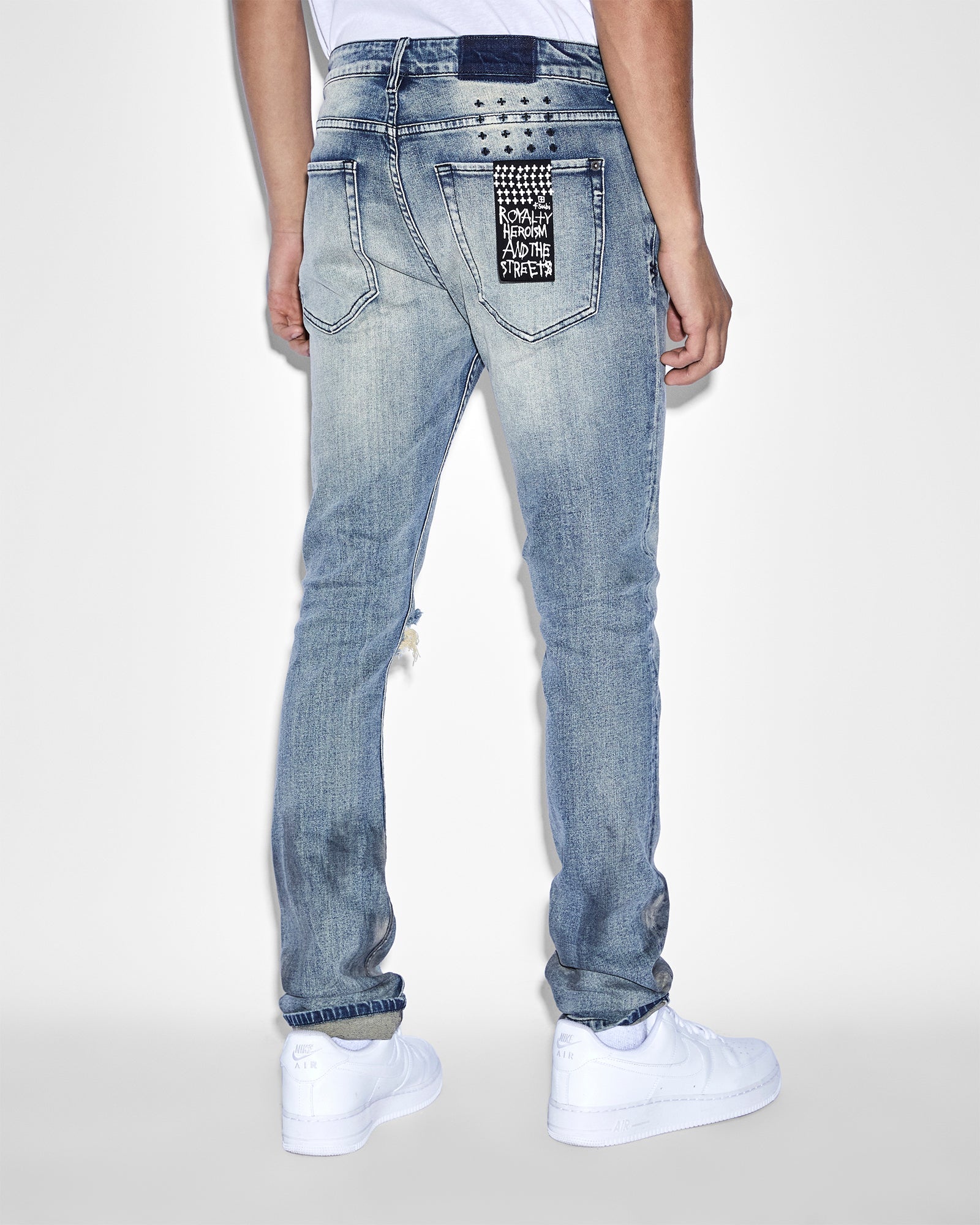 The Van Winkle Round Three is constructed from premium comfort stretch denim in a heavy tinted wash. This style is a skinny fit jean with a mid rise waist with unique angled belt loops and front fly seam. Detailed with front single knee deconstruction, light grinding, branded hardware, back cross embroidery, signature woven pocket tag and Ksubi t-box print.