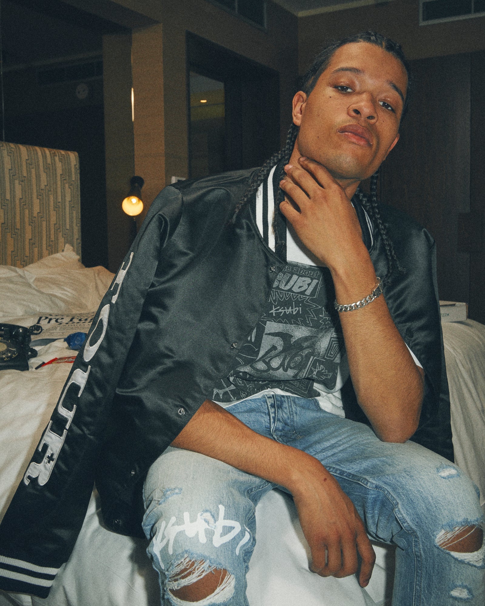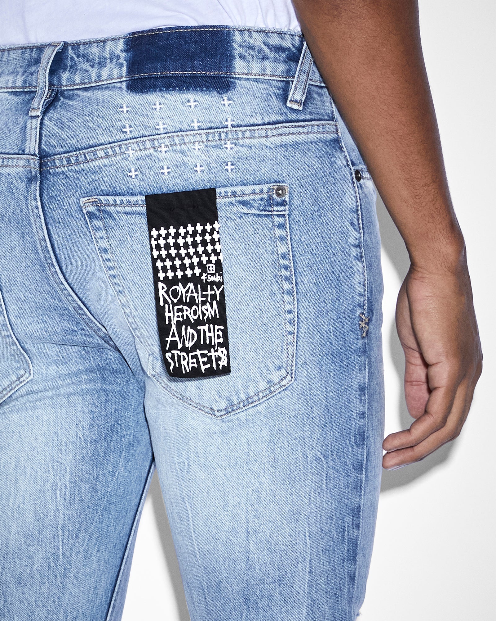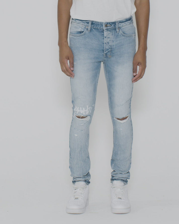 The Van Winkle Vertigo Plus is constructed from premium comfort stretch denim in a medium indigo faded wash. This skinny fit jean has a mid rise waist with unique angled belt loops and front fly seam. This style is designed with front knee deconstruction, print details, light grinding and is completed with our Ksubi t-box print, back cross embroidery, signature woven pocket tag and branded hardware.