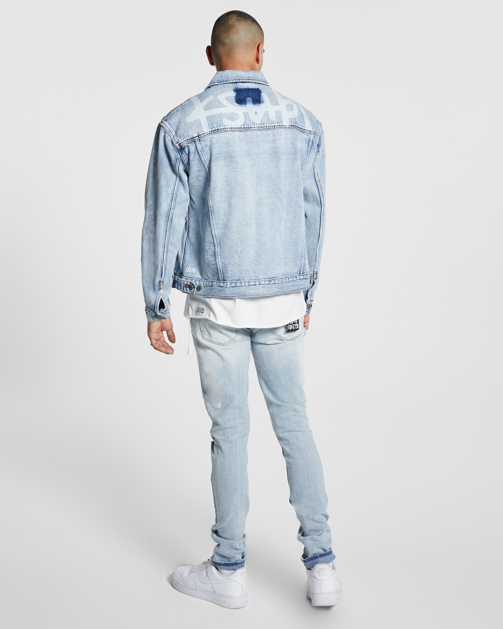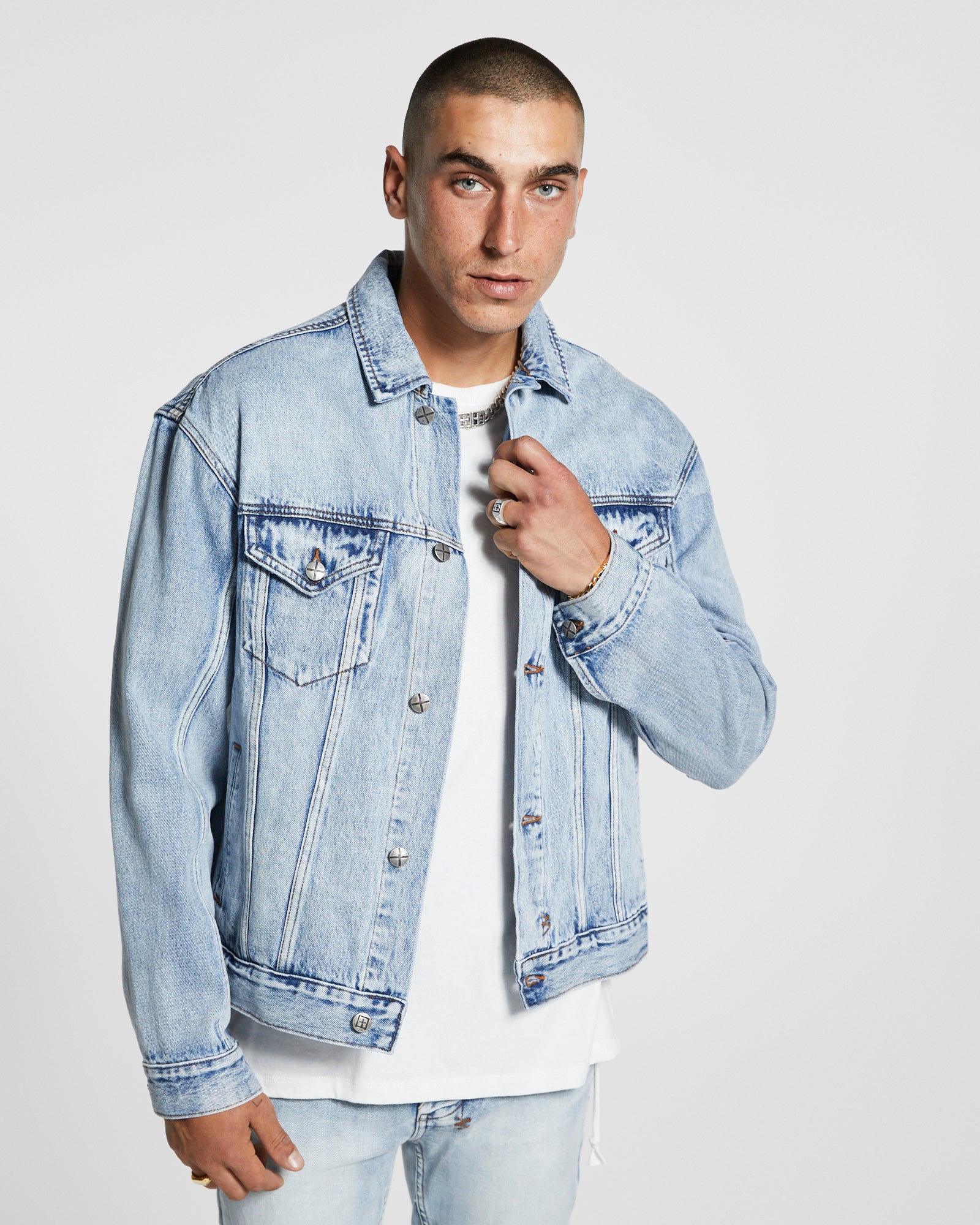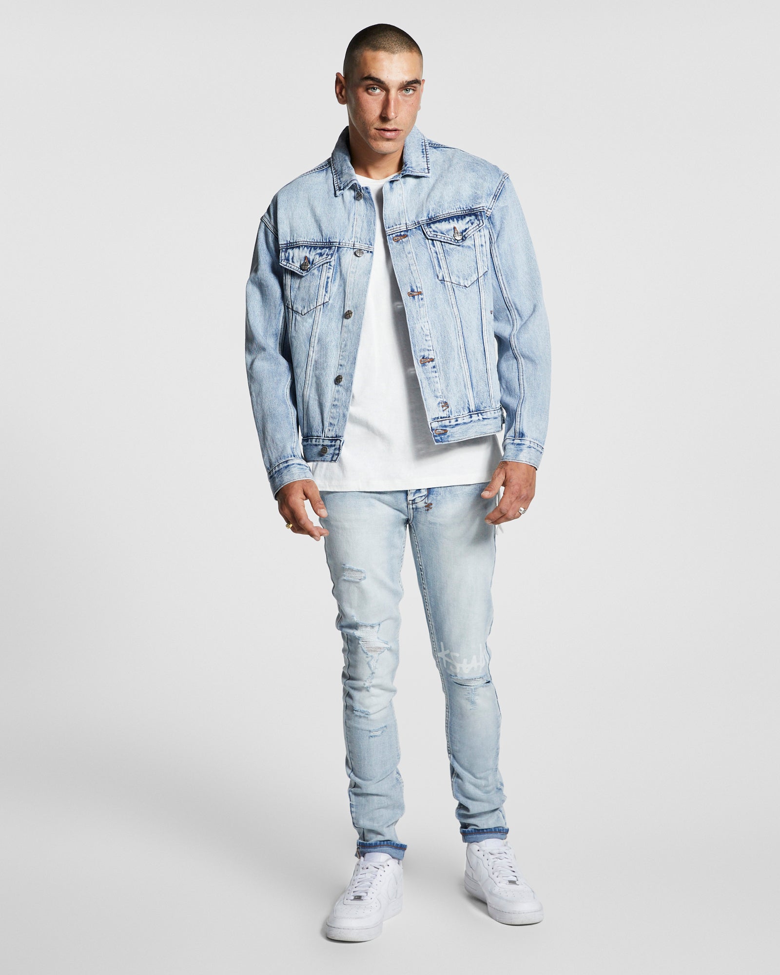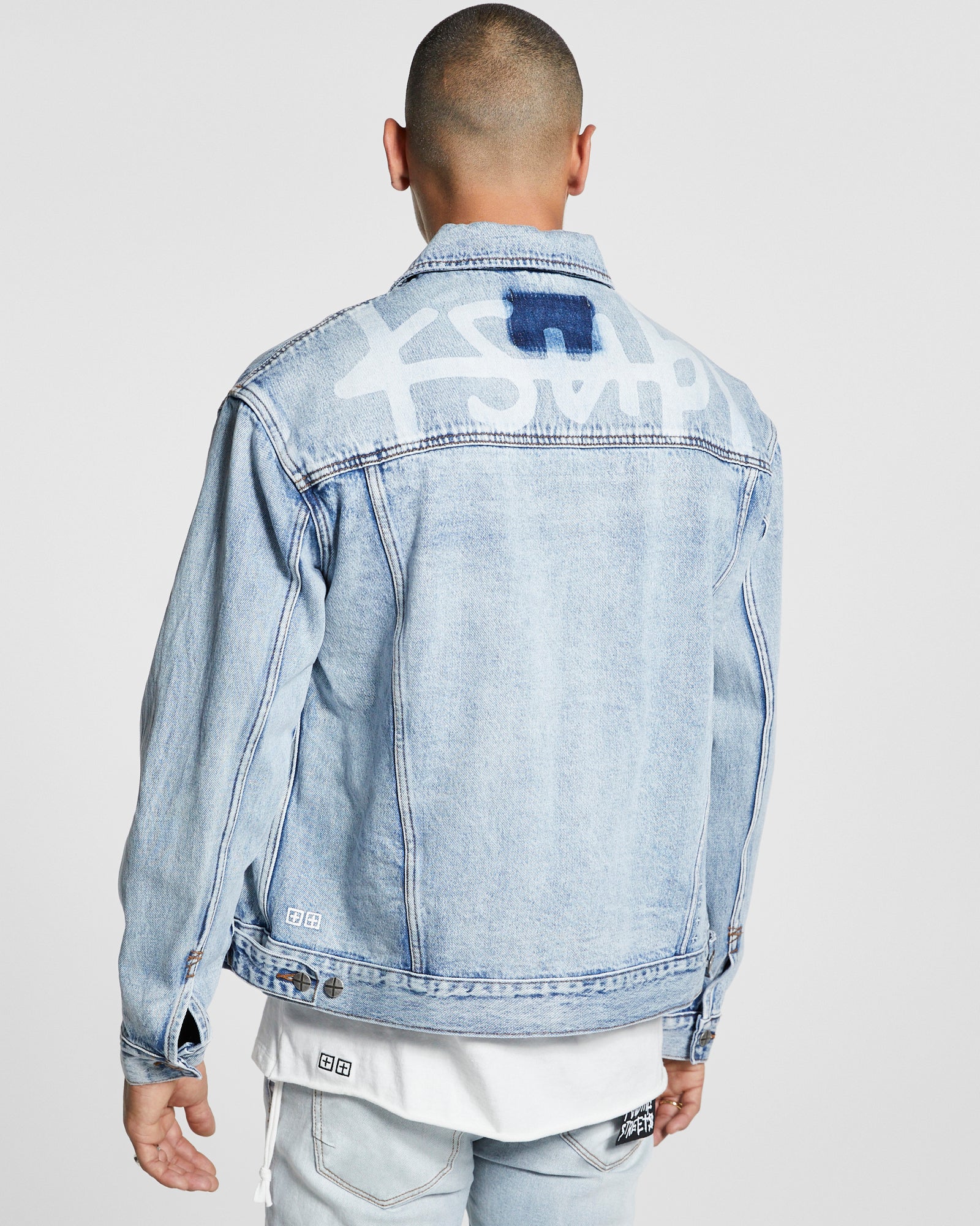 The Oh G Jacket 1999 City High is a trucker jacket with an oversized fit, four pockets, and light grinding. It features back discharge print, tobacco topstitching, back 4x4 cross embroidery, Ksubi t-box print and branded hardware. This button through jacket is made from premium rigid denim in vintage indigo with stonewash.