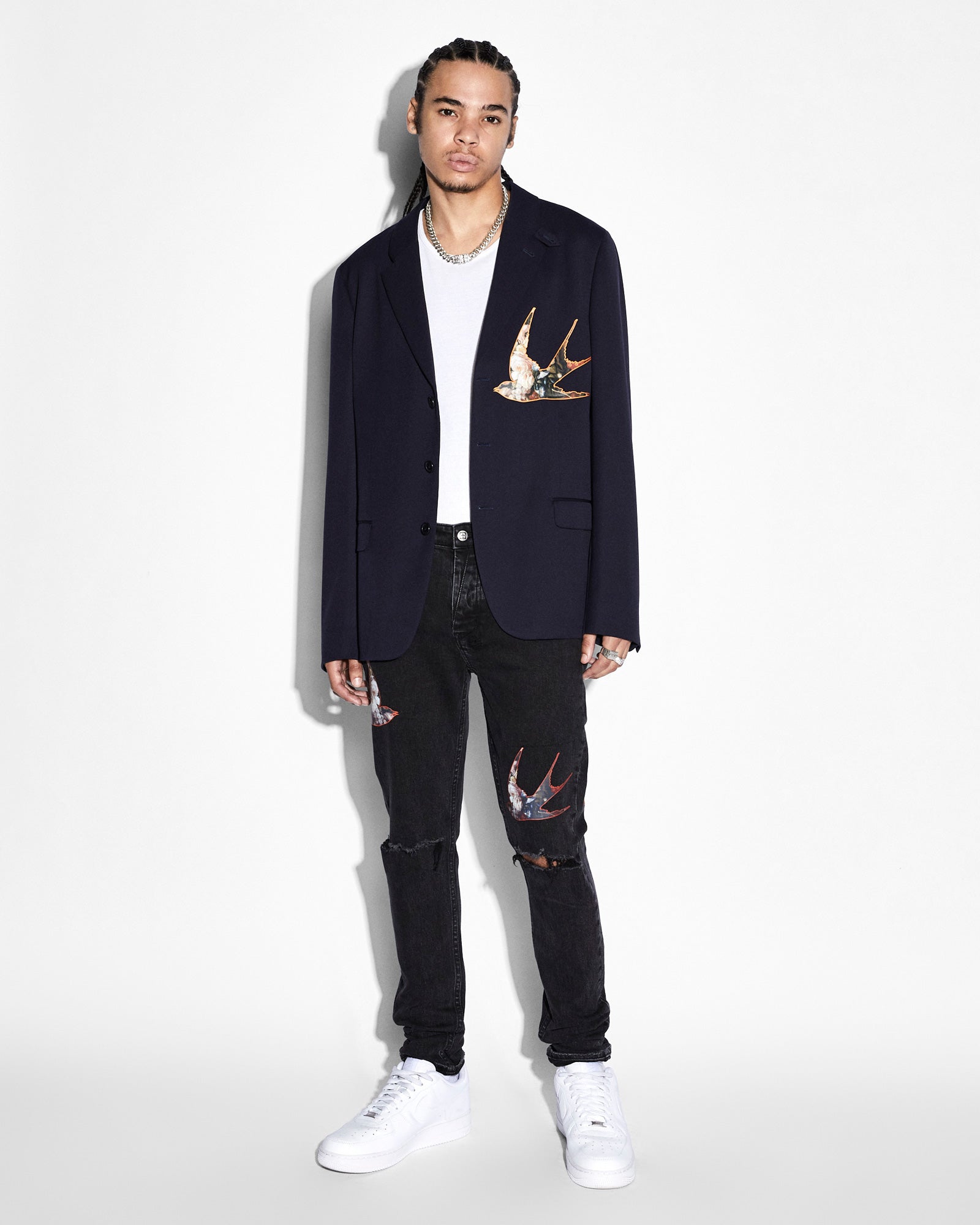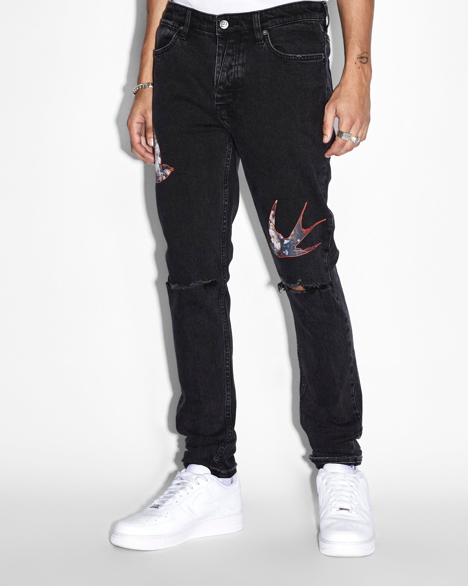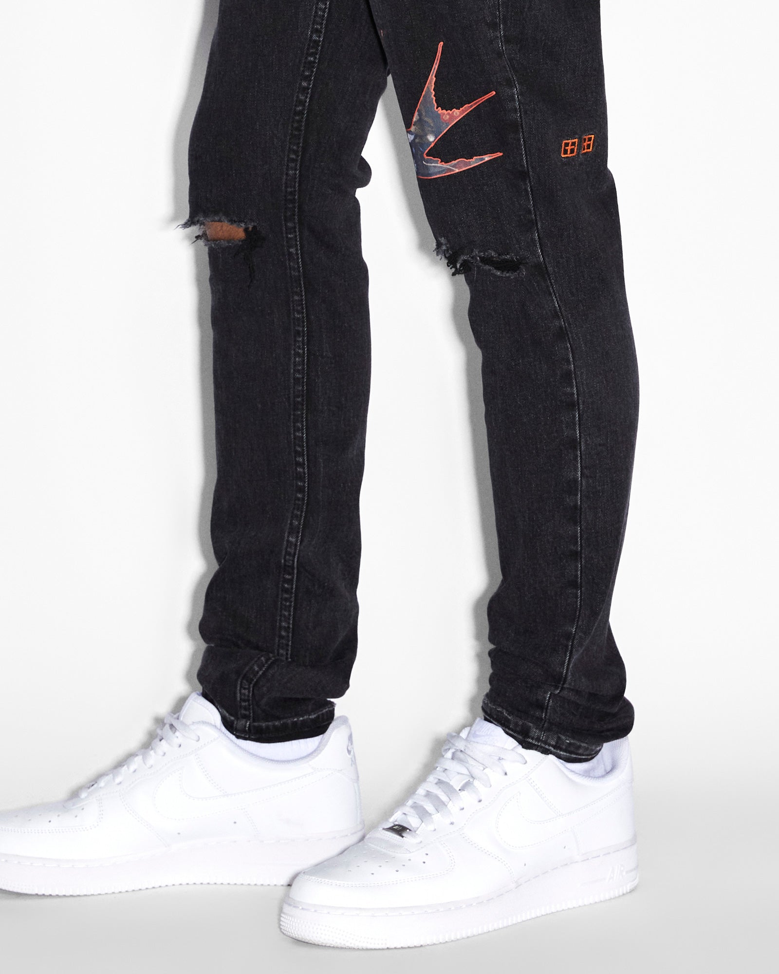 The Van Winkle Ecology is designed with digital print artwork on the front & back, knee deconstruction details, five pockets, a button fly, angled belt loops and a fly stitch detail. This skinny fit jean with a mid rise is made from premium washed black comfort stretch denim. Finished with ghost patching signature t-box, woven pocket tag, 4x4 embroidery and Ksubi branded hardware.