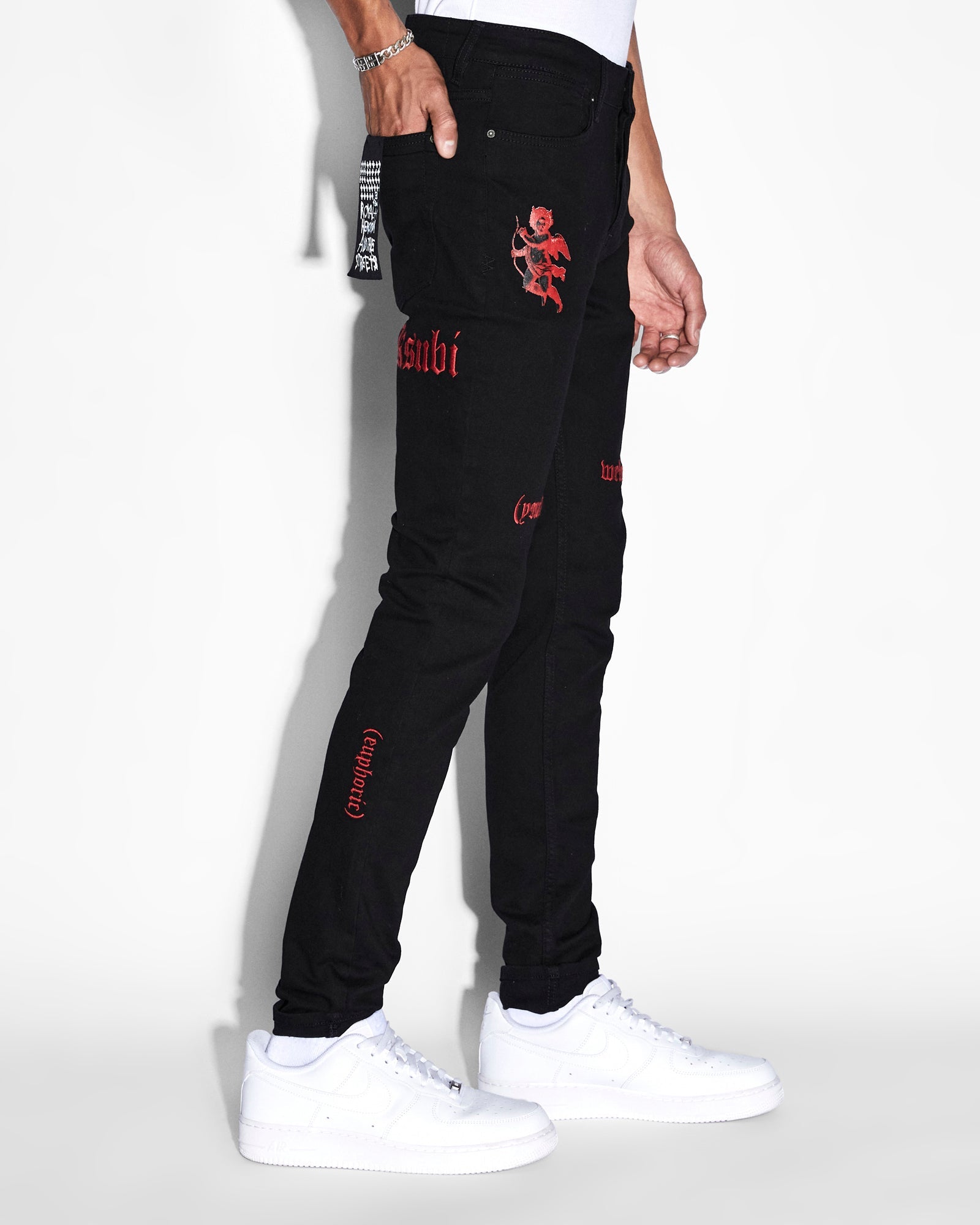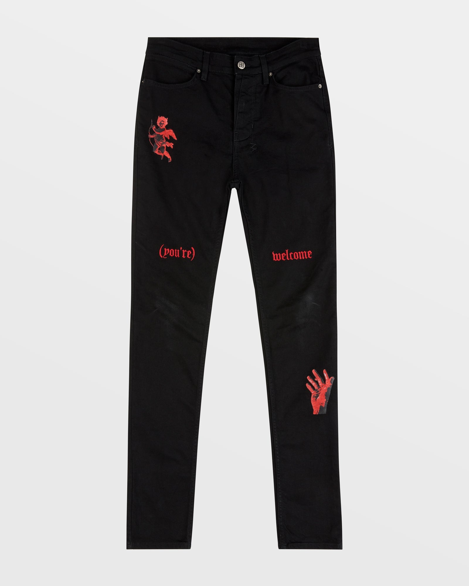 The Van Winkle Icons Black features multiple screen prints and embroidery on the front and back. This is a skinny fit jean with a mid rise, unique angled belt loops, five pockets and a front fly seam. This style is made from a European comfort stretch denim in a jet black colourway and finished with our signature woven pocket tag, t-box, 4x4 embroidery and Ksubi branded hardware