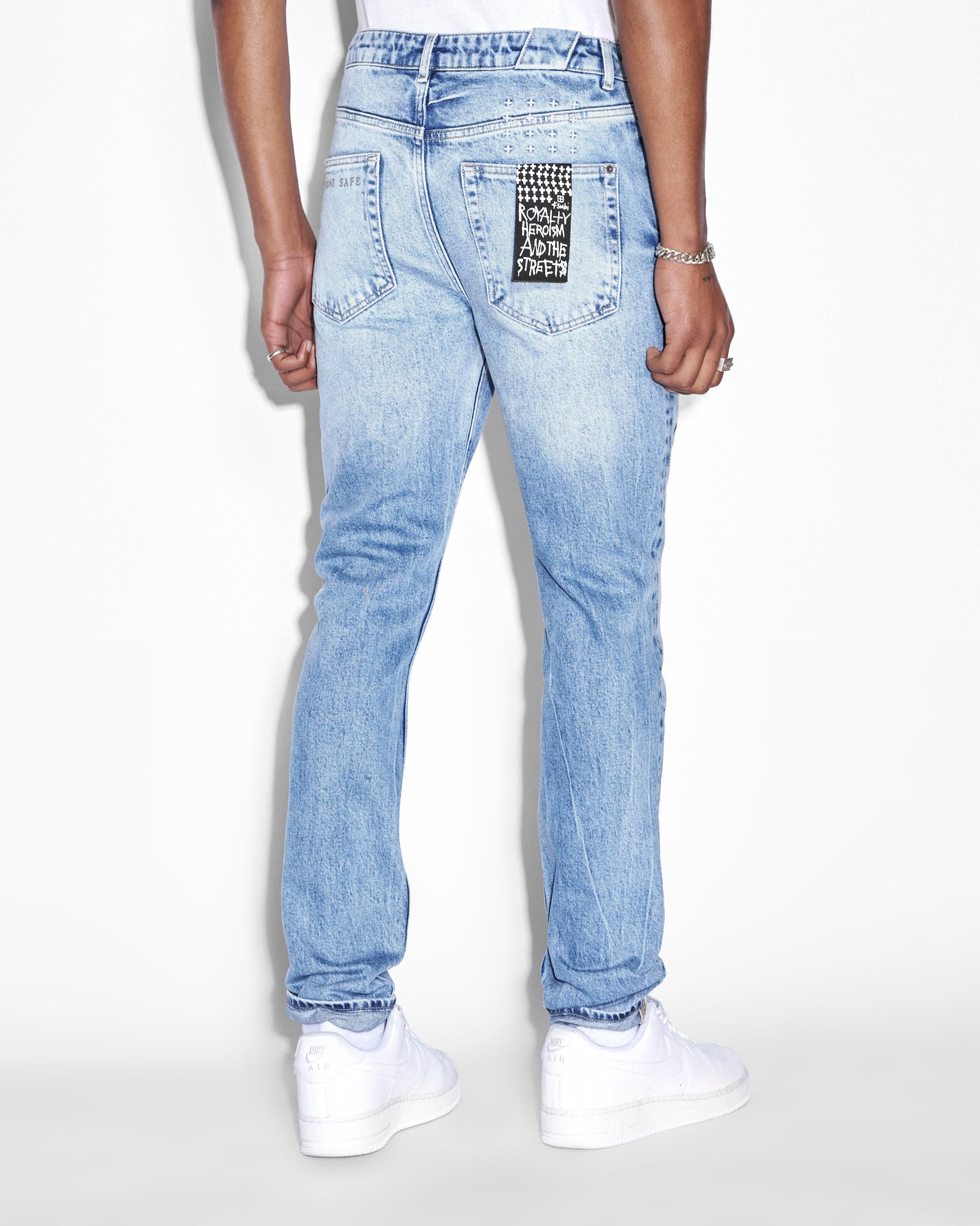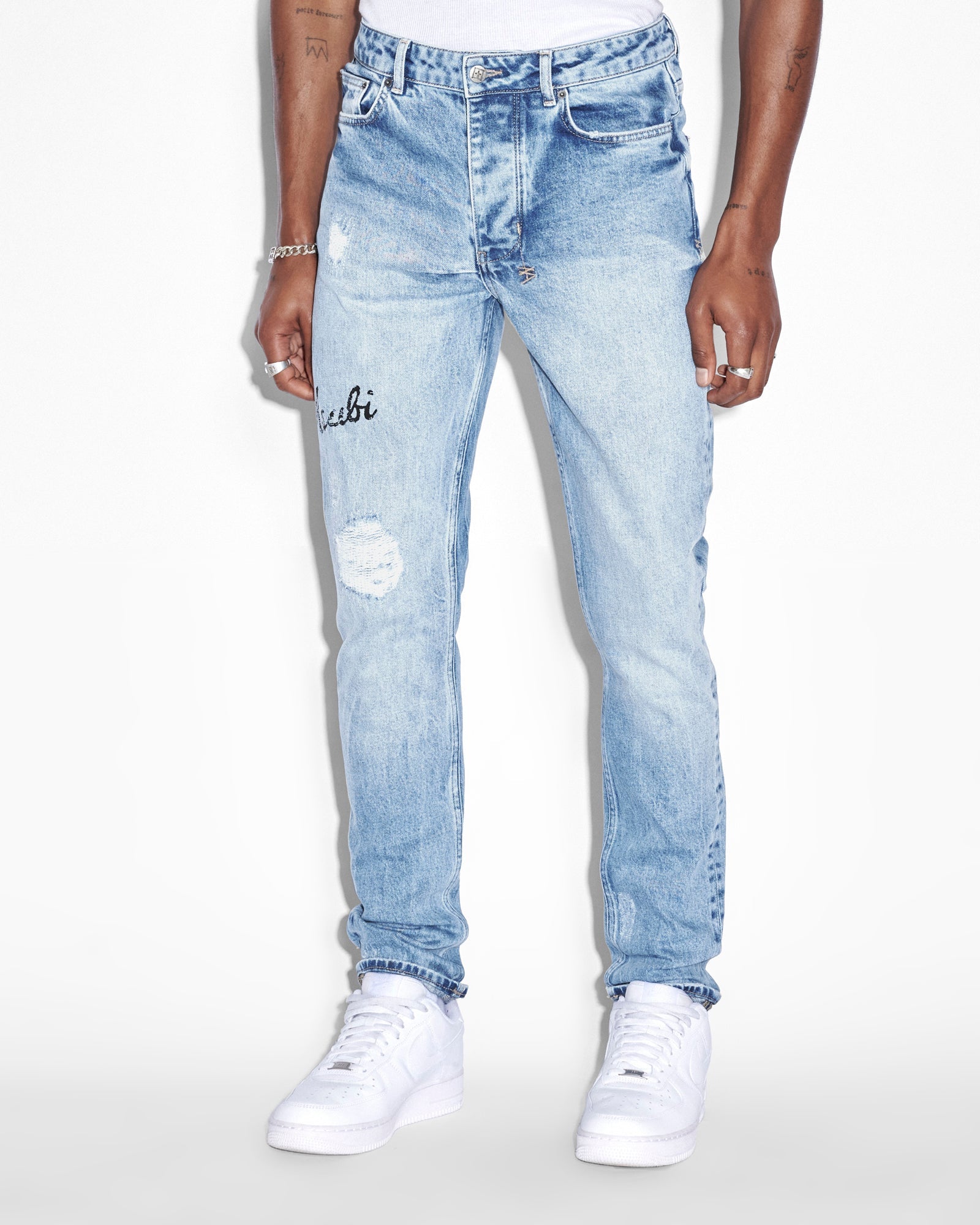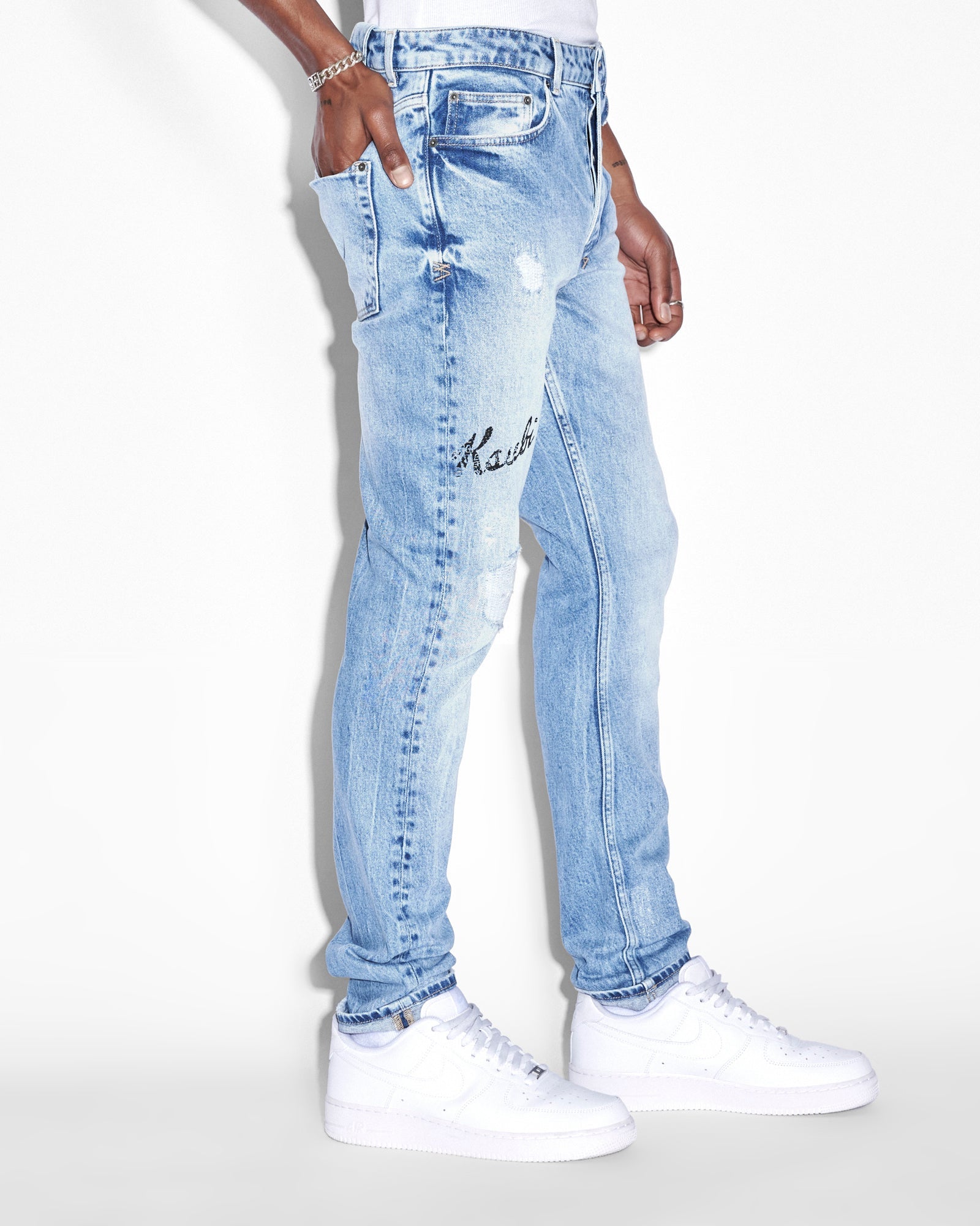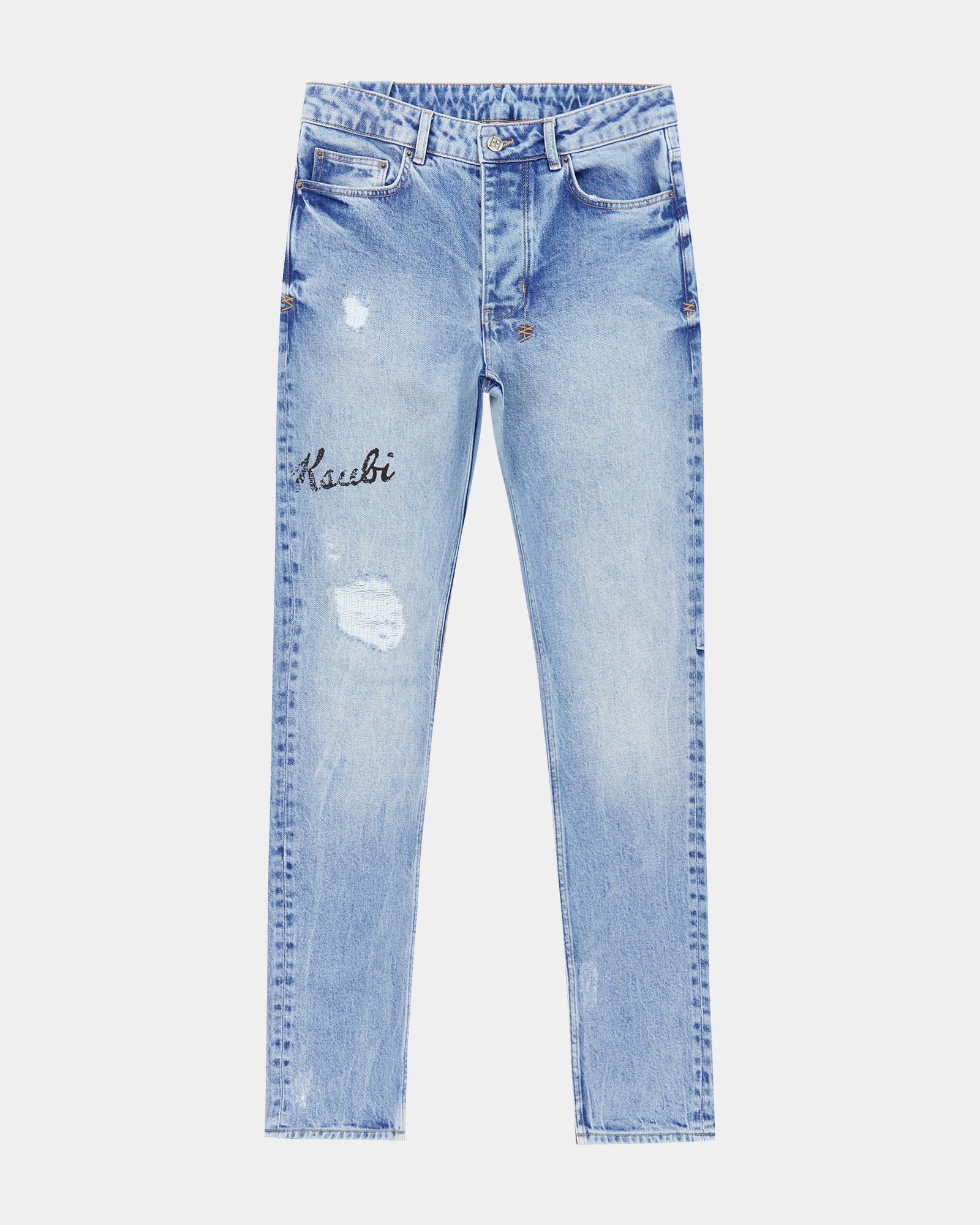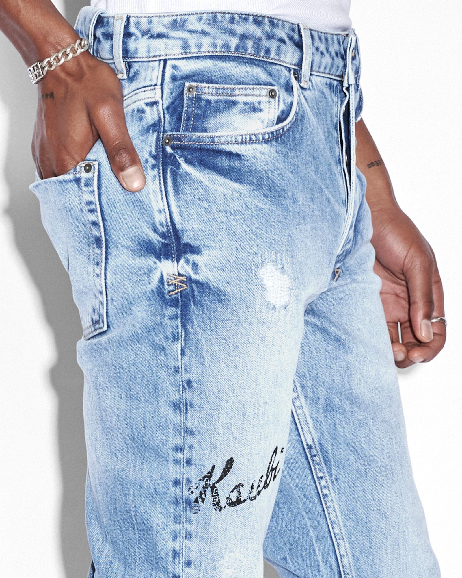 The Chitch Autograph is a slim tapered jean with a mid-long rise and signature dutch tab. Made from a premium comfort stretch denim in a light blue with a marble wash effect. Features seasonal Ksubi artwork printed on wearers leg, and ksubi aging treatments including rip and repair details, vintage wear details and grinded back seams. Finished with signature t-box and 4x4 embroidery and Ksubi branded hardware.