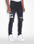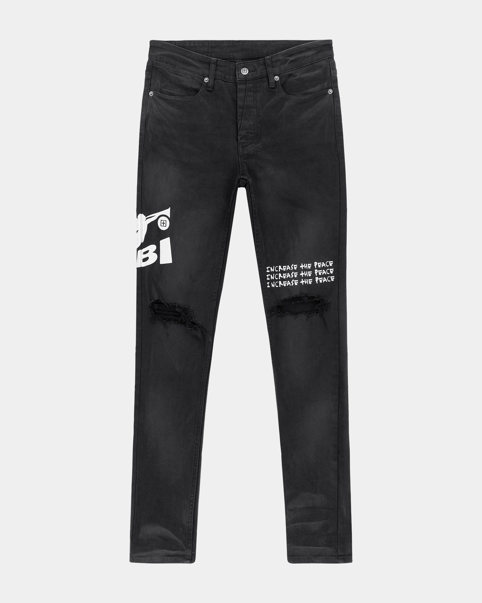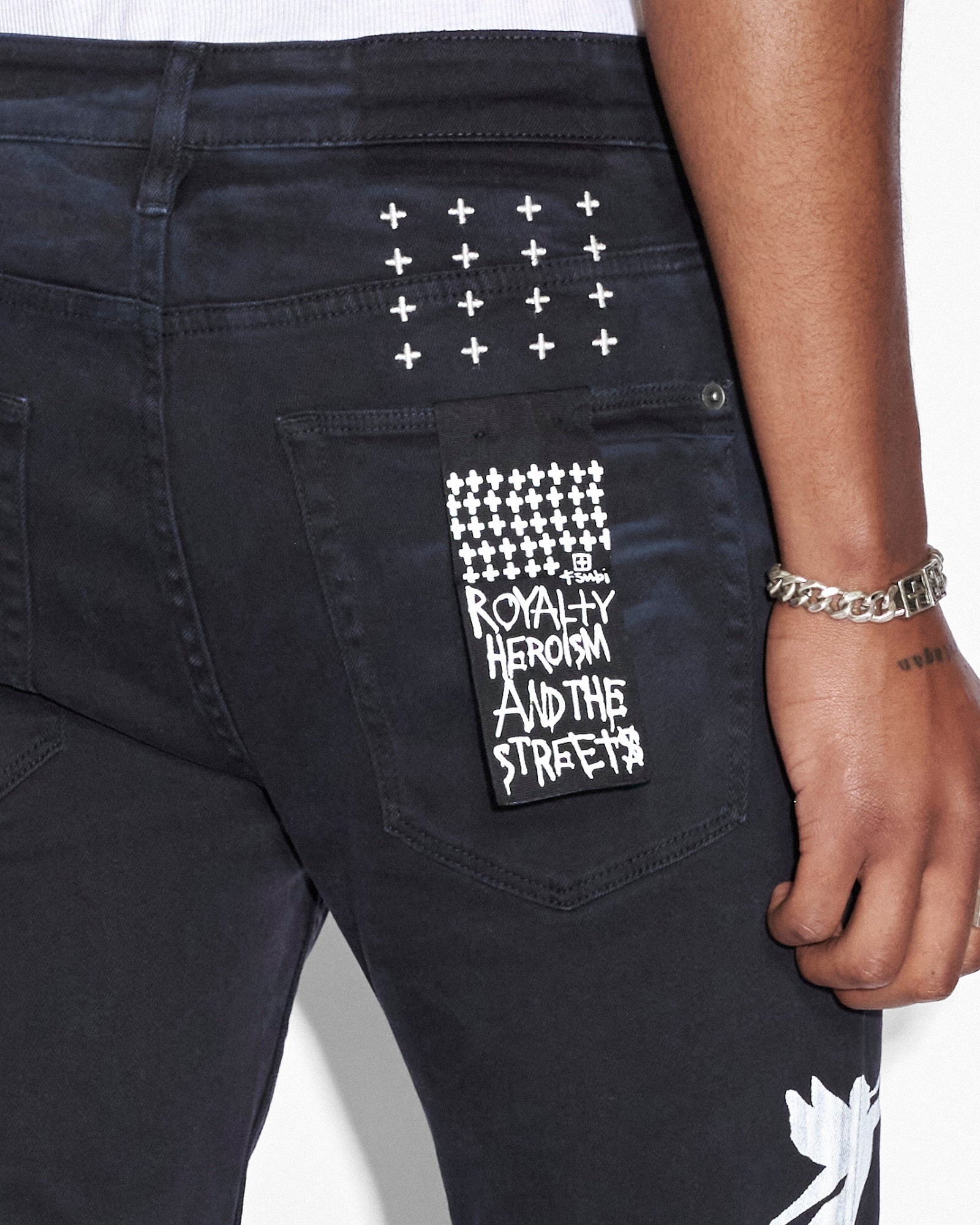 The Van Winkle Ghosted Angel is a mid rise, five pocket full length skinny jean, made from a premium comfort stretch black denim with a smokey wash treatment. The style features screen printed seasonal artwork, deconstruction detailing, unique angled belt loops front fly seam detail. Finished with t-box and 4x4 embroidery, ghost patching detailing and Ksubi branded hardware.