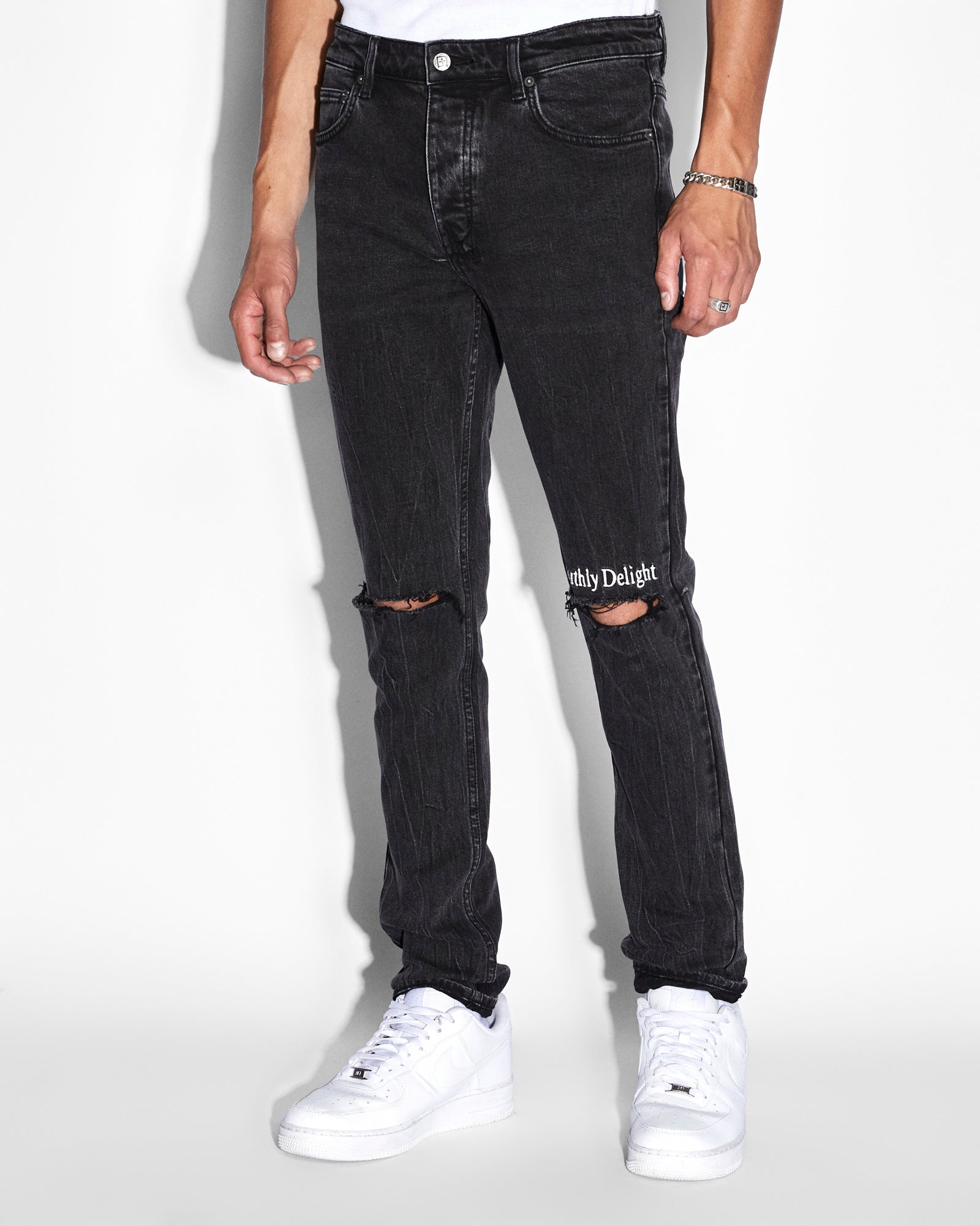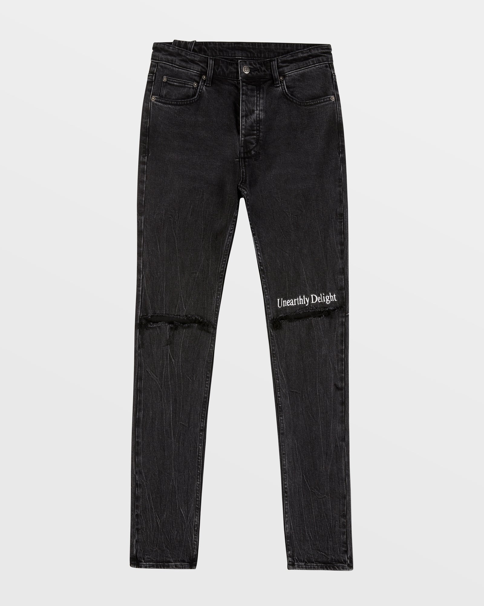 The Chitch Unearthly is a slim tapered jean with a mid long rise, five pockets, a button fly and signature dutch tab. This style features knee deconstruction details and embroidery artwork. Made from premium comfort stretch denim in a washed black colourway with a marbling wash effect. Finished with signature t-box, woven pocket tag, 4x4 embroidery and Ksubi branded hardware.