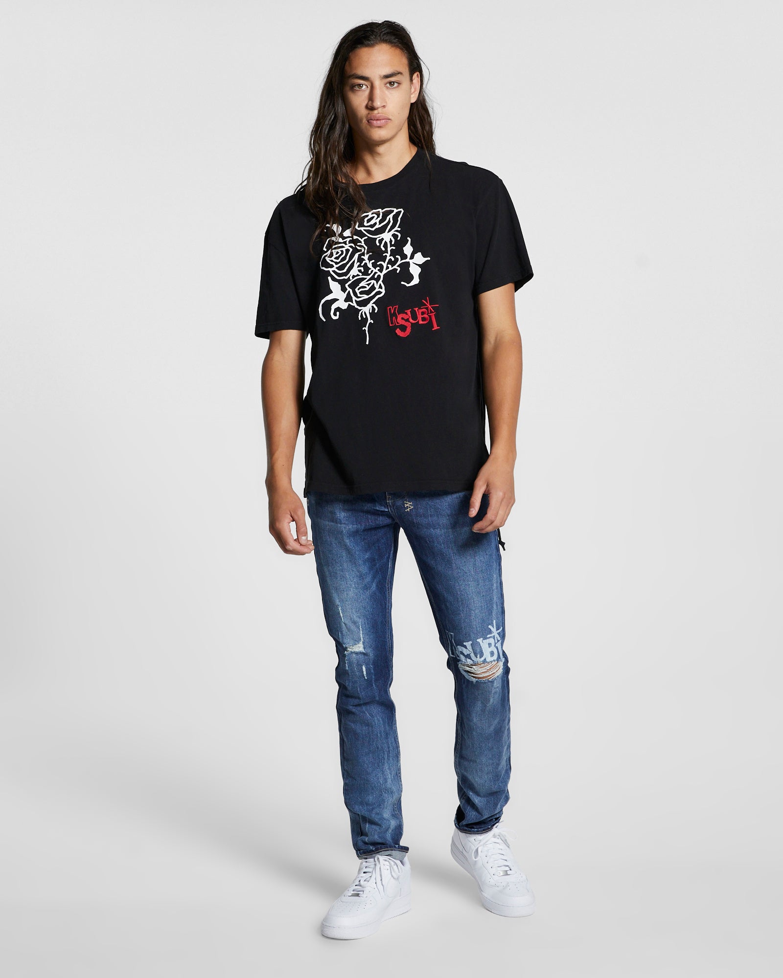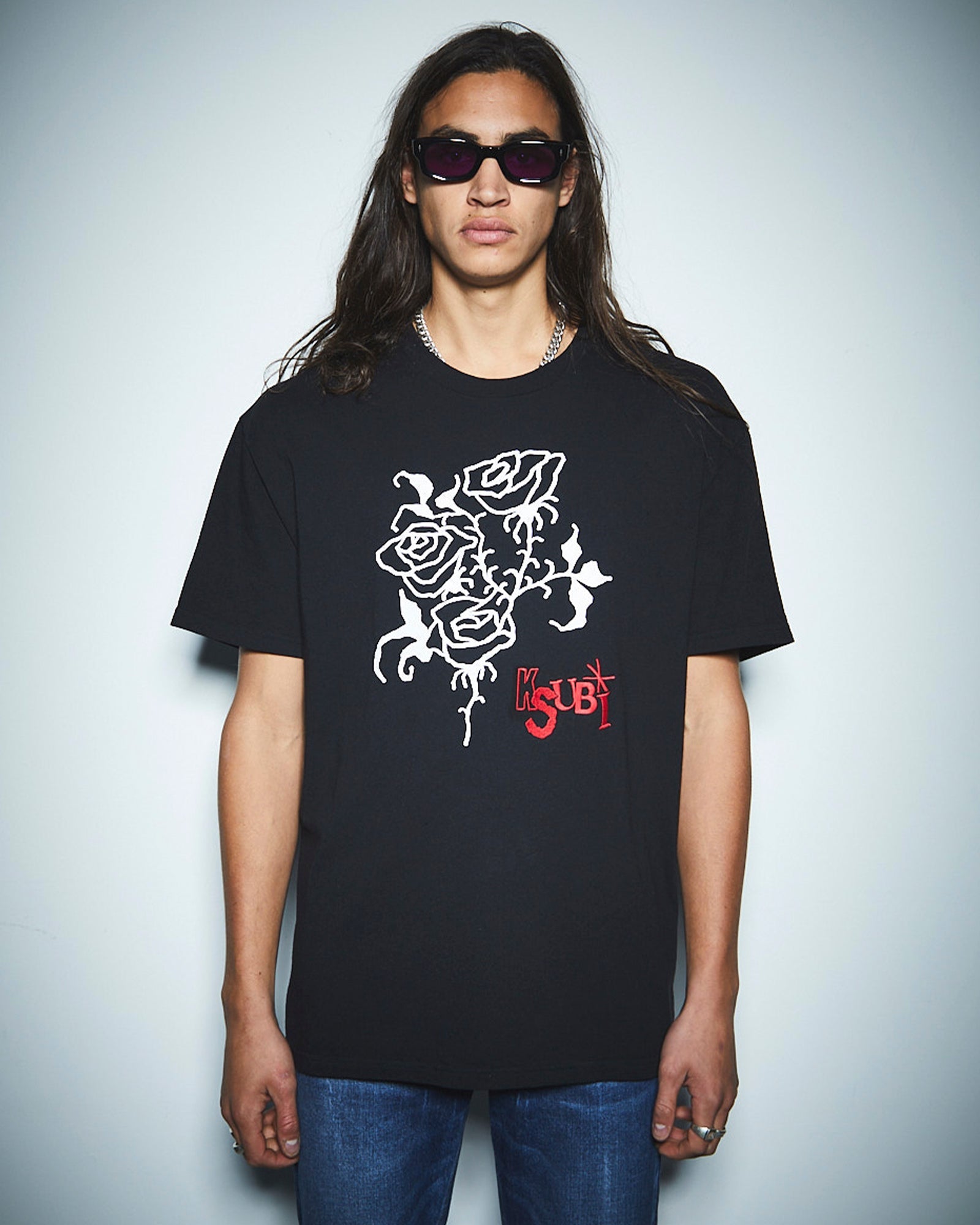 The Rose Biggie Ss Tee Jet Black is made from premium European cotton jersey in black with garment wash. This short sleeve t-shirt has an oversized fit, raw-cut back hem, reverse overlocked side seam and signature rats tail. It is finished with an original art print, art embroidery and Ksubi t-box print.