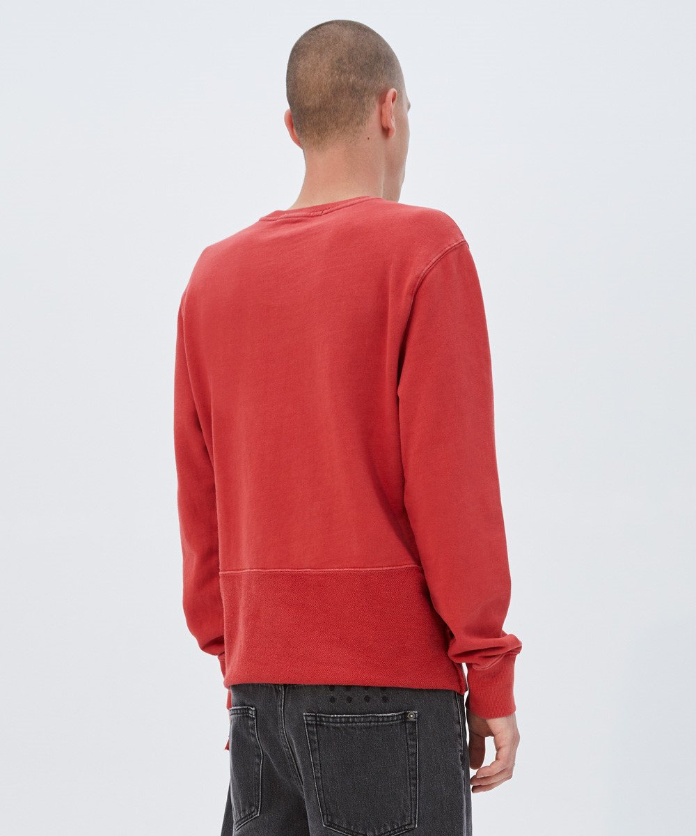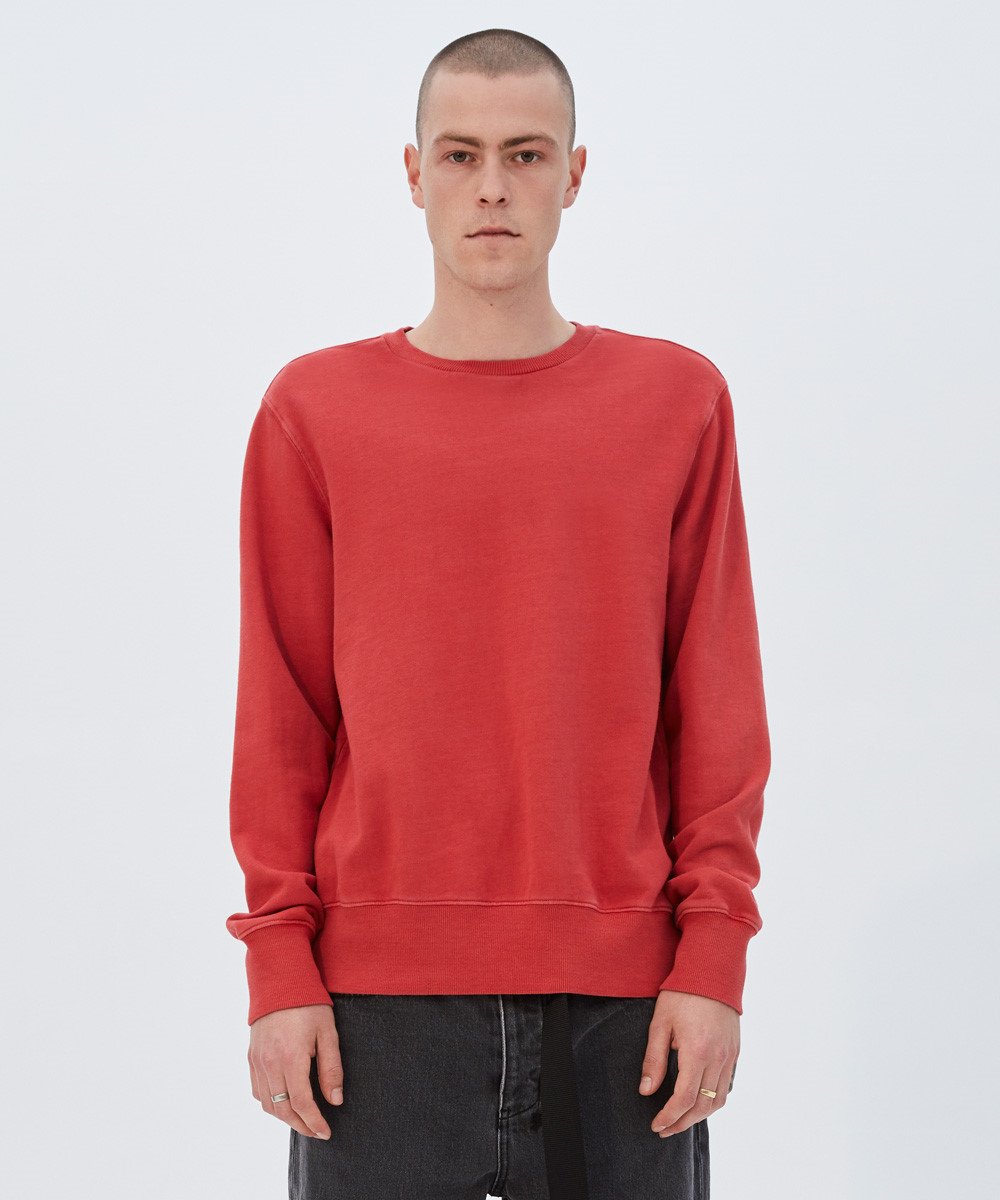 The Seeing Lines Crew is a lightweight crew neck sweatshirt made in a cotton fabrication. This jumper has a fleece backing and features ribbed cuffs and hemline. Made in a red colour way.