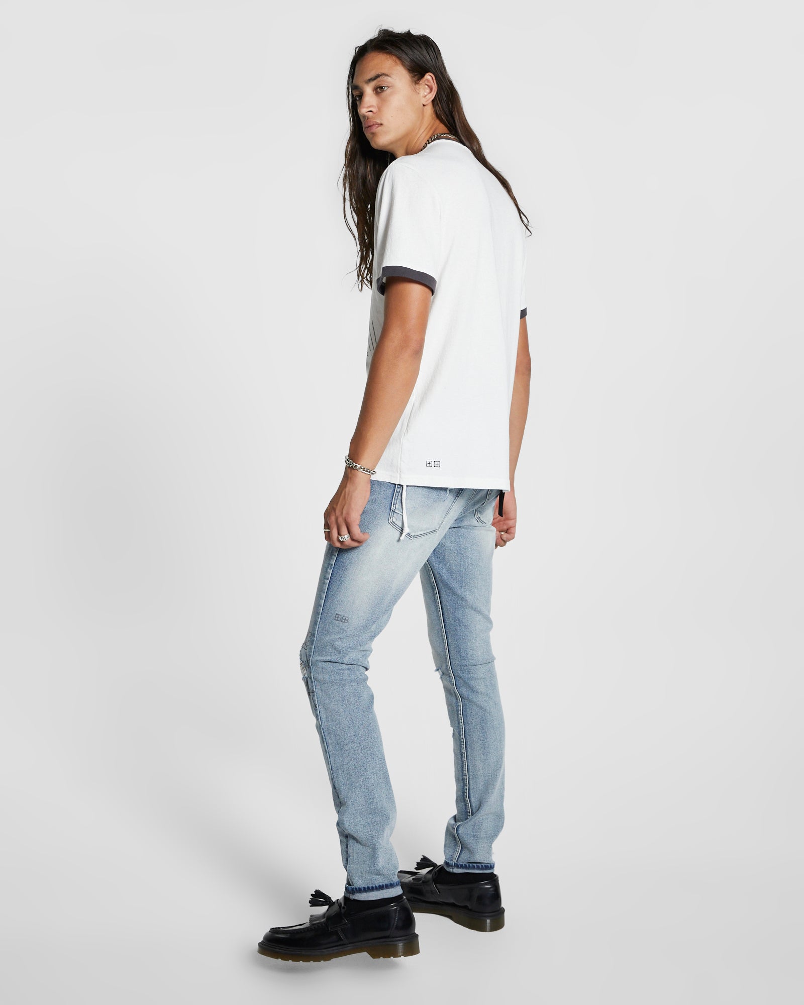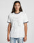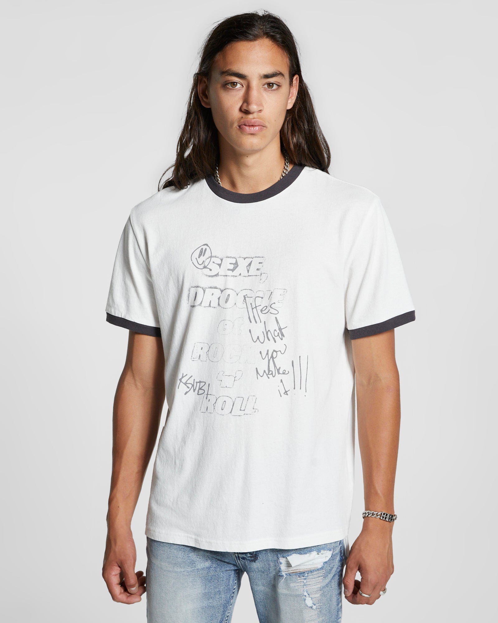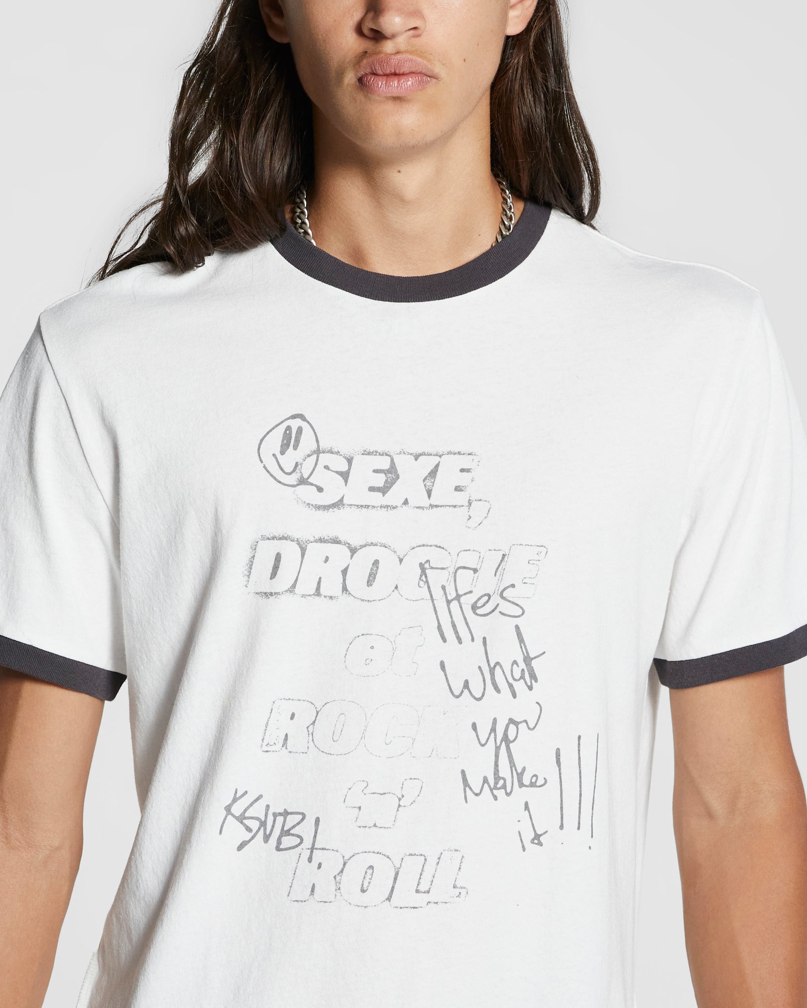 The Sexe Kash Ss Ringer Tee White features original art print, contrast rib detail and Ksubi t-box print. Made from premium cotton jersey in white, it has a regular fit, short sleeves, crew neck, reverse overlocked side seam detail and signature rats tail.