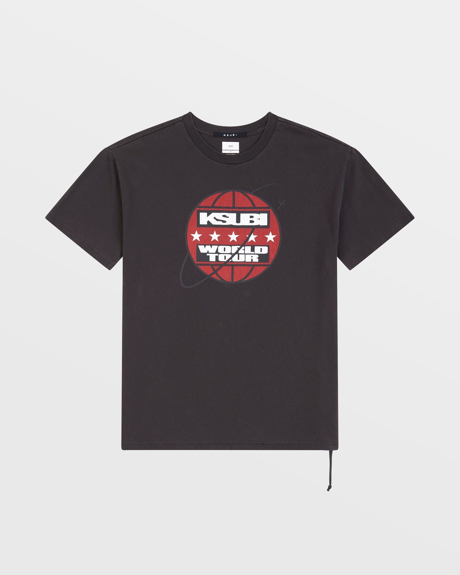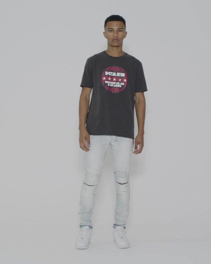 The Tour Biggie Ss Tee Faded Black is made from premium cotton jersey in faded black with an aged wash. This style is an oversized short sleeve t-shirt with a raw-cut back hem, reverse overlocked side seam and our signature rats tail. This style is completed with a screen printed original artwork and a Ksubi t-box print. During colder seasons, wear the 'Tour Biggie Hoodie Faded Black' to match.