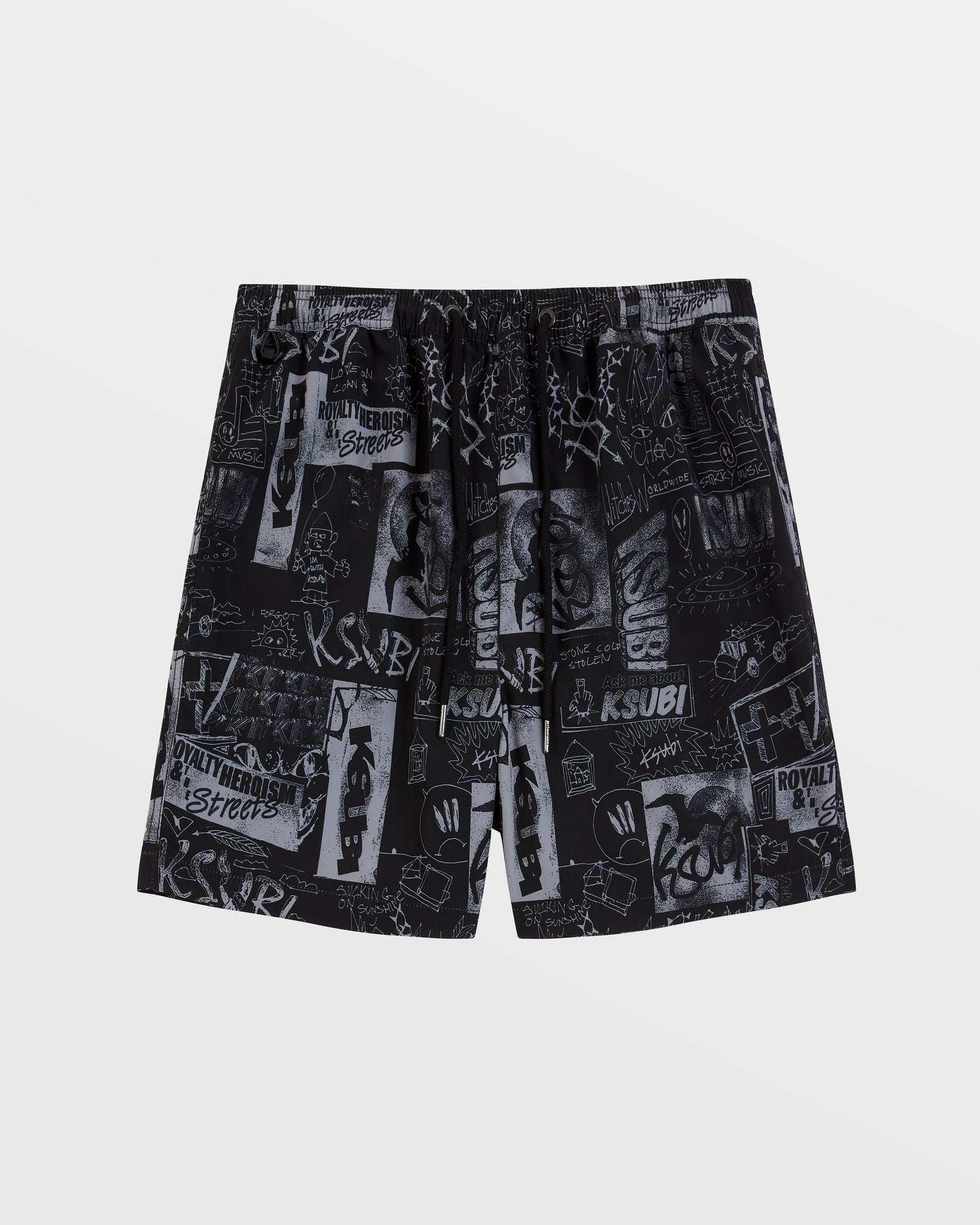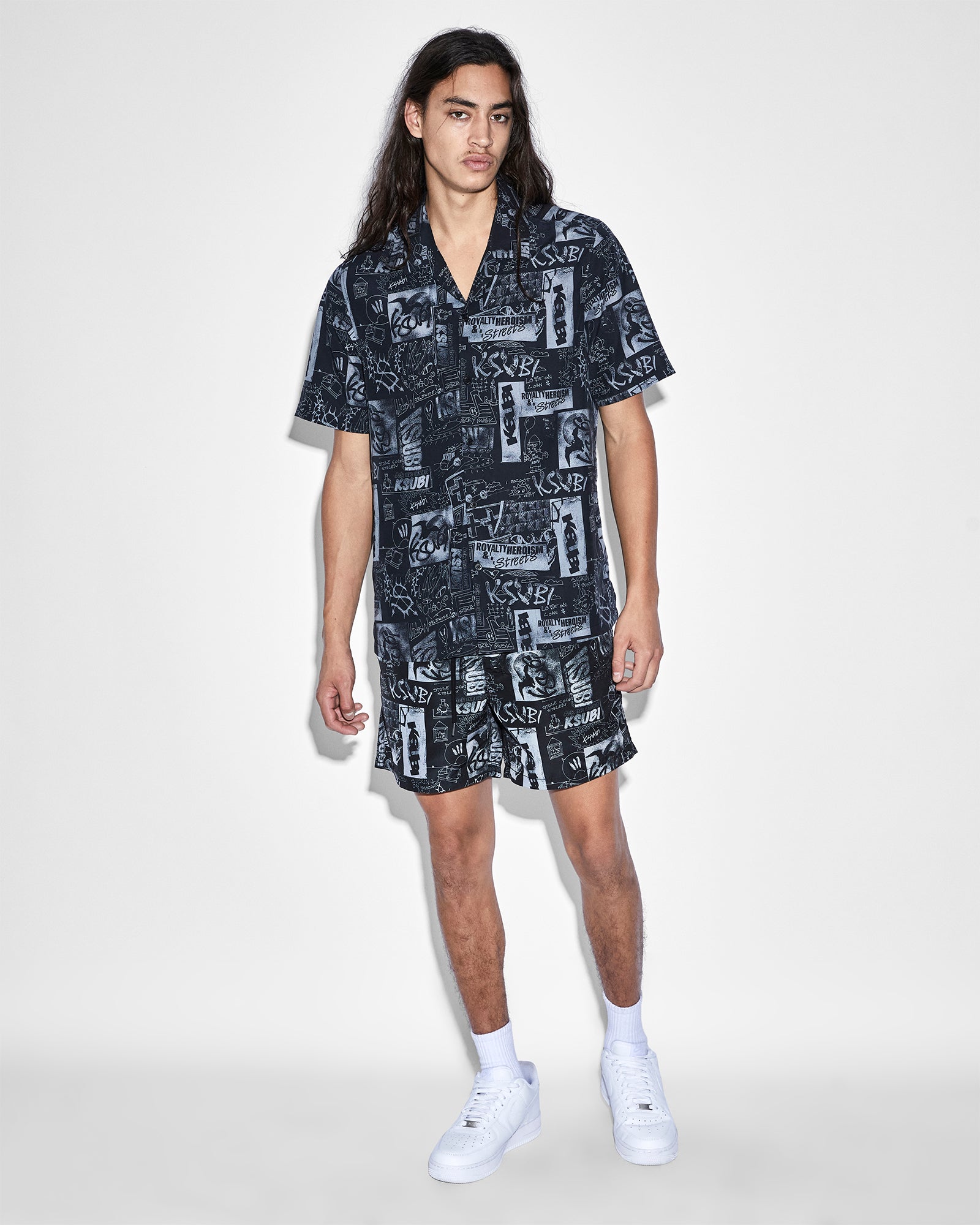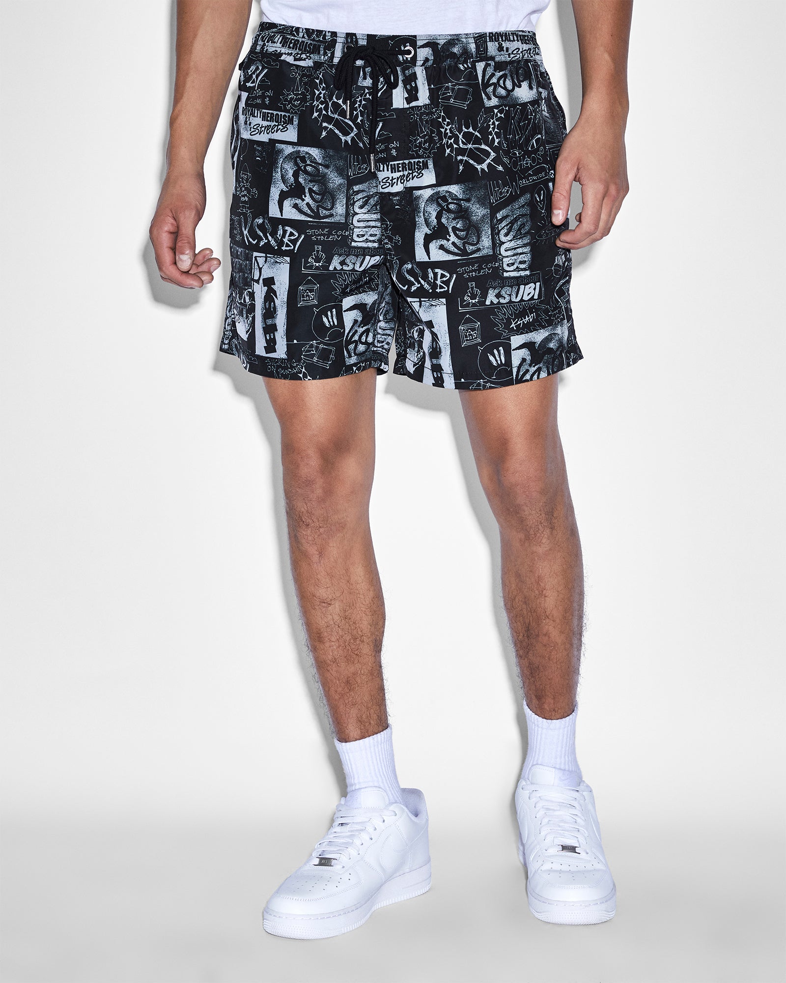 The Mash Up Boardshort Black is a regular fit short branded with metal trims and the iconic Ksubi t-box. This style is made from a premium water resistance fabric detailed with digitally printed art and designed with an elastic waistband and waist drawstring. Pair with the 'Mash Up Resort Shirt Black' for a completed look.