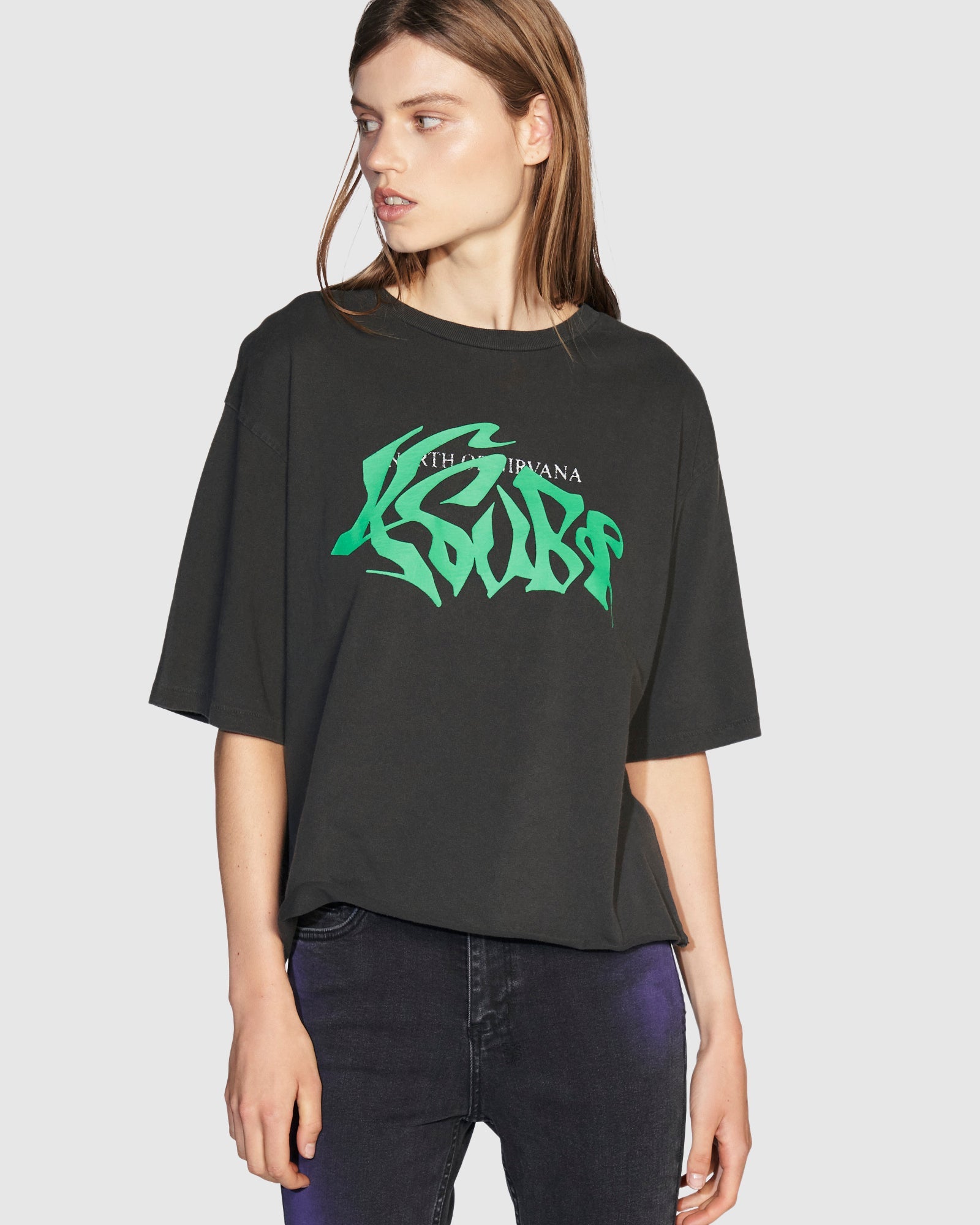 The Worldwide Nirvana Ss Tee Black comes with front and black smash prints and signature Ksubi branding. It has an oversized t-shirt fit with a crew neck, dropped shoulders, short sleeves and rats tail detail. This style is made from premium cotton jersey in black with a vintage wash.