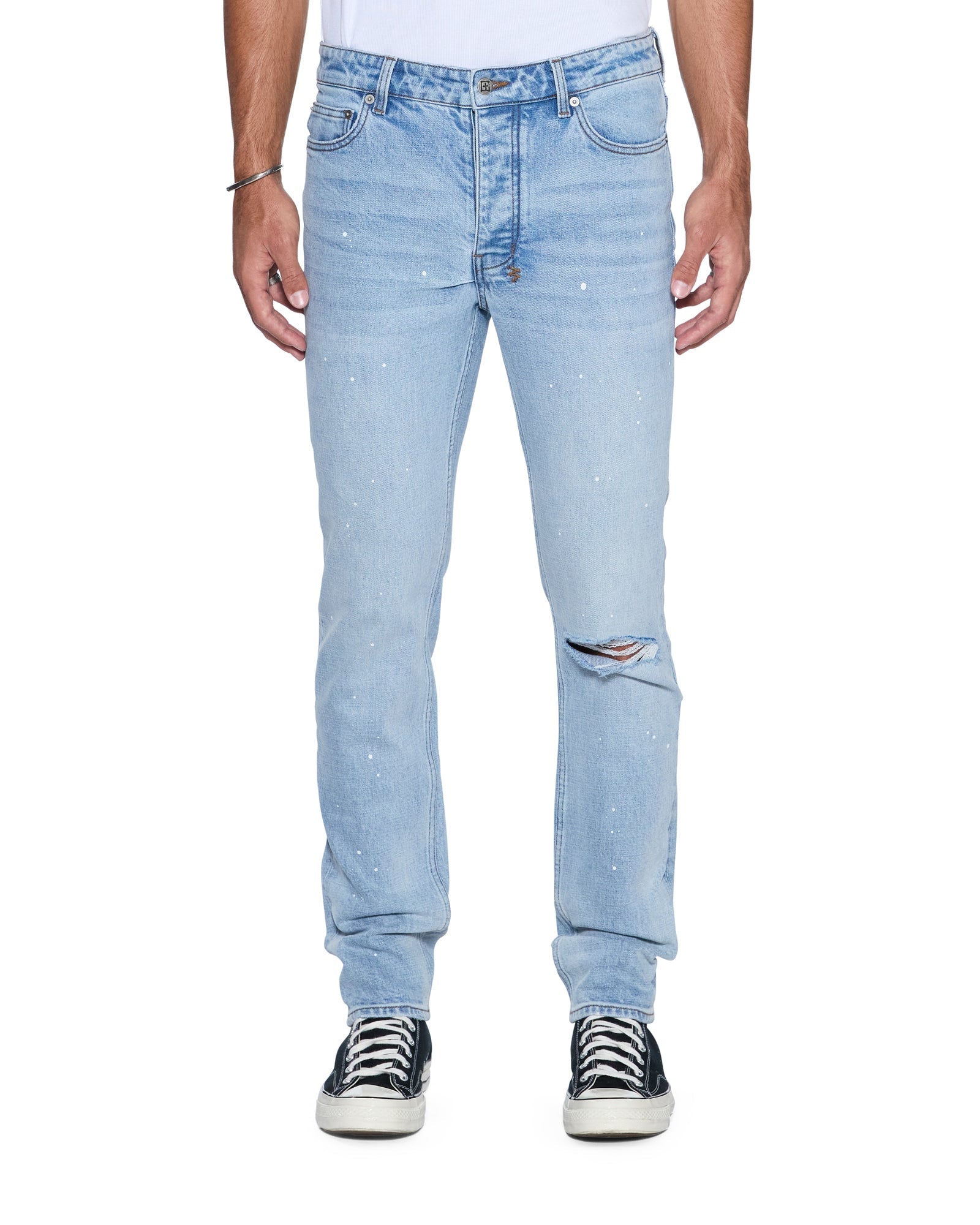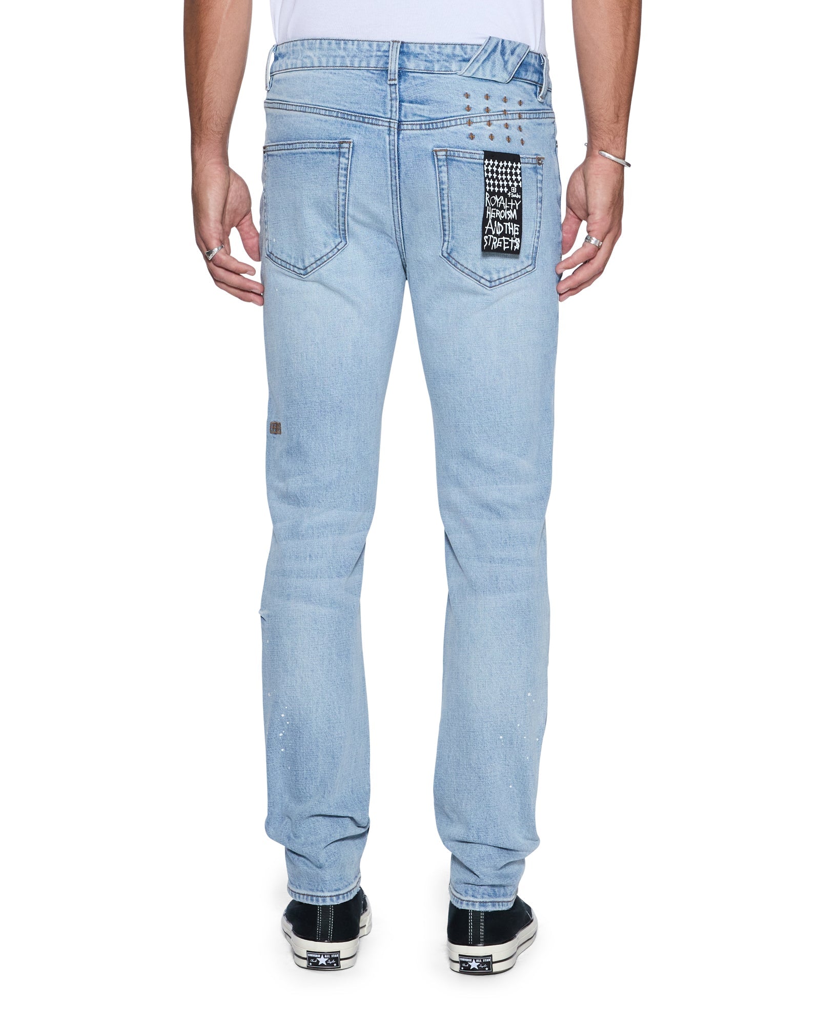 The Chitch Duke Blue jean is a mid rise slim fit denim with a tapered leg featured in a vintage blue colourway with worn-in highlights. Constructed from a premium comfort stretch heavyweight denim, this jean features Ksubi branded hardware, five pockets, trashing at the and knee, signature 4x4 embroidery on the back and removable back pocket tag.