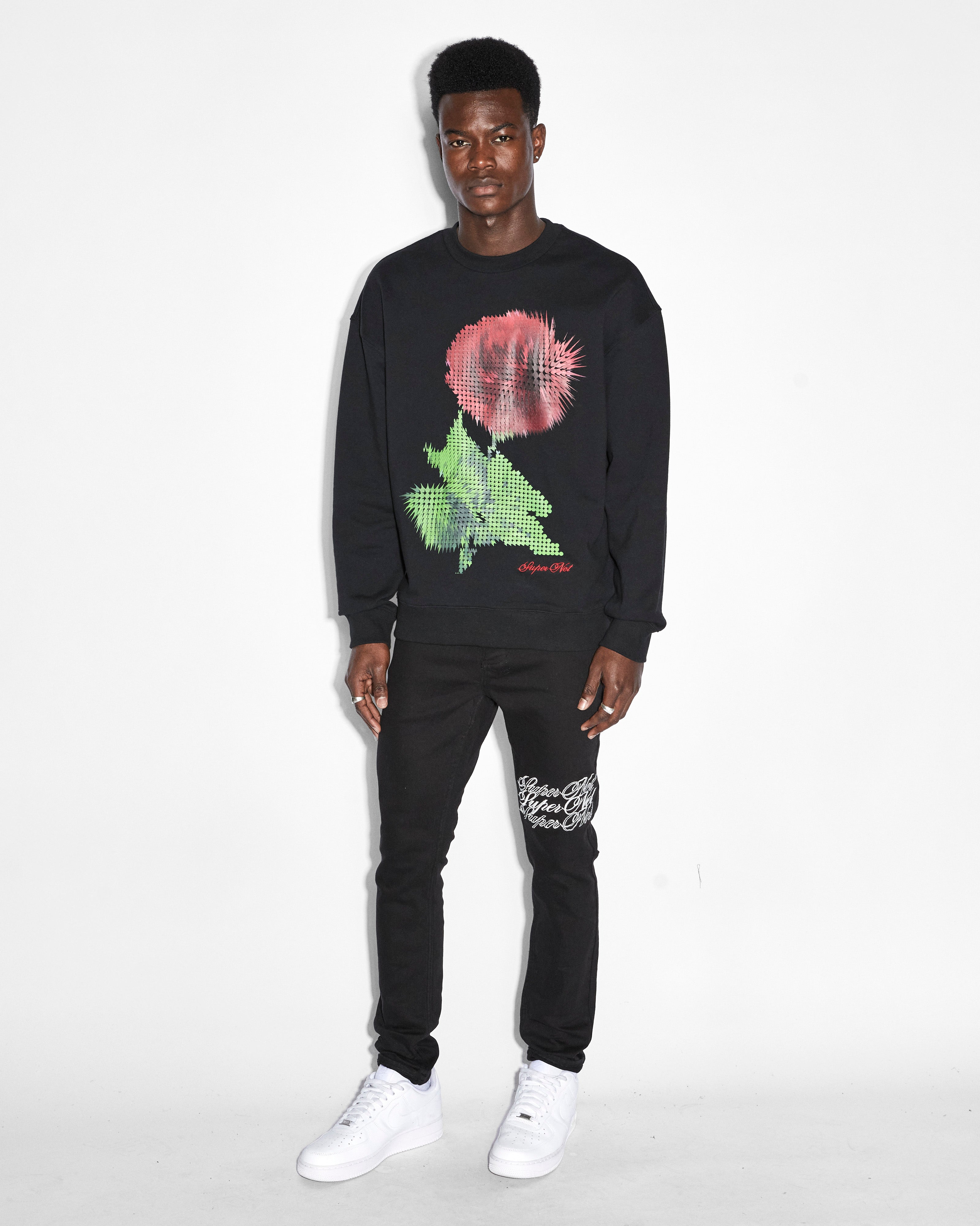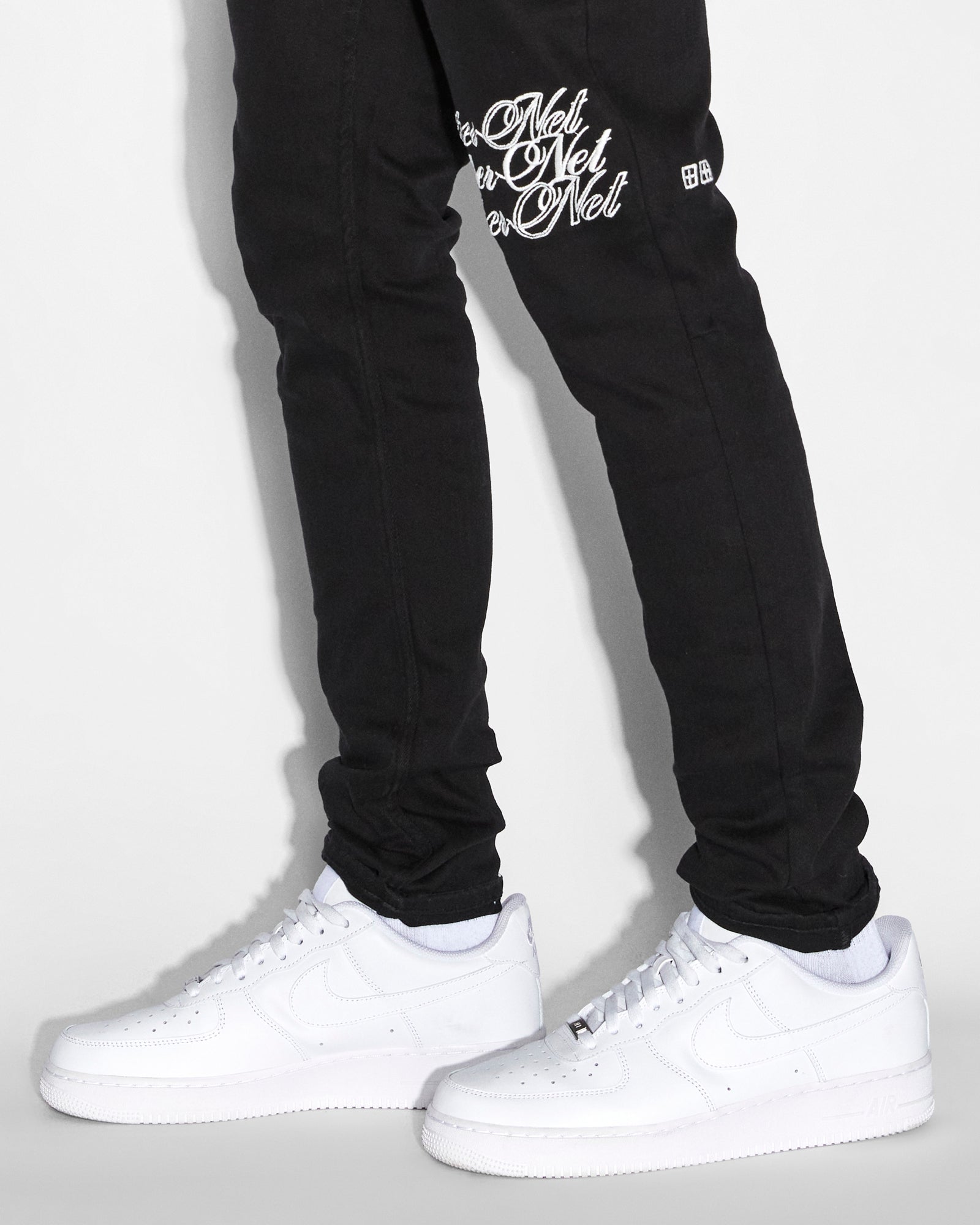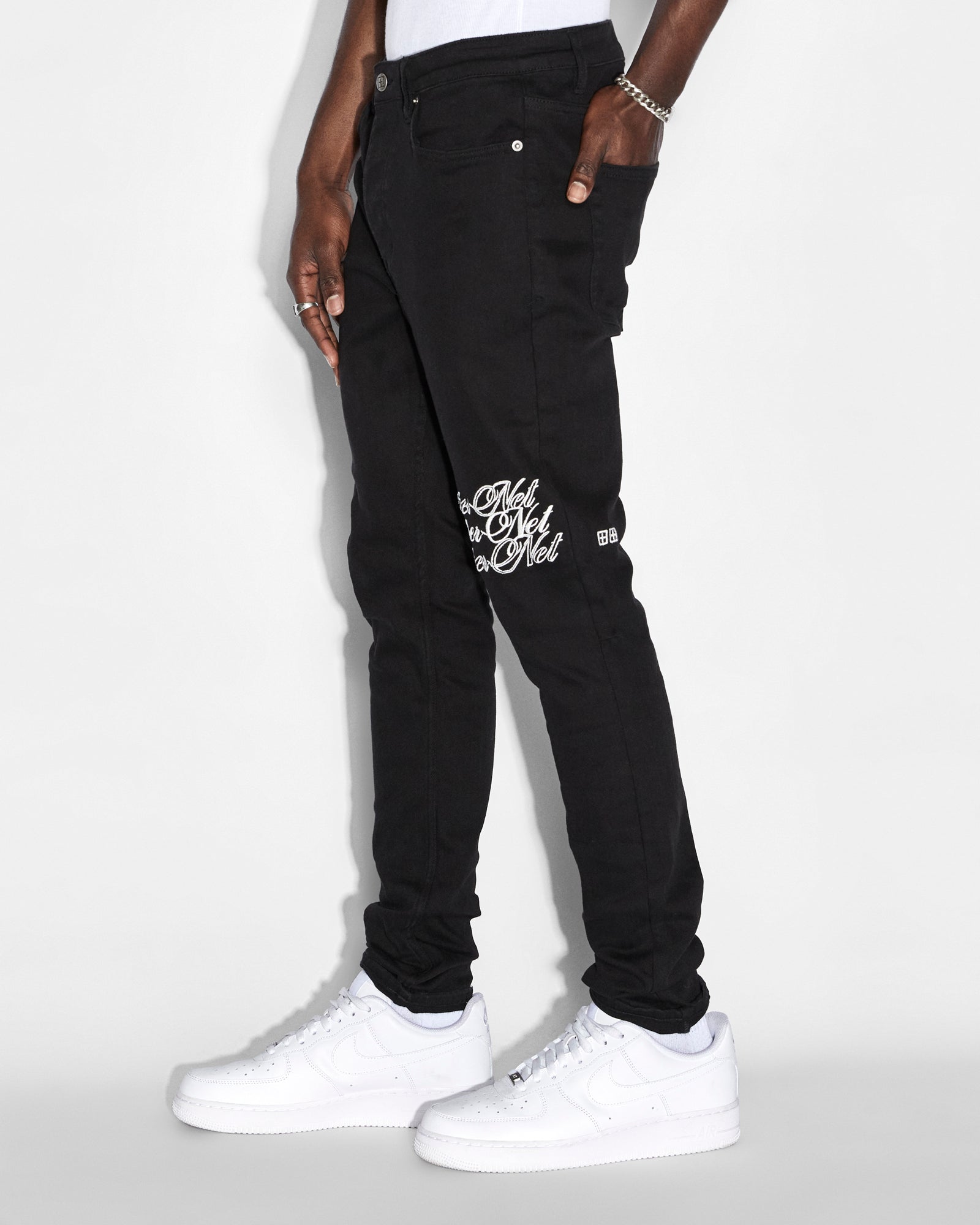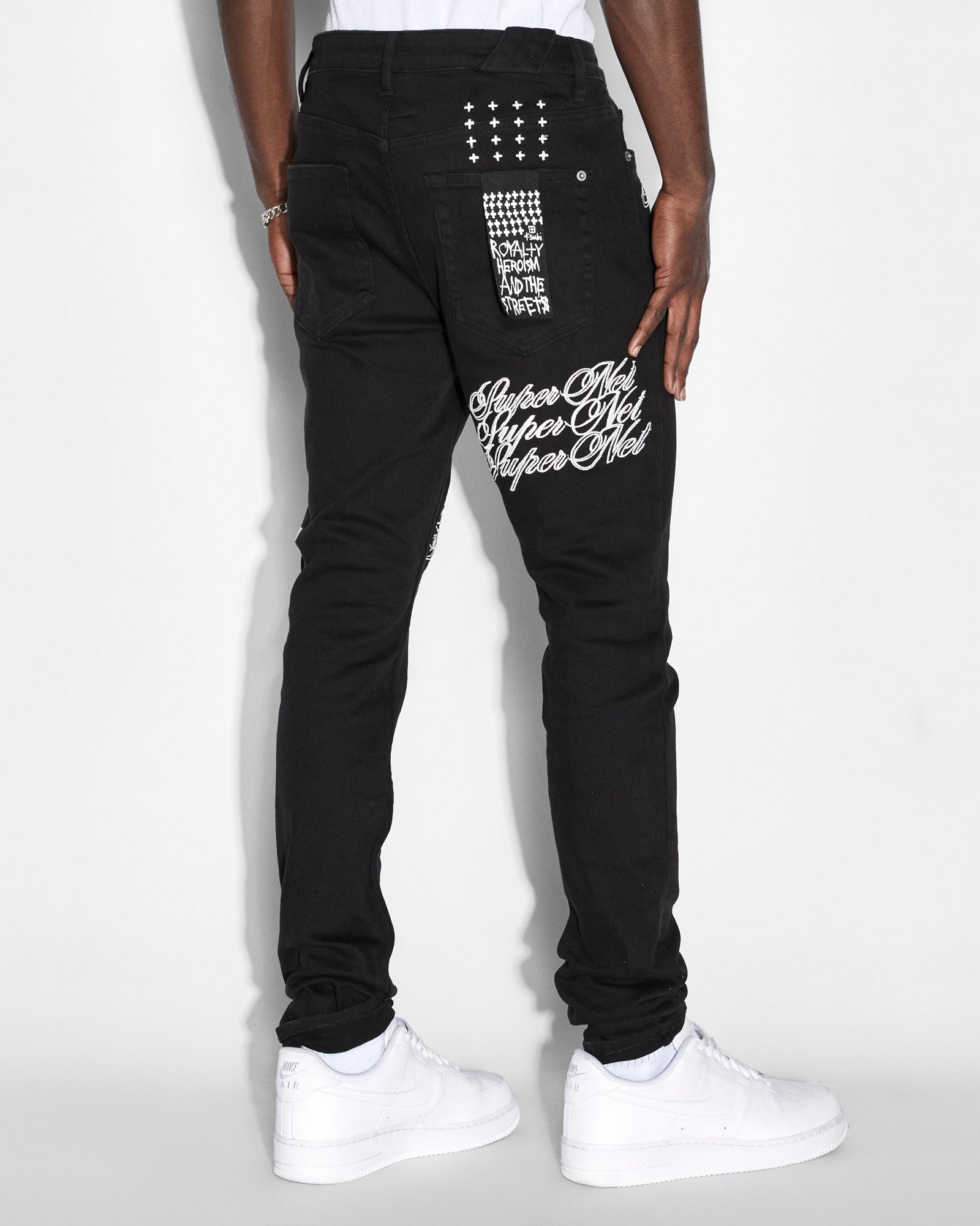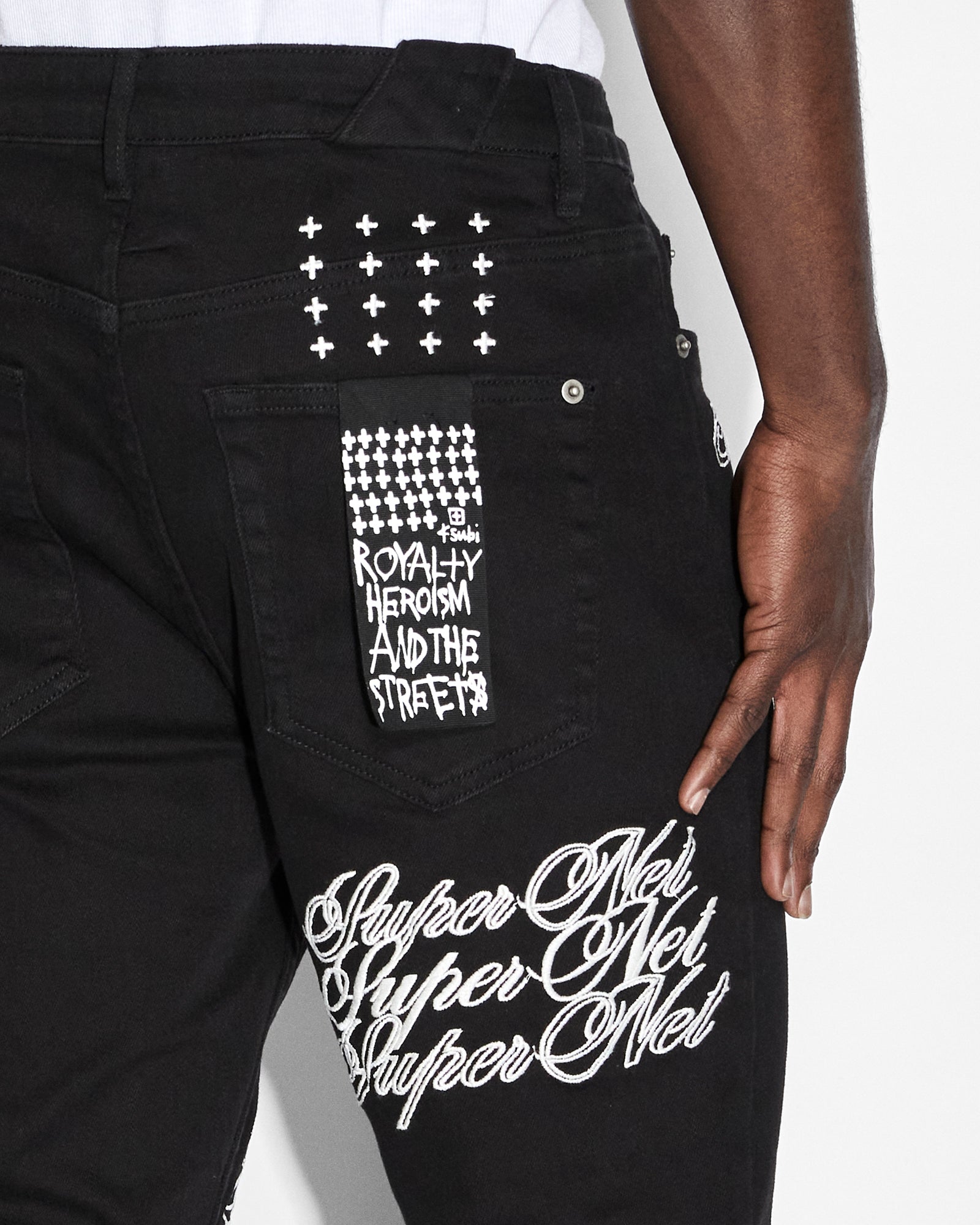 The Chitch Scripted is a five pocket, slim tapered jean with white embroidered text on the front and back. This jean is made from premium comfort stretch denim in a jet black colourway and is designed with a button fly and unique Ksubi angled dutch tab and tucks. Finished with our signature Ksubi branding.