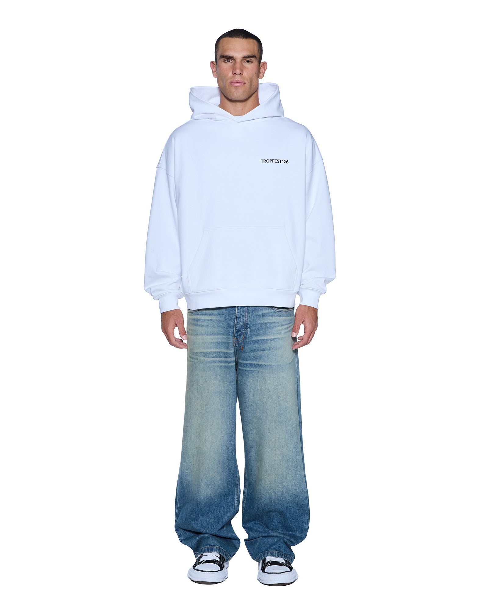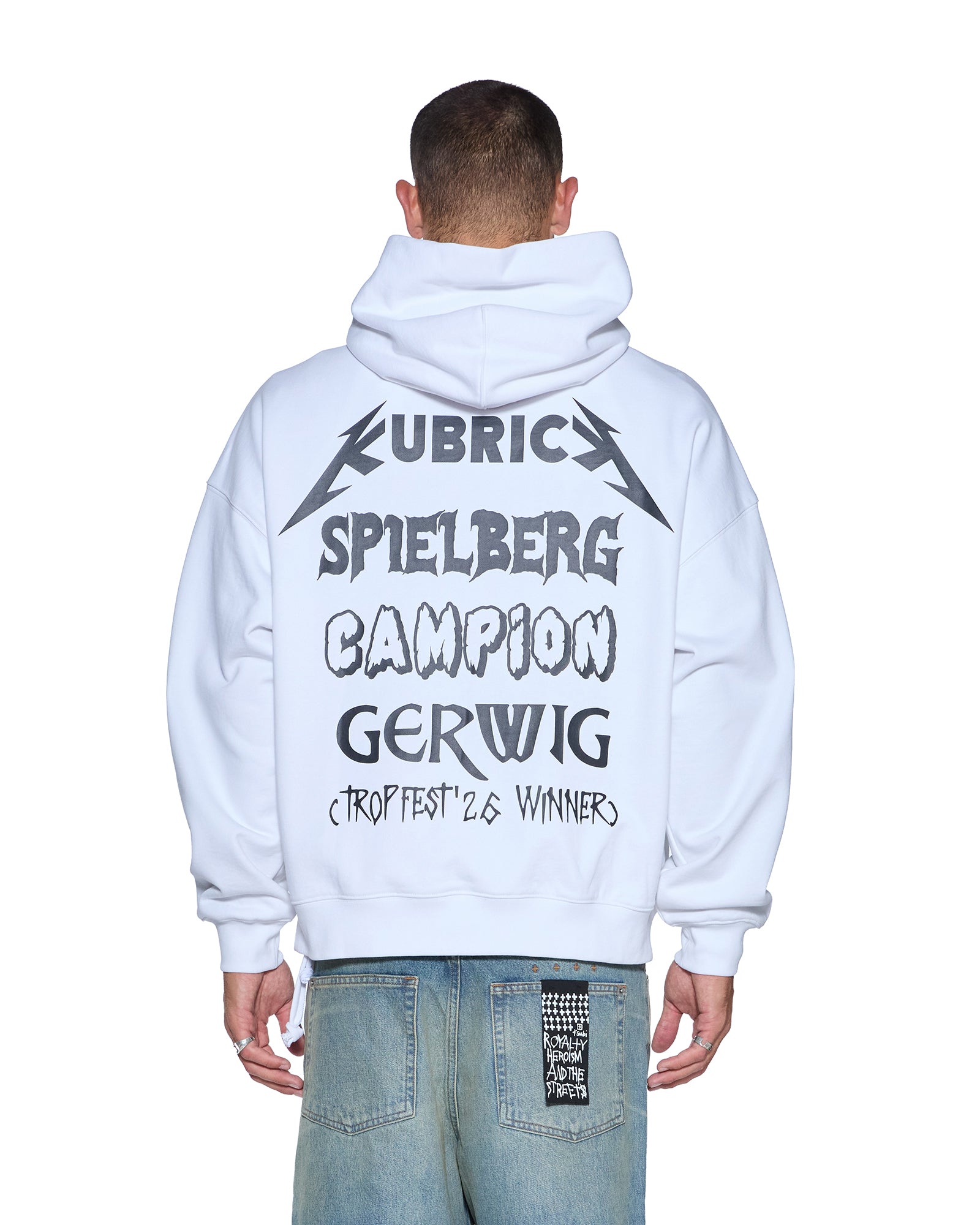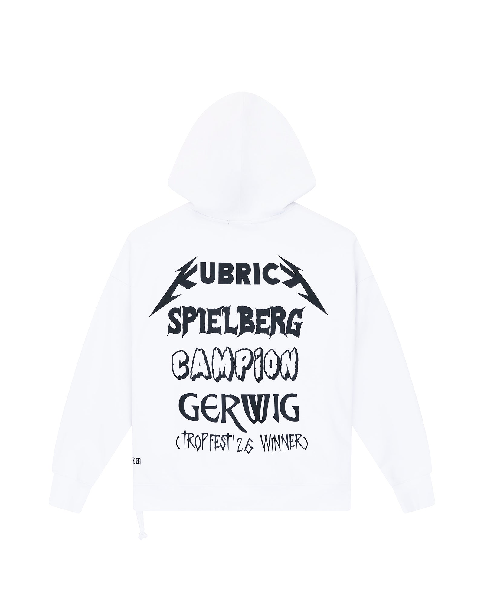 The Director Ekcess Hoodie Tru White is a boxy oversized fit hoodie with a single-piece hood, front pouch pocket, and signature rats tail detail. Made from a premium loopback fleece in overdyed black featuring Tropfest x Ksubi artwork on the front and back and is finished with t-box and 4x4 embroidery branding.