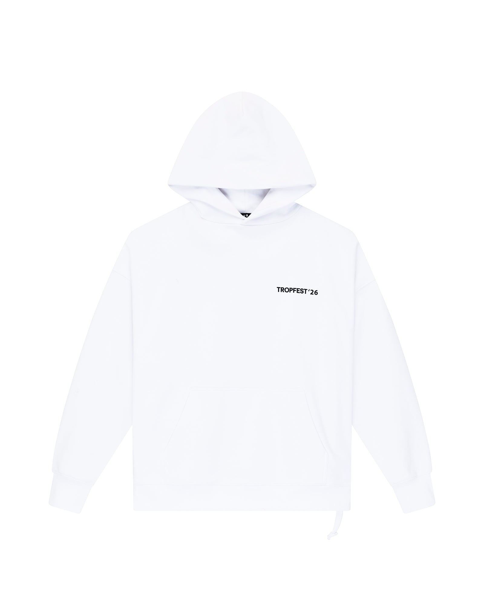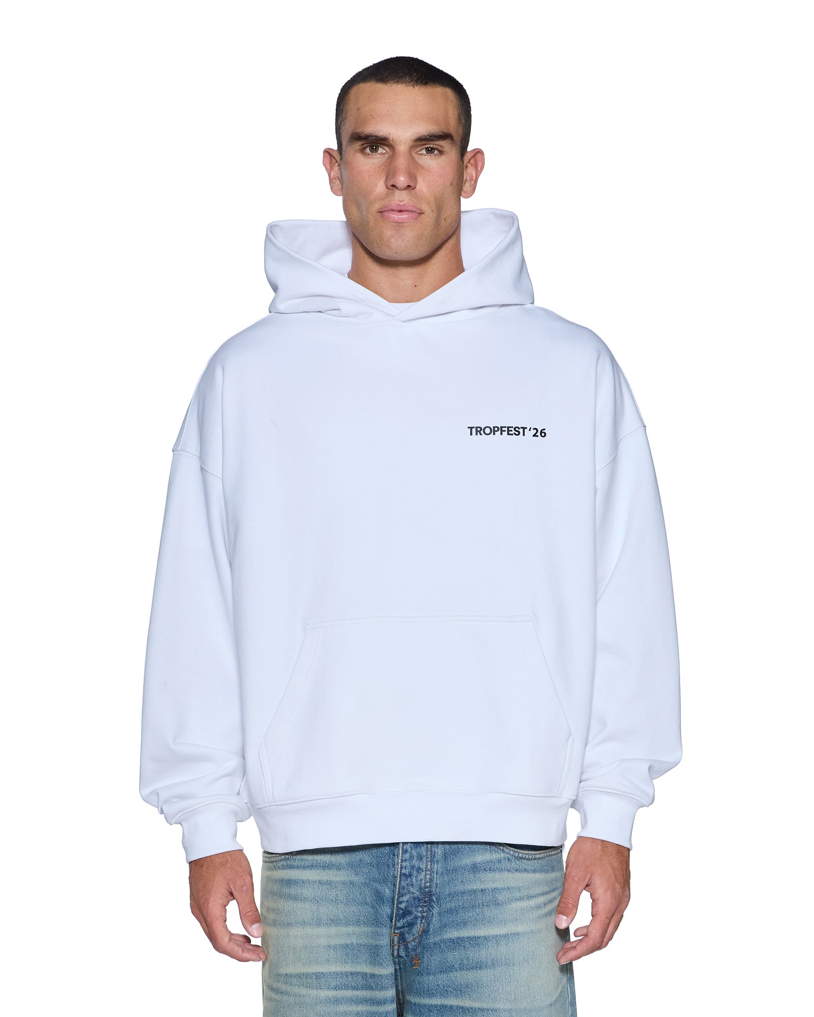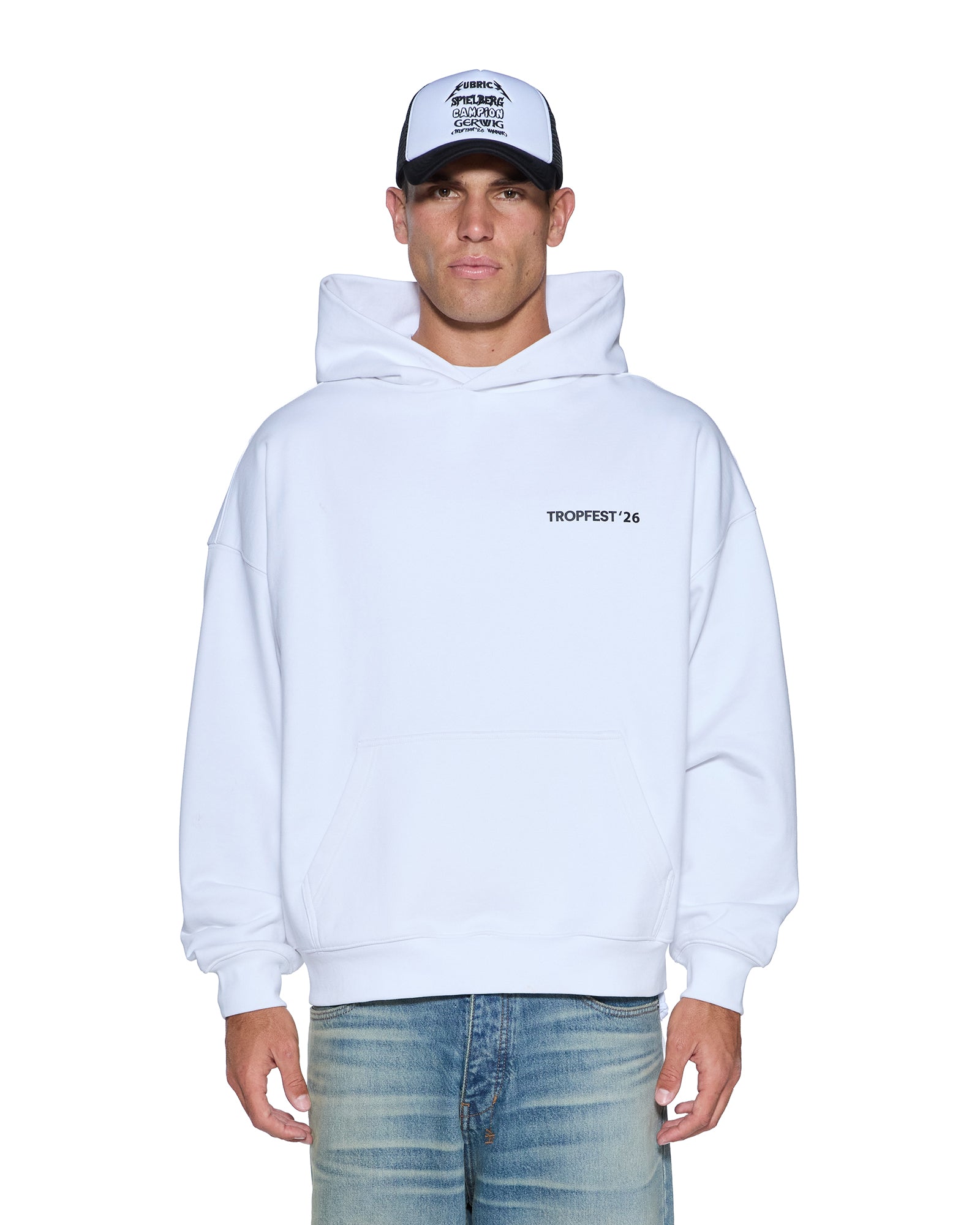 The Director Ekcess Hoodie Tru White is a boxy oversized fit hoodie with a single-piece hood, front pouch pocket, and signature rats tail detail. Made from a premium loopback fleece in overdyed black featuring Tropfest x Ksubi artwork on the front and back and is finished with t-box and 4x4 embroidery branding.