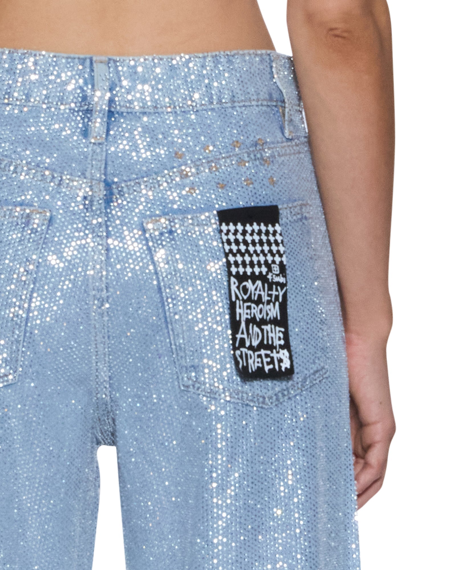 The Empire Jean High Rollers is a relaxed straight-leg, full-length jean with a true mid-rise. Made from premium European rigid denim in light blue with an enzyme-soft wash, it is densely embellished with all-over diamante hotfix crystals and features classic five-pocket styling, anti-silver branded hardware, T-box and 3x4 embroidery, and a removable pocket tag on the wearer's right back pocket.