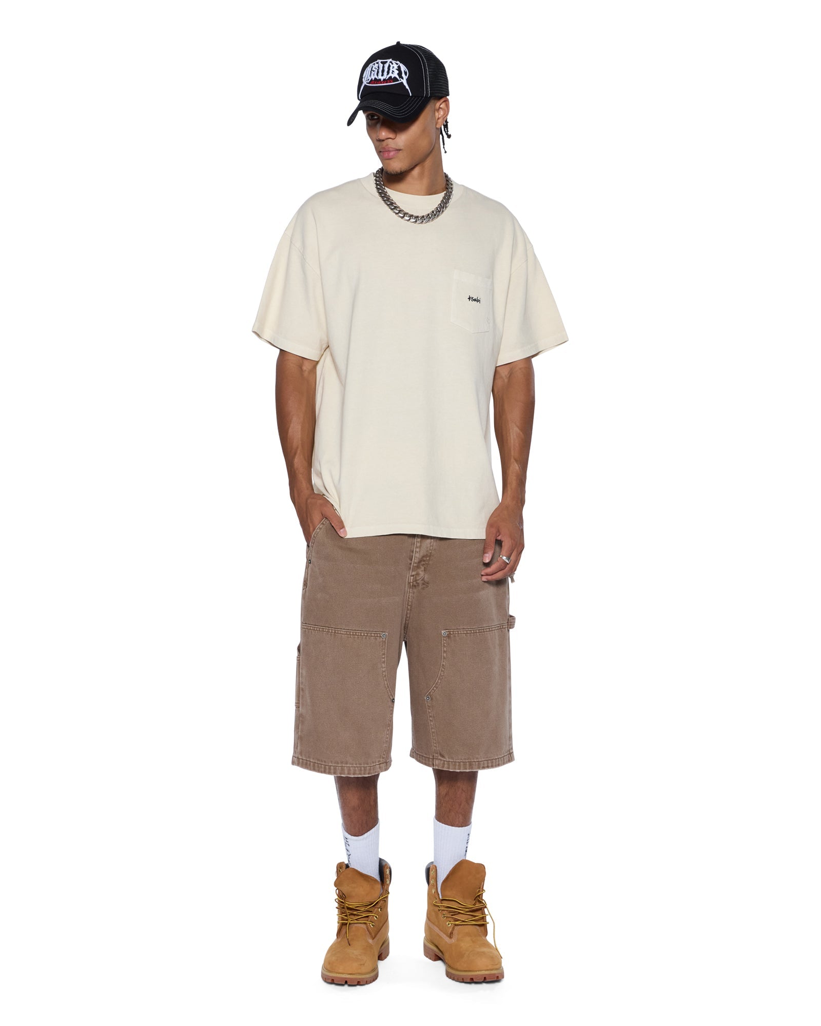 The Est Ekcess Pocket Ss Tee Desert is a boxy oversized short sleeve tee with dropped shoulders, chest pocket with W-bar tack embroidery and reversed overlocked side seams. Made from garment-dyed premium cotton in Desert, it showcases Ksubi's 1999 embroidered artwork and is finished with T-box and 4x4 embroidery.