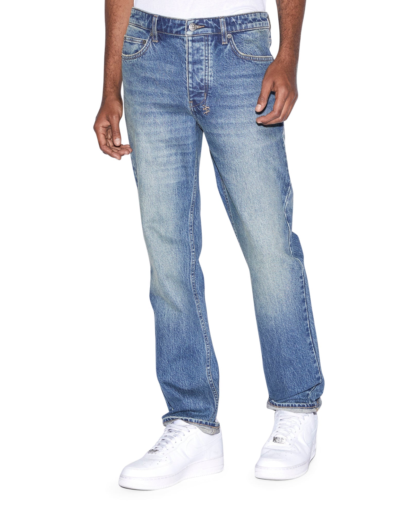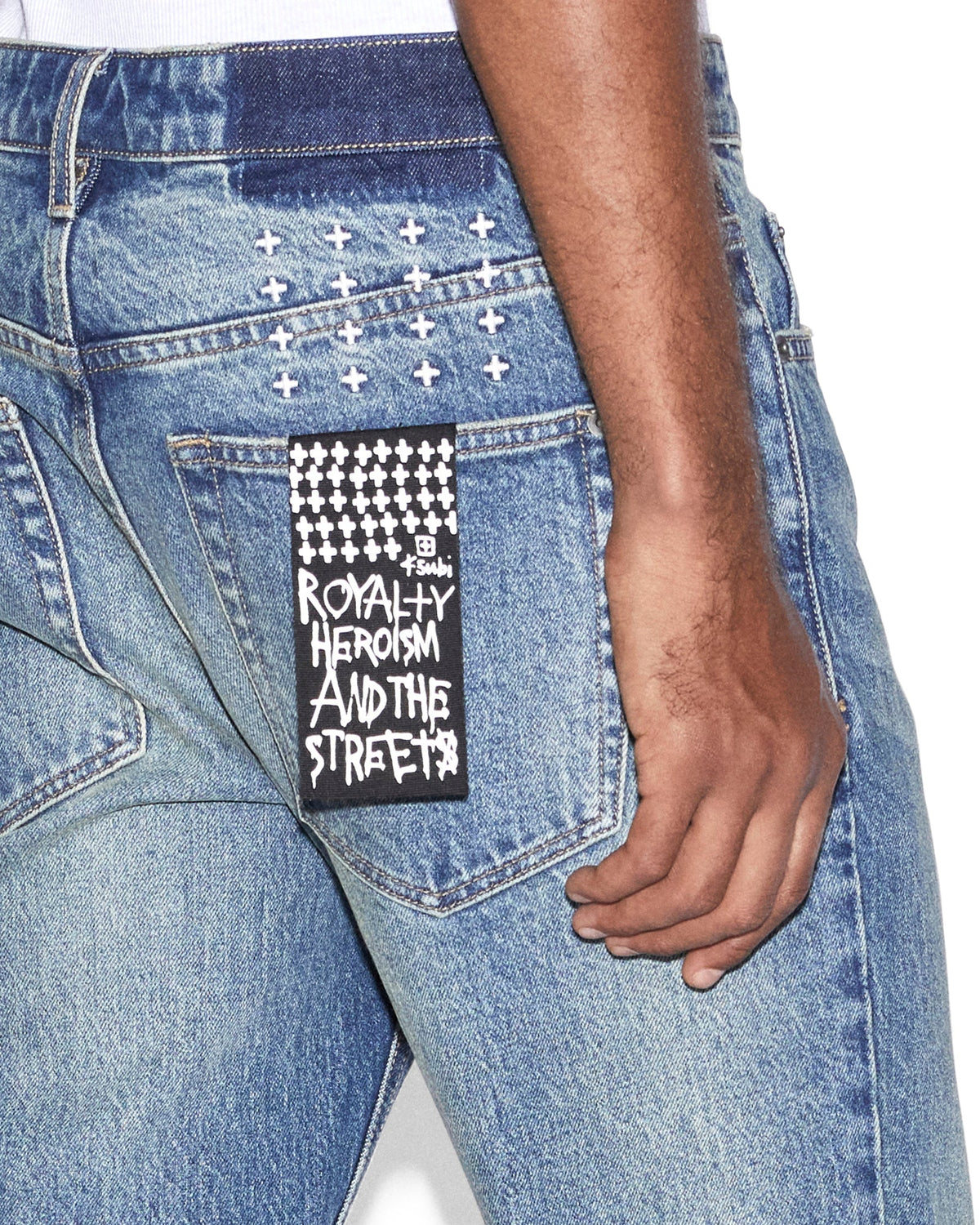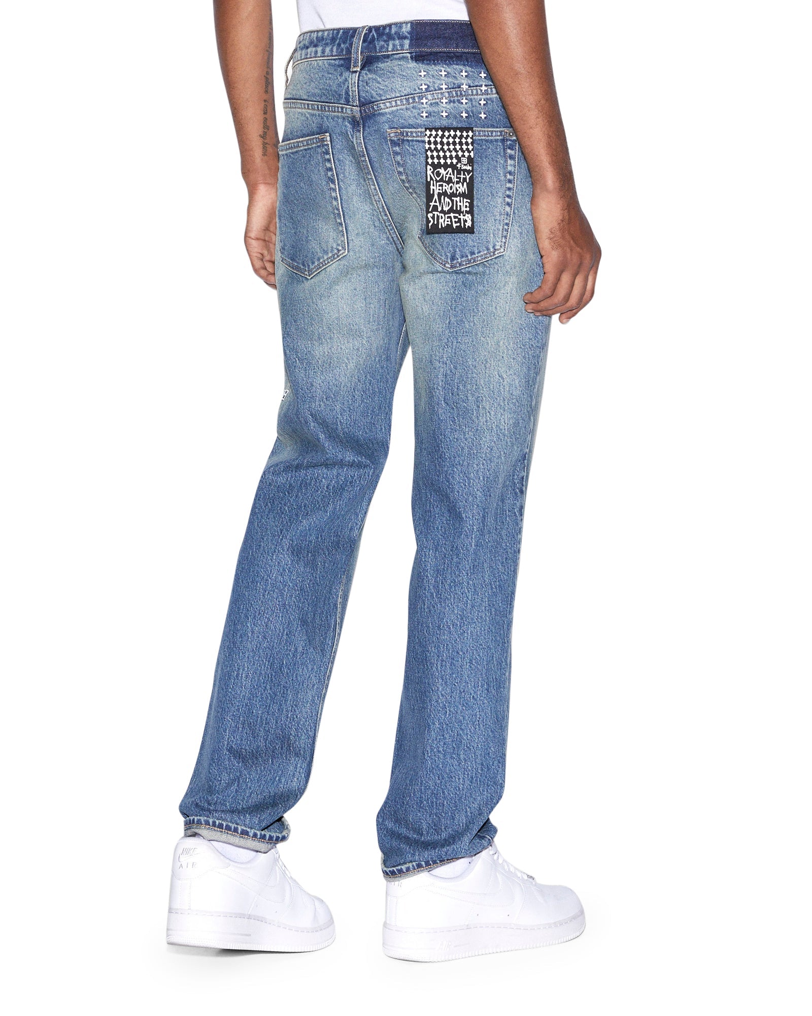 The Hazlow Chronicle is a mid-rise waisted jean with a full-length leg. Crafted from comfortable stretch indigo denim, in a light stone wash colourway with aging treatments. The standout feature of these jeans is the metal cross hot-fix application detailing down the leg. These jeans are finished with Ksubi's signature t-box, 4x4 embroidery and branded hardware.