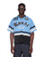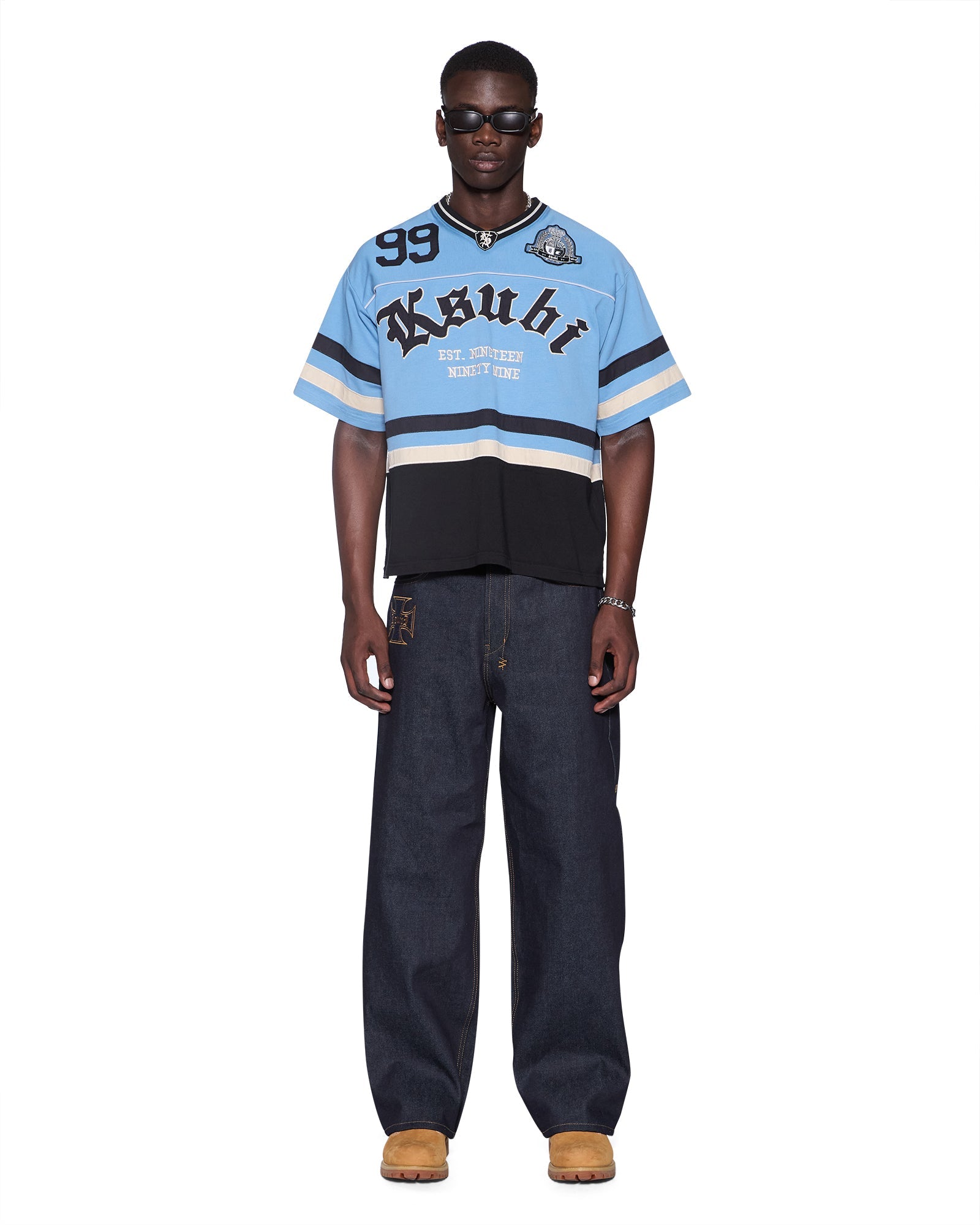 The Idol Duke Short Sleeve Jersey Nue Blue is a boxy oversized tee with a waist-length finish, exaggerated shoulder drop, reverse overlocked side seams and signature rats tail, complete with a v-neck opening. Crafted from heavyweight cotton jersey in a blue, black and ecru panelled design, it features multiple textural artwork applications across the front and back and is finished with signature t-box and 4x4 branding.