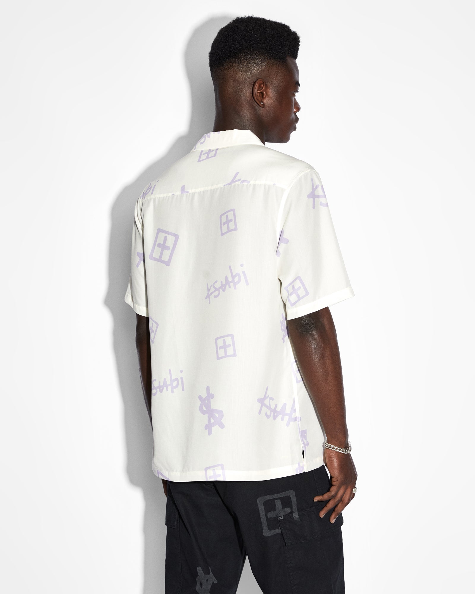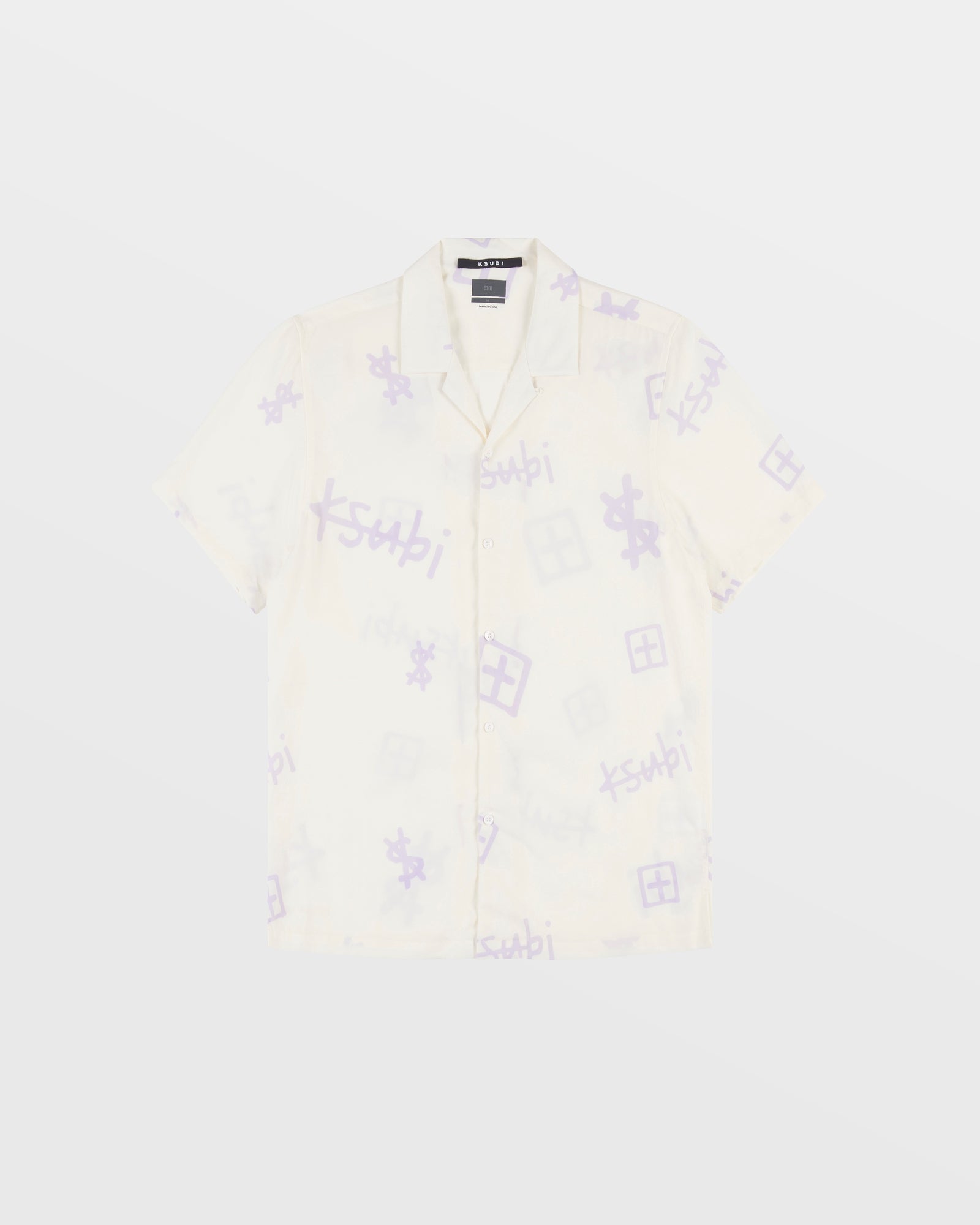 The Kash Box Resort Ss Shirt White features printed purple Ksubi text and symbols, premium branded buttons for the front closure and signature Ksubi t-box printed branding. Made from premium lyocell/linen blend, this relaxed fit top is designed with short sleeves and a step hem.