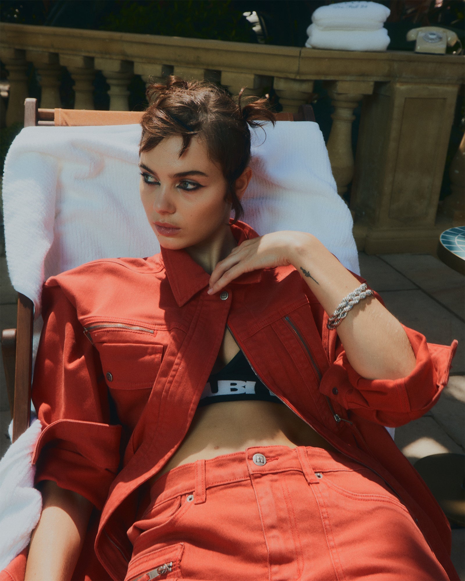 The Low Rider Mini Roasted is a washed red mini skirt with a low rise waist. This skirt features cargo pocket detailing, branded hardware with a tonal embroidered 4x4 and t-box. Designed to sit lower on the hip for a micro mini look, style back with the matching Oversized Jacket Biker Roasted.
