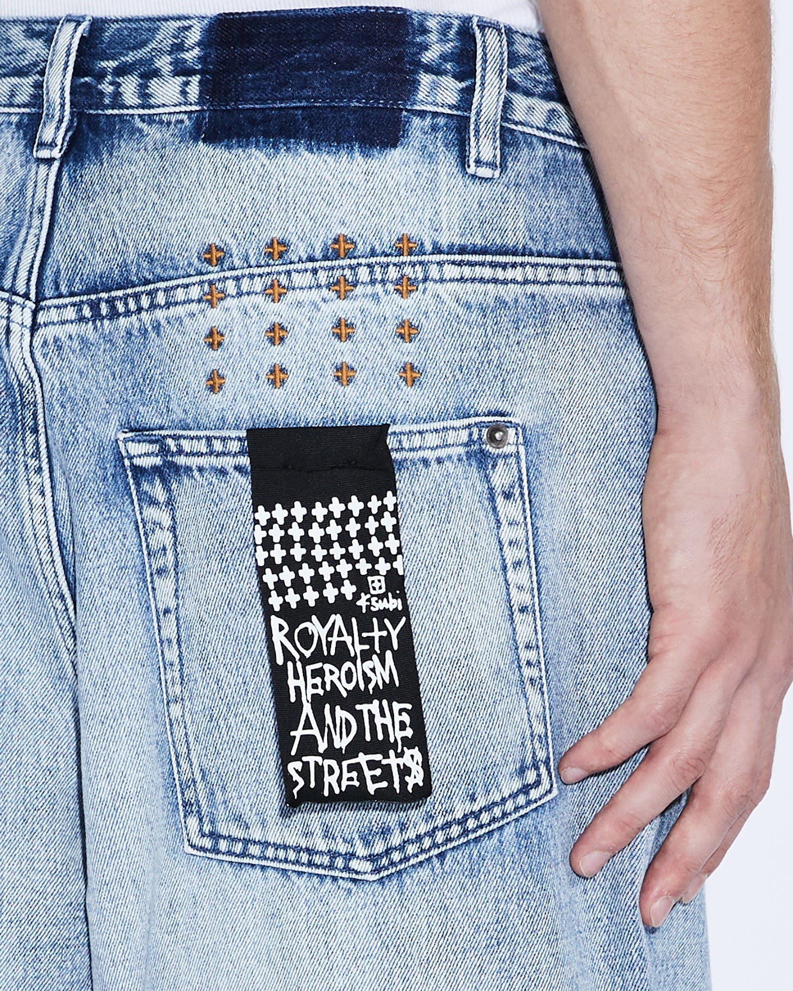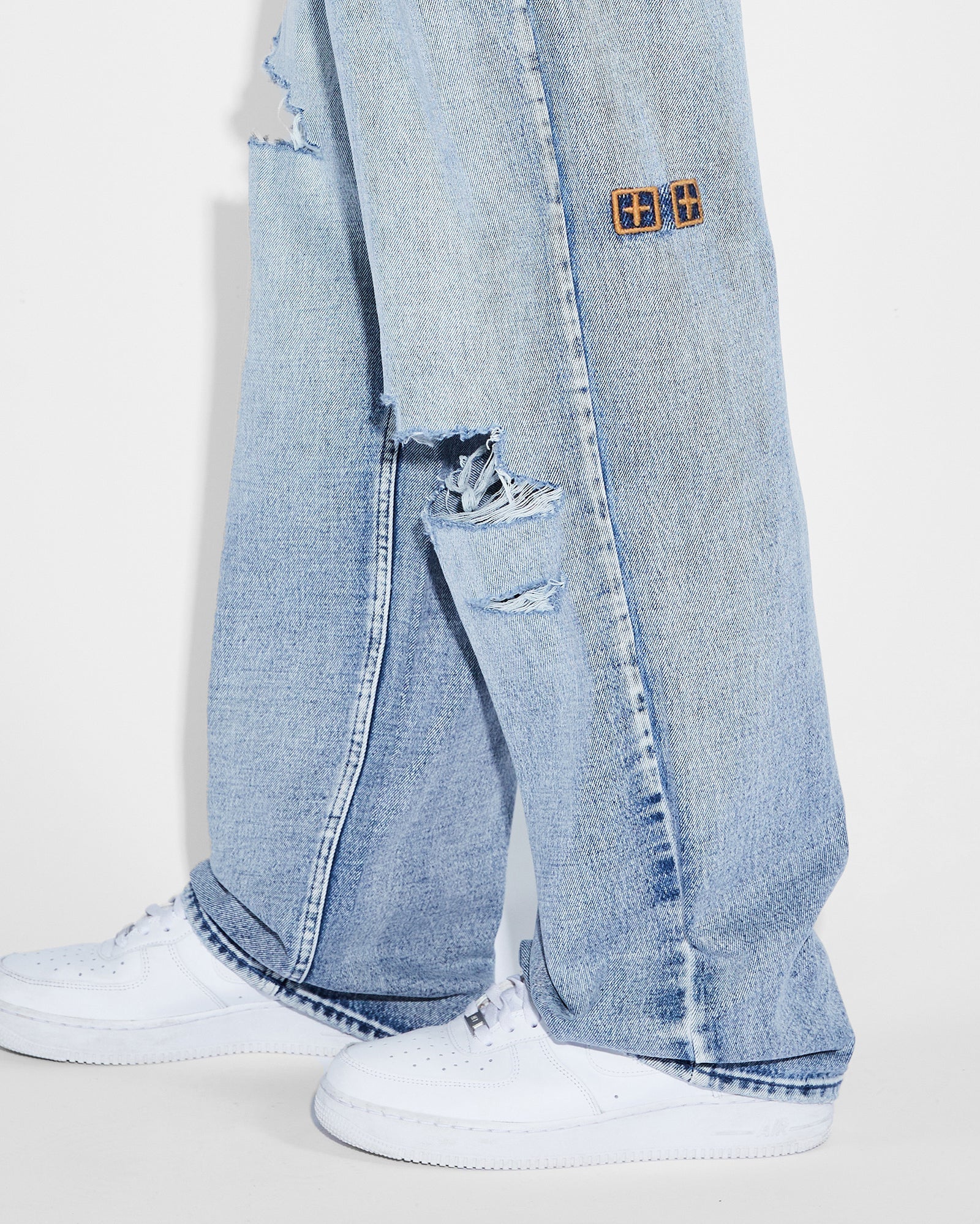 The Maxx Rekovery is an exaggerated straight leg jean with a long rise. This style is made from rigid denim in light stone wash with vintage scaring, rip and repair details with zig zag topstitching. Finished with signature t-box, 4x4 embroidery and Ksubi branded hardware.