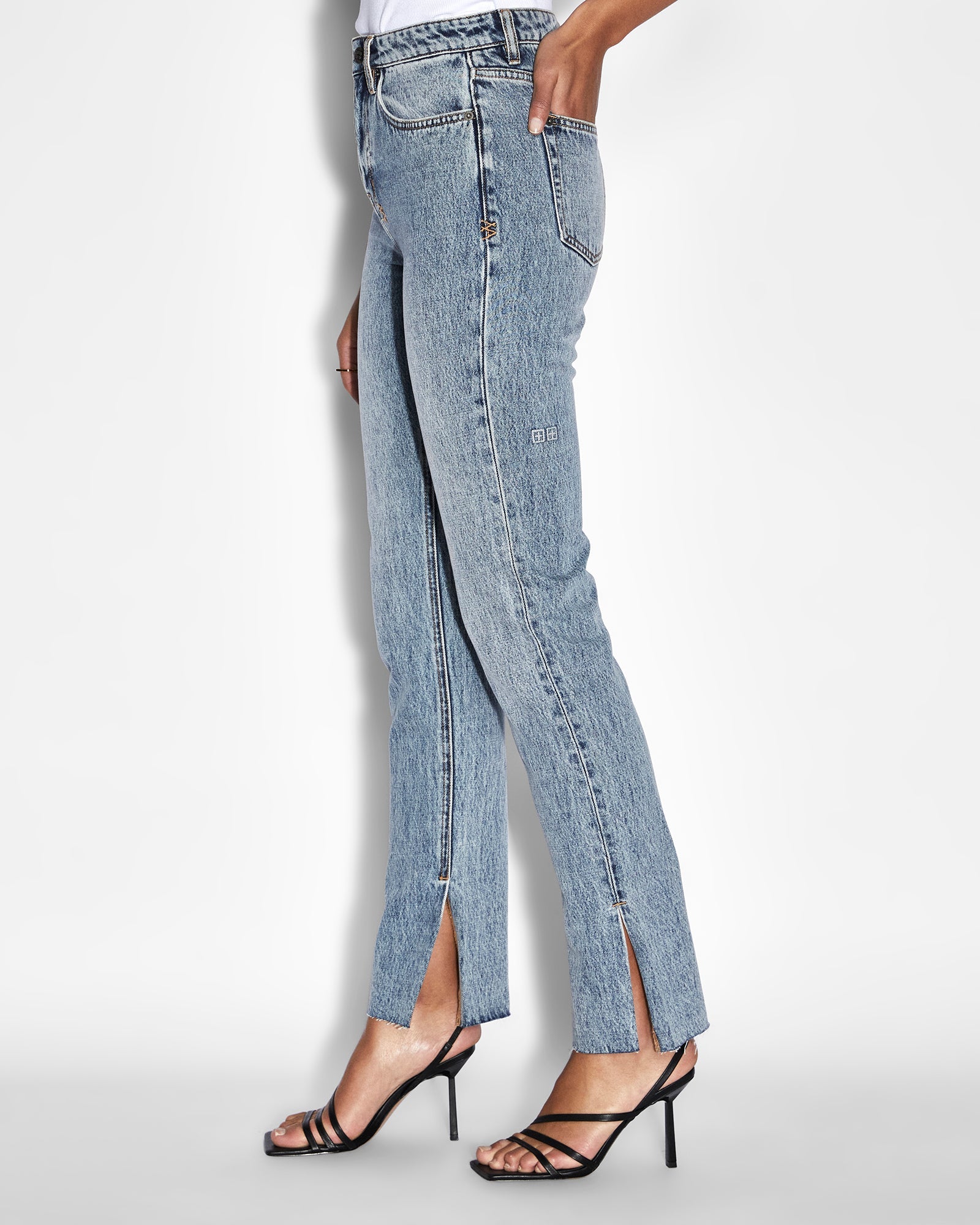 The Melrose Haven Splits is a high rise, slim cigarette fit pant detailed with hem side seam splits and Ksubi branding. Made from premium European rigid denim in washed mid blue indigo colourway with subtle contrast wear, this pant is a full length style with classic five pocket detailing and a raw-cut hem.