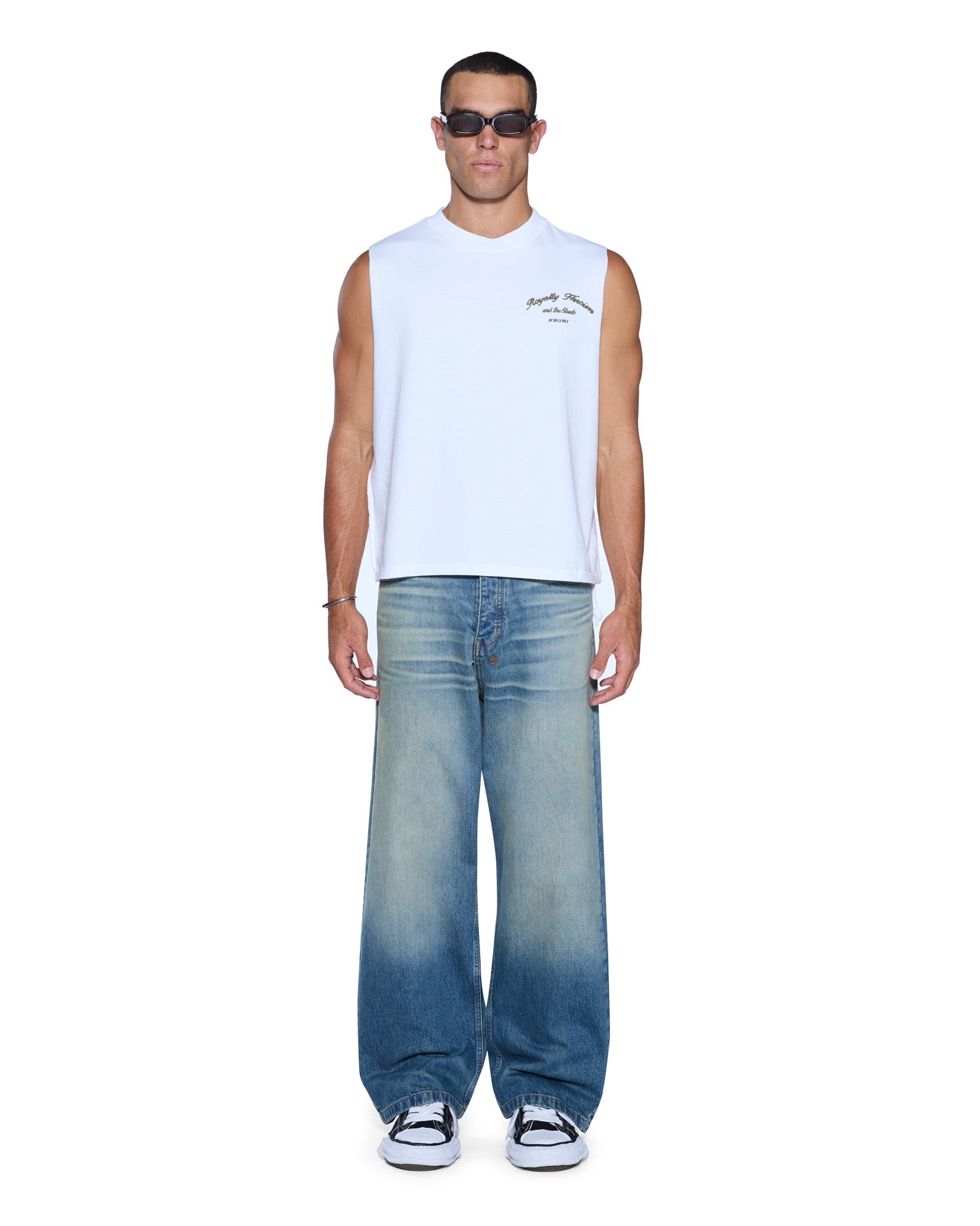 The Royalty Halen Cut Off Tru White is a boxy, oversized sleeveless tee with a waist-finishing length, exaggerated shoulder drop, reverse overlocked side seam and signature rats tail. Crafted from heavyweight cotton jersey, it features seasonal chainstitch embroidered artwork at the front and back, and is finished with signature T-box and 4x4 branding.