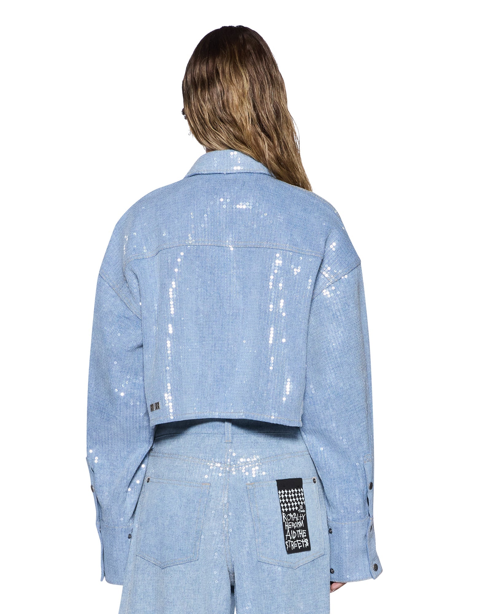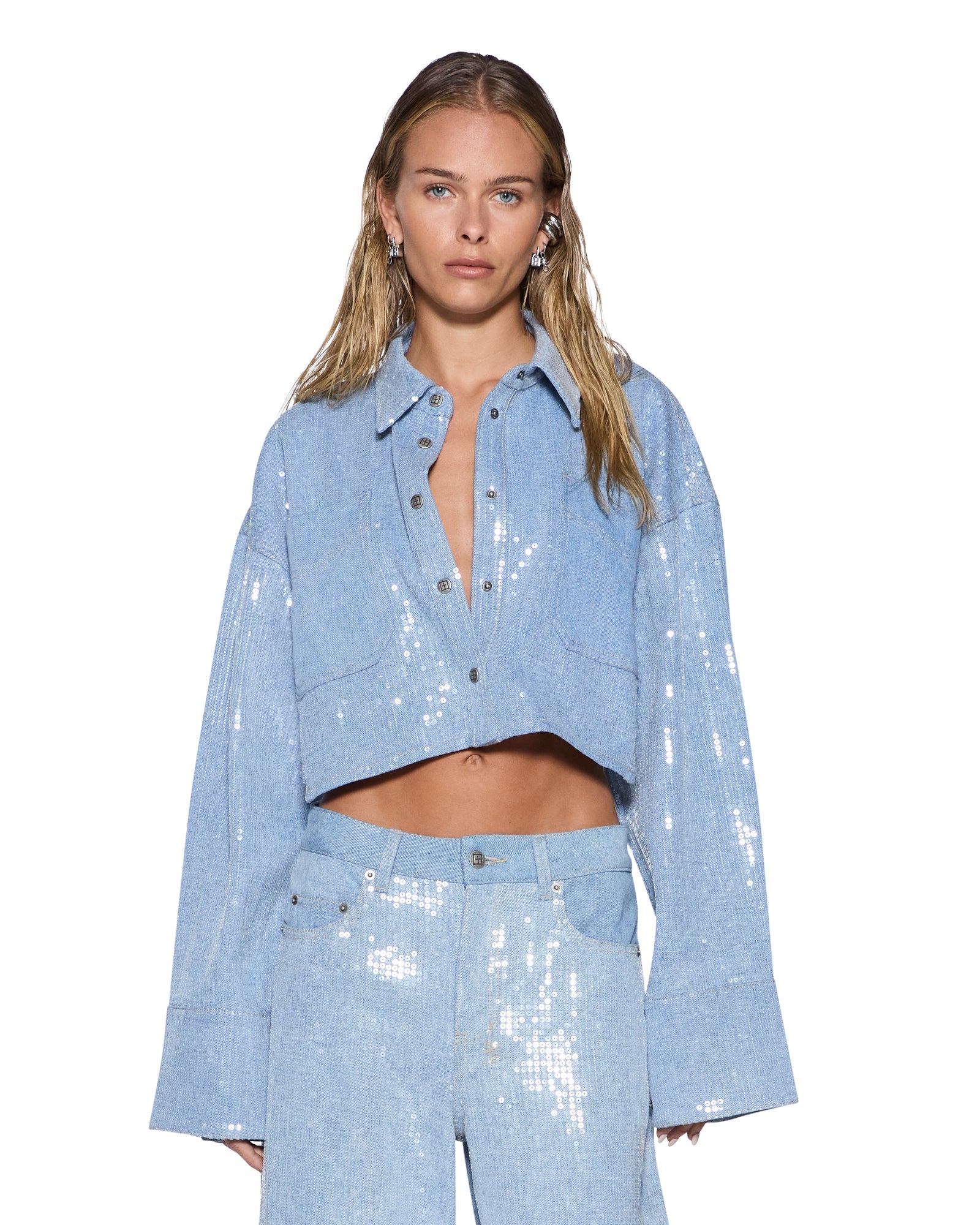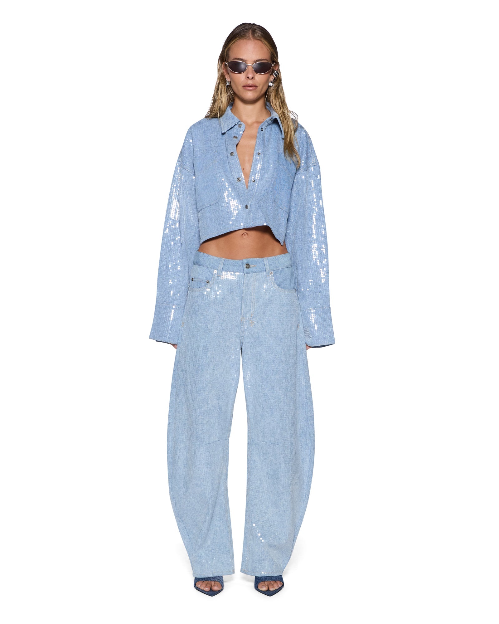 The Sequin Balter Ls Shirt Sequin Spirit Spark is an oversized button up shirt made from lightweight denim in a light blue wash, finished with all over clear sequin embellishment for an elevated party look. Designed with a cropped length, panelled twin patch pockets, a classic centre front collar and exaggerated cuffs, it is finished with Ksubi’s signature t-box embroidery. Style back with the Barrel Jean Spirit Spark for a complete look.