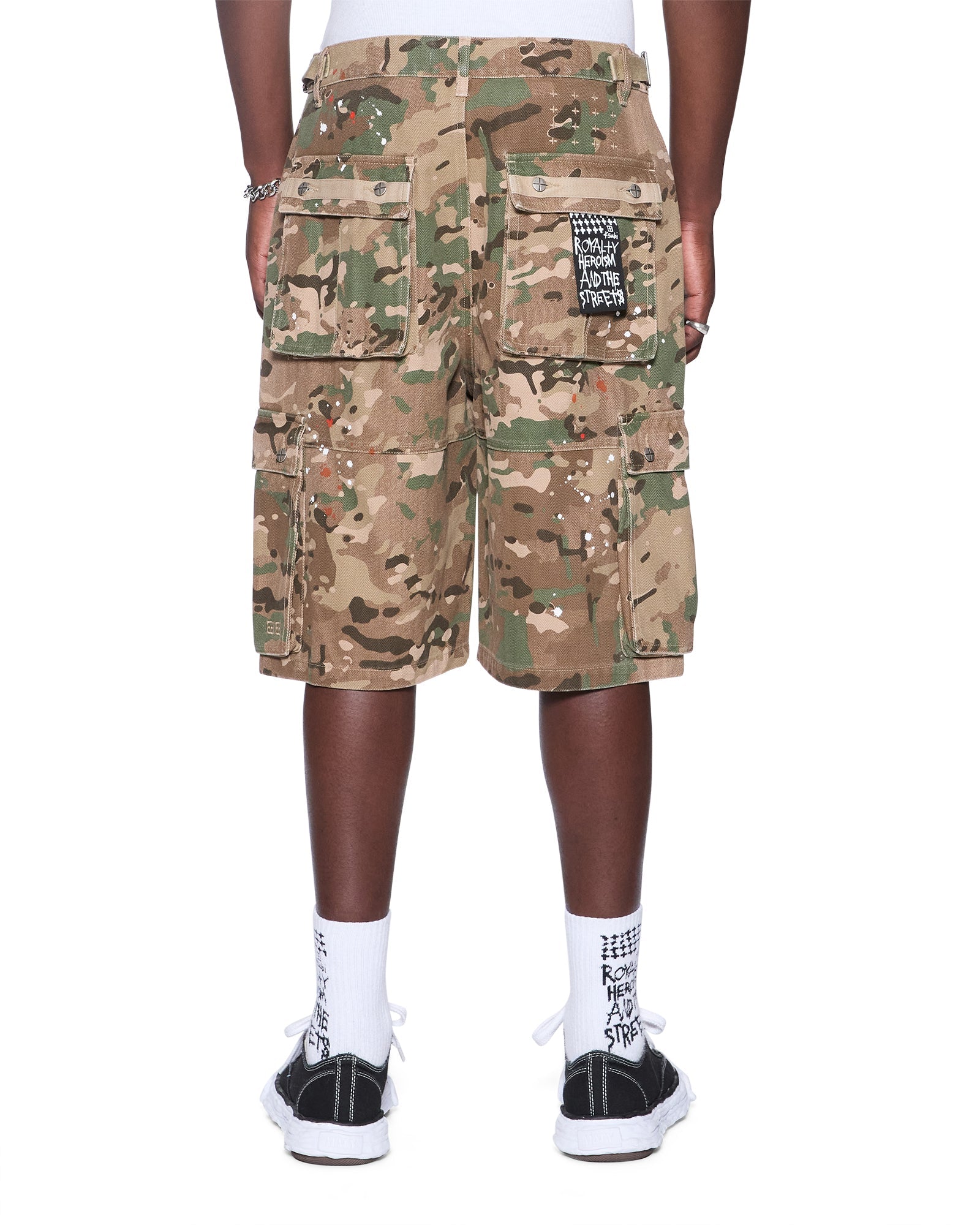 The Trooper Cargo Short Woodland is a relaxed leg cargo short featuring side bellowing cargo pockets, regular side-entry pockets and back flap pockets, crafted from cotton herringbone in a woodland camouflage with faded wash treatments. Detailed with grosgrain puller tabs at the waist, back pocket, internal waistband and side seam, it features a seasonal Ksubi embroidered patch and paint splatters, finished with signature t-box and 4x4 embroidery and Ksubi branded hardware.