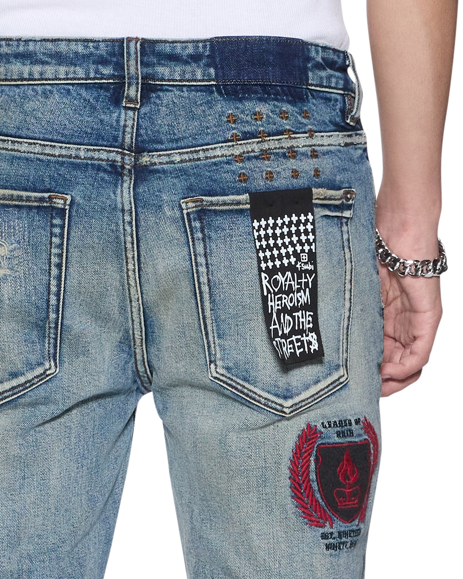 The Van Winkle Bleu Monday Repair is a mid rise five pocket full length skinny jean made from comfort stretch indigo denim in a mid-blue wash with authentic ageing treatments. Constructed with unique angled belt loops and front fly seam detail, it is embellished with seasonal and core Ksubi badges sporadically placed over the jean. Finished with t-box and 4x4 embroidery, ghost patching detailing and Ksubi branded hardware.