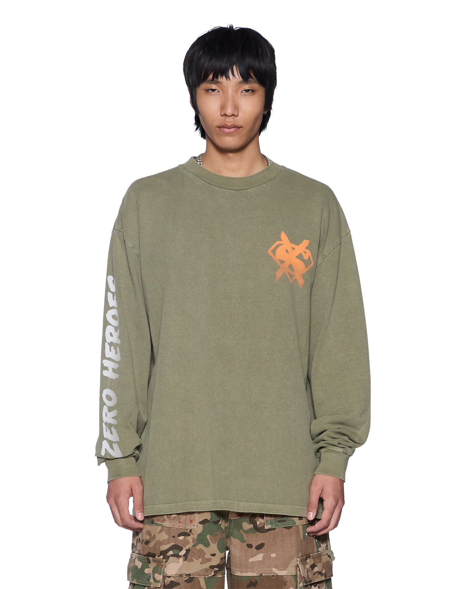 The Zero Heroes Long Sleeve Tee Militant is an oversized fit t-shirt featuring a raw-cut back hem, reverse overlocked side seams, triangle rib inset and signature rats tail, crafted from premium cotton jersey garment dyed militant green with an aged wash. Designed with seasonal artwork at the front and back, it is finished with signature t-box and 4x4 branding.